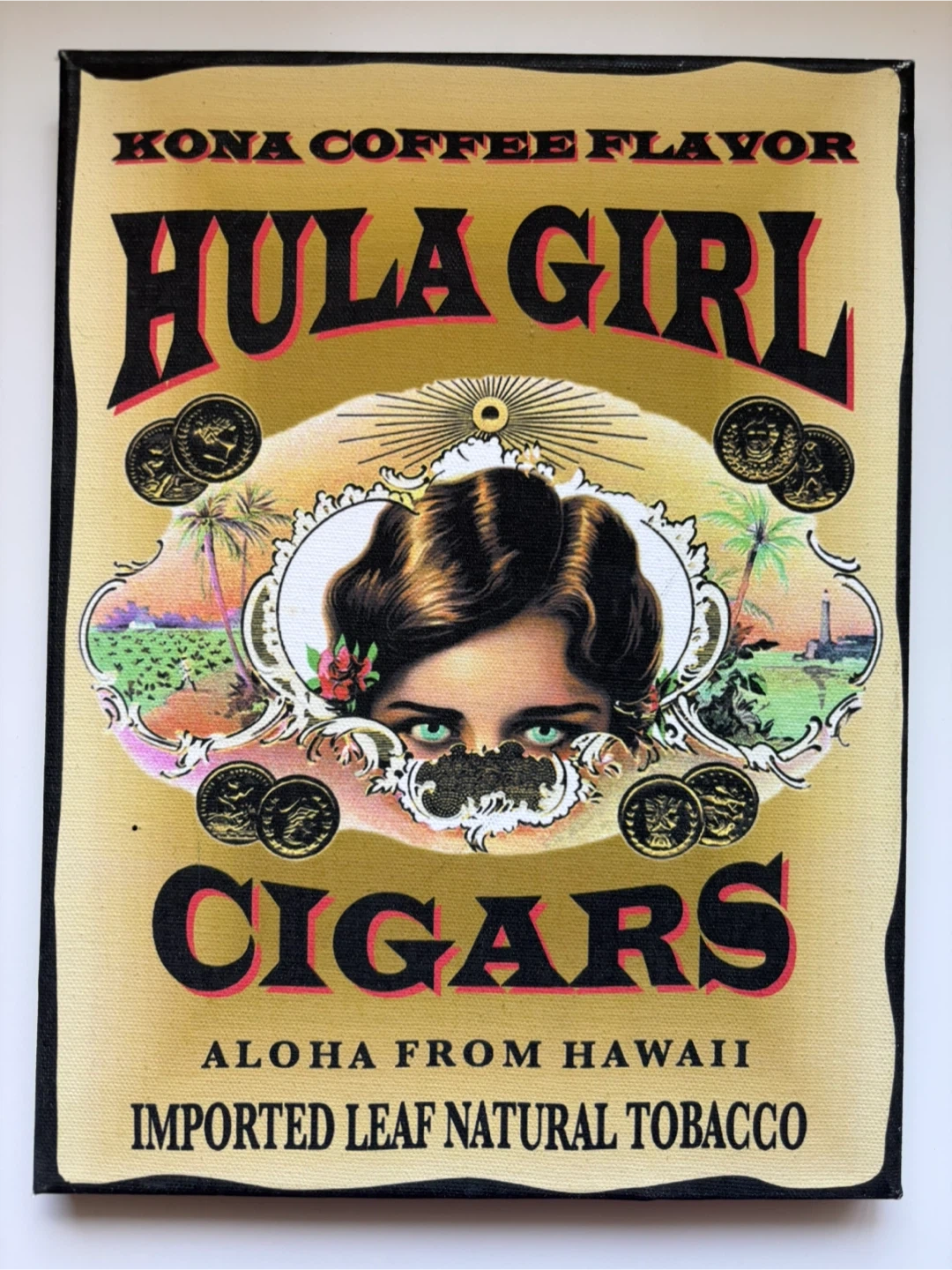This is a canvas art piece featuring a vintage-style design with the words "Hula Girl Cigars Aloha From Hawaii" printed on it. It has a tan background with black and red lettering, and a central image of a woman. The canvas is stretched over a wooden frame, and there's a metal hanger on the back for easy mounting. It measures approximately 10 inches by 12 inches.
