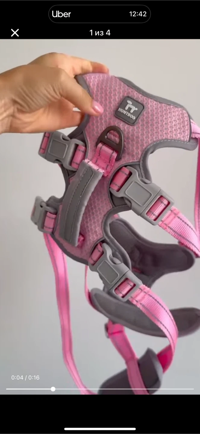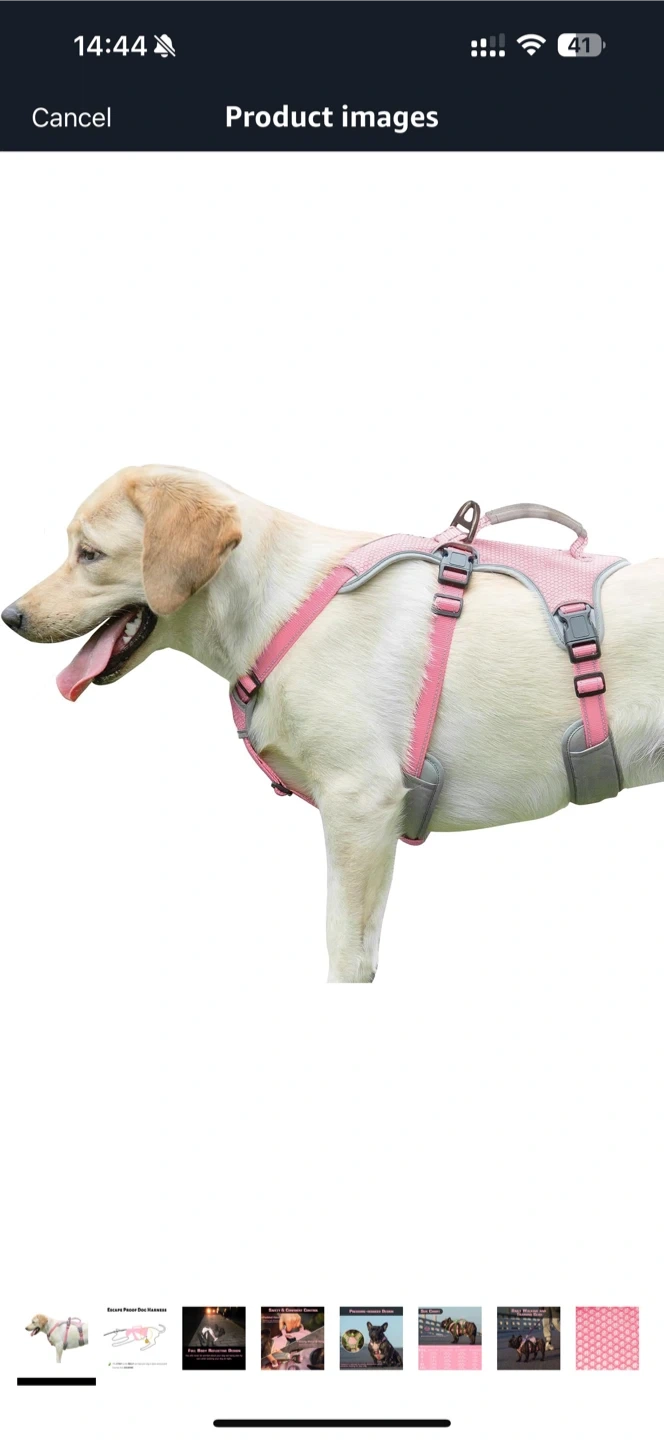 Looking to sell this HUNTCOO dog harness in pink. It's a size large. The harness features a padded handle for safety and confident control, and a strong metal D-ring for leash attachment. It's designed for better leash control and is safer for walking your dog. Perfect for your furry friend!