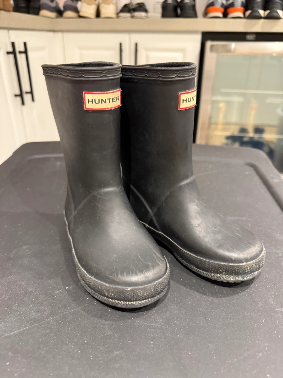 Selling a pair of Hunter Kids First Classic rain boots in black. They are in good condition and ready for some puddle jumping! Perfect for keeping little feet dry during rainy days. Size 9