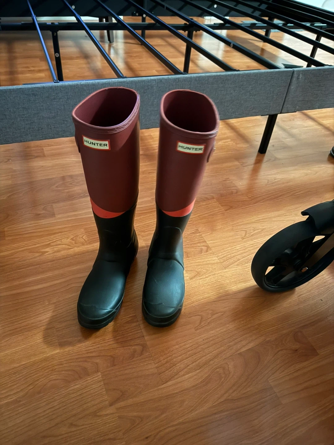 Selling a pair of Hunter rain boots. They're in good condition and ready to keep your feet dry on those rainy days! The colour is a nice dark red and black.