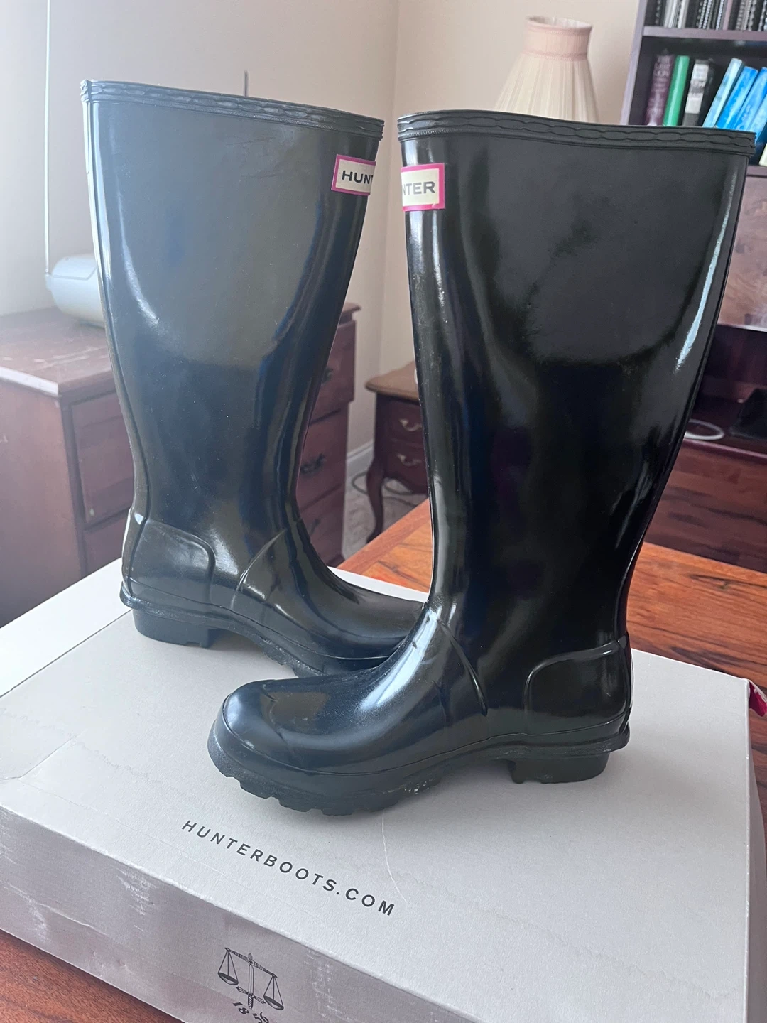 Selling a pair of Hunter Original Tall Gloss Rain Boots in women's size 5. They are in great condition and come with the original box. Perfect for rainy days or adding a stylish touch to your outfit! The boots are a sleek black colour and made of durable, waterproof material. ββ- ** used only twice during my trip to bamfield on rainy weather **is still available as long post is up **Cash only ββ- πPick up location: Park royal mall - near lablows