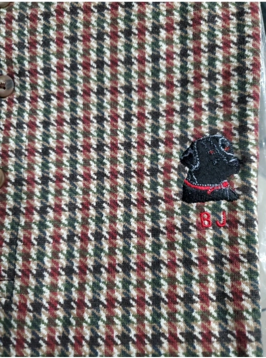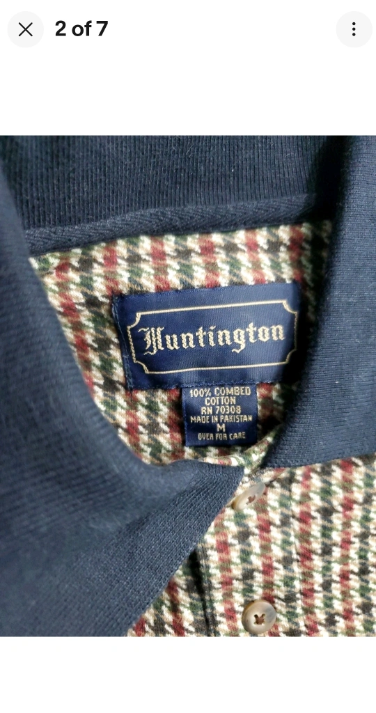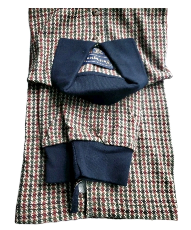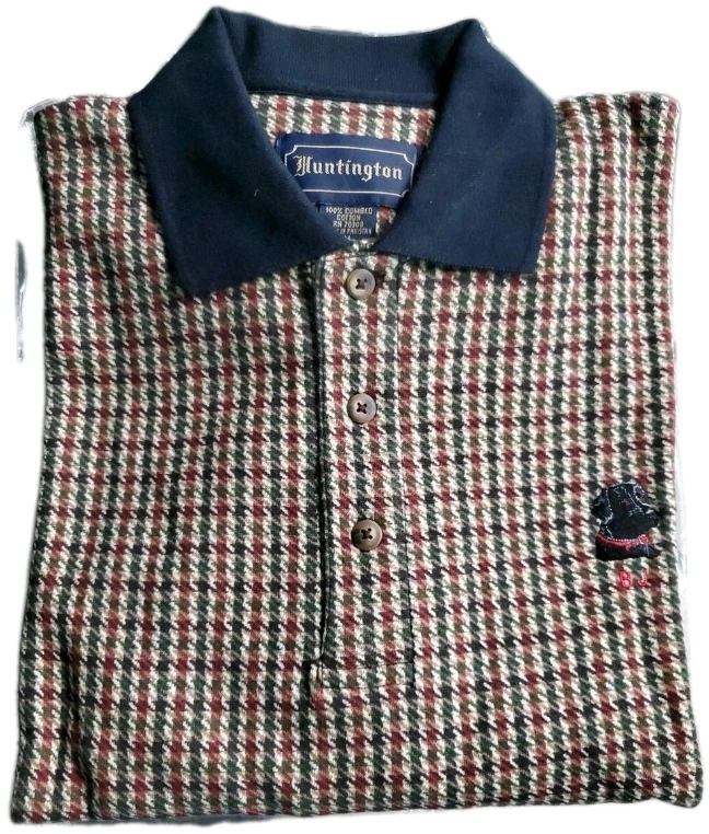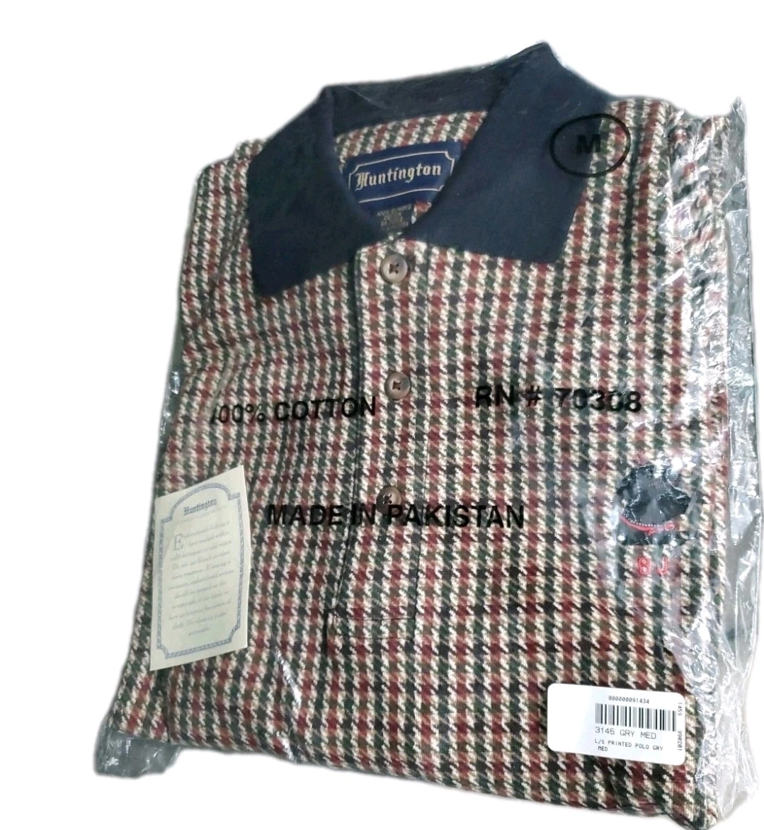 Here's a brand new Huntington polo shirt, still in its original packaging! It features a classic houndstooth pattern with a navy blue collar and cuffs. The shirt is made from 100% combed cotton and is a size medium. There's even a cute little dog embroidery on the chest!