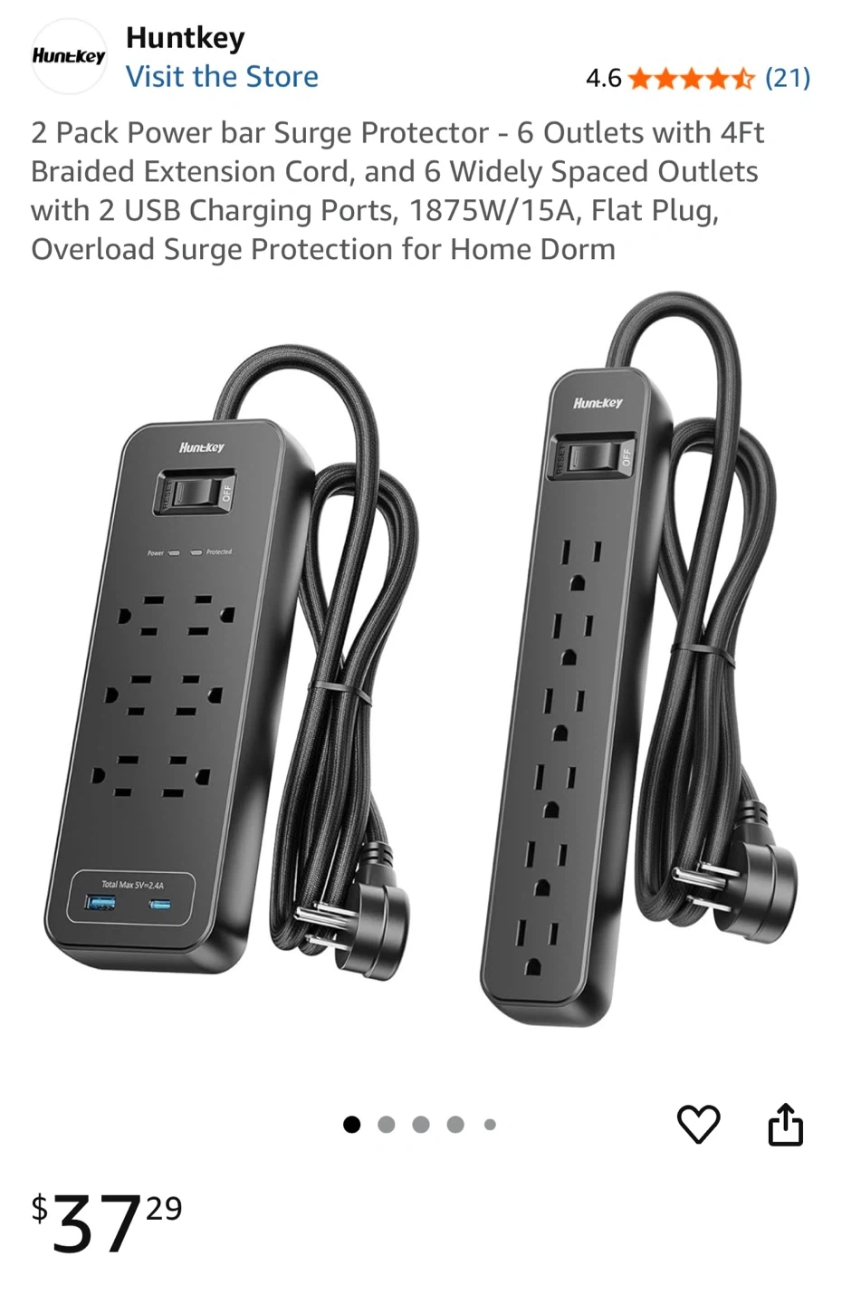 Selling a 2-pack of Huntkey power bar surge protectors. They each have 6 outlets and a 4ft braided extension cord. There are also 2 USB charging ports. They're rated for 1875W/15A and have overload surge protection. Originally bought for $37.29