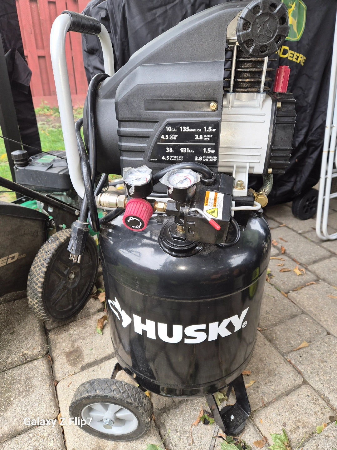 Selling a Husky 10-gallon portable air compressor. It features a 135 max PSI and 3.8 SCFM at 90 PSI. Great for various tasks around the house or in the garage!