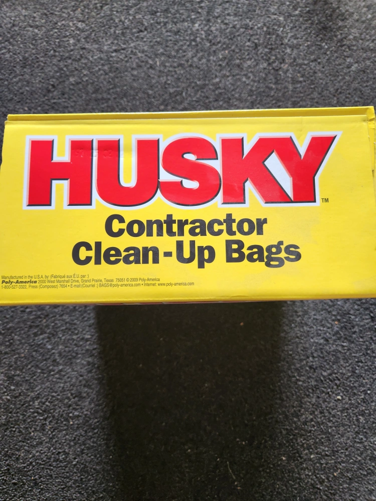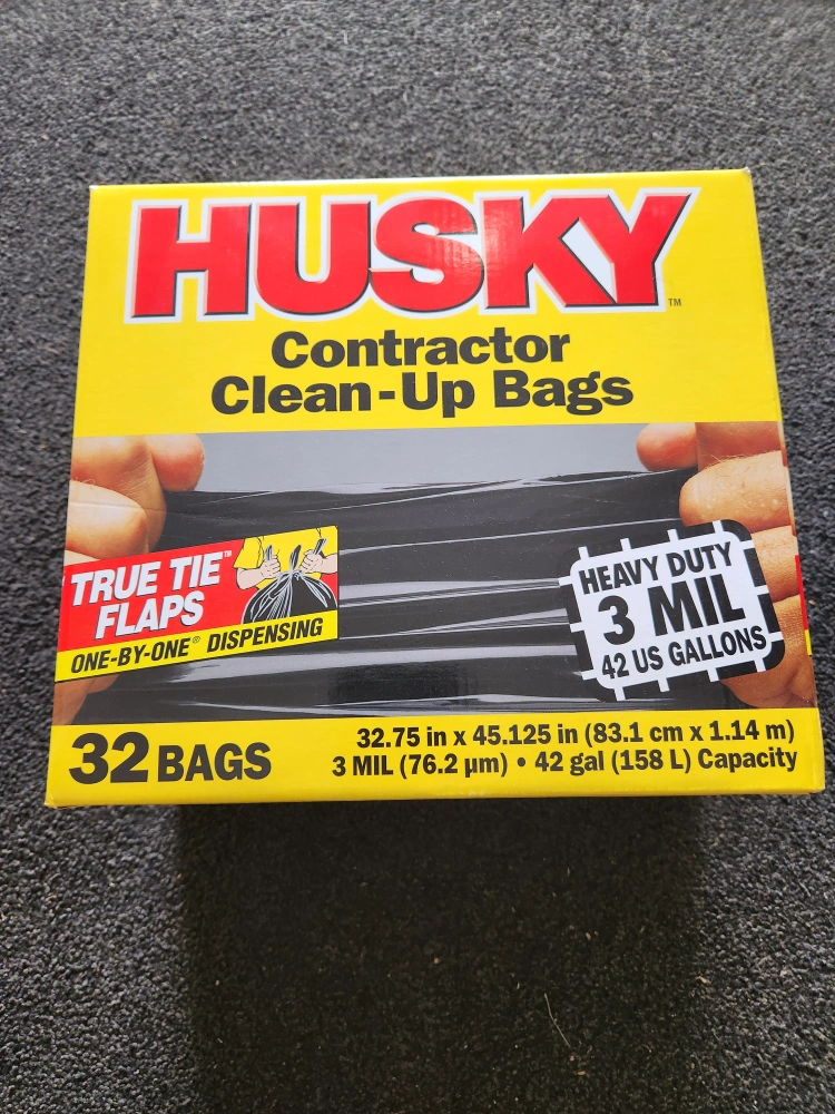 Selling a box of Husky Contractor Clean-Up Bags! They are heavy duty, 3 mil thick, and have a 42 US gallon (158 L) capacity. There are 32 bags in the box, each measuring 32.75 in x 45.125 in (83.1 cm x 1.14 m)