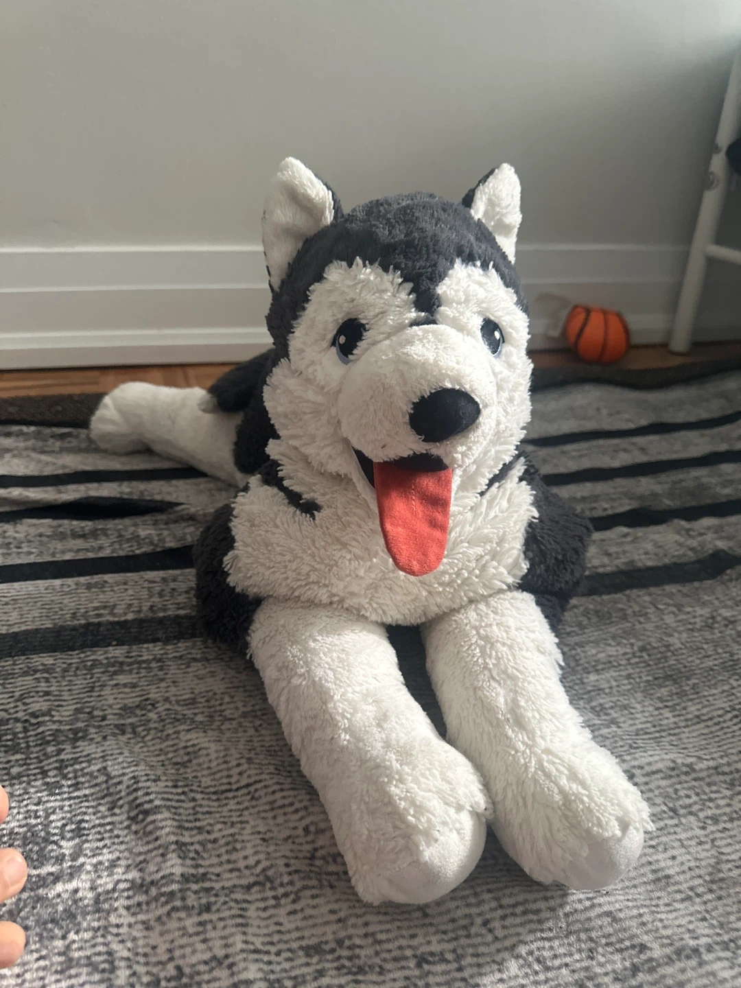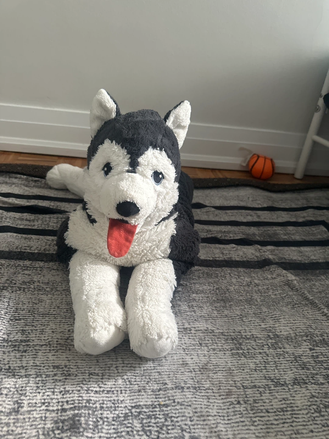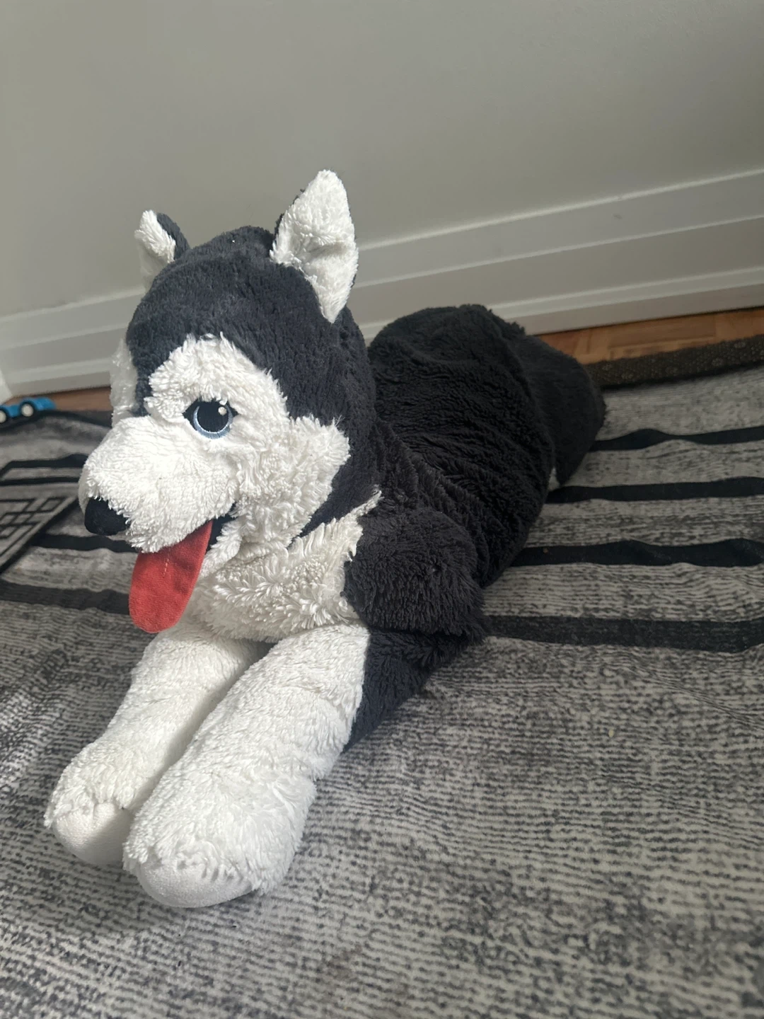 A cuddly husky plush toy looking for a new home! It's in great shape and ready for lots of love and hugs