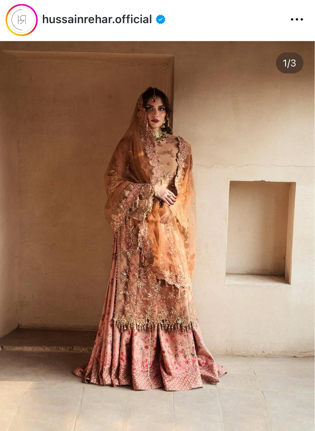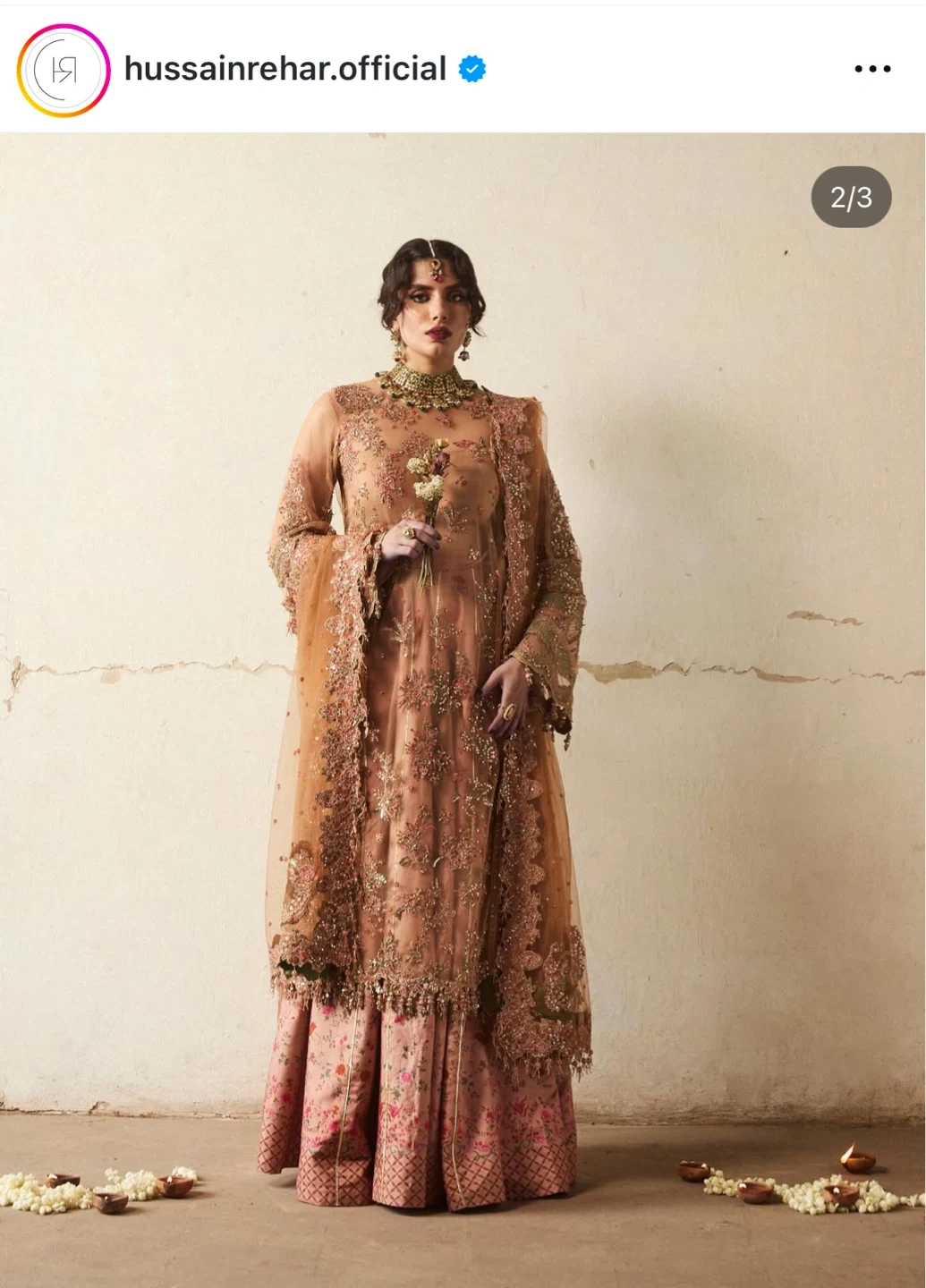 This beige net shirt, exquisitely embroidered and embellished, offers a delicate and ethereal allure. It's elegantly paired with a floral-printed Korean raw silk-paneled sharara, which adds graceful volume and elevates the overall aesthetic. The net dupatta, adorned with intricate embroidery, four-sided borders, and corner motifs, imparts a touch of sophistication and intricate detail. Together, these elements create a stunning ensemble that epitomizes timeless elegance and refined charm. This is original Hussain rehar stitched dress in size medium to large same as show in the picture.