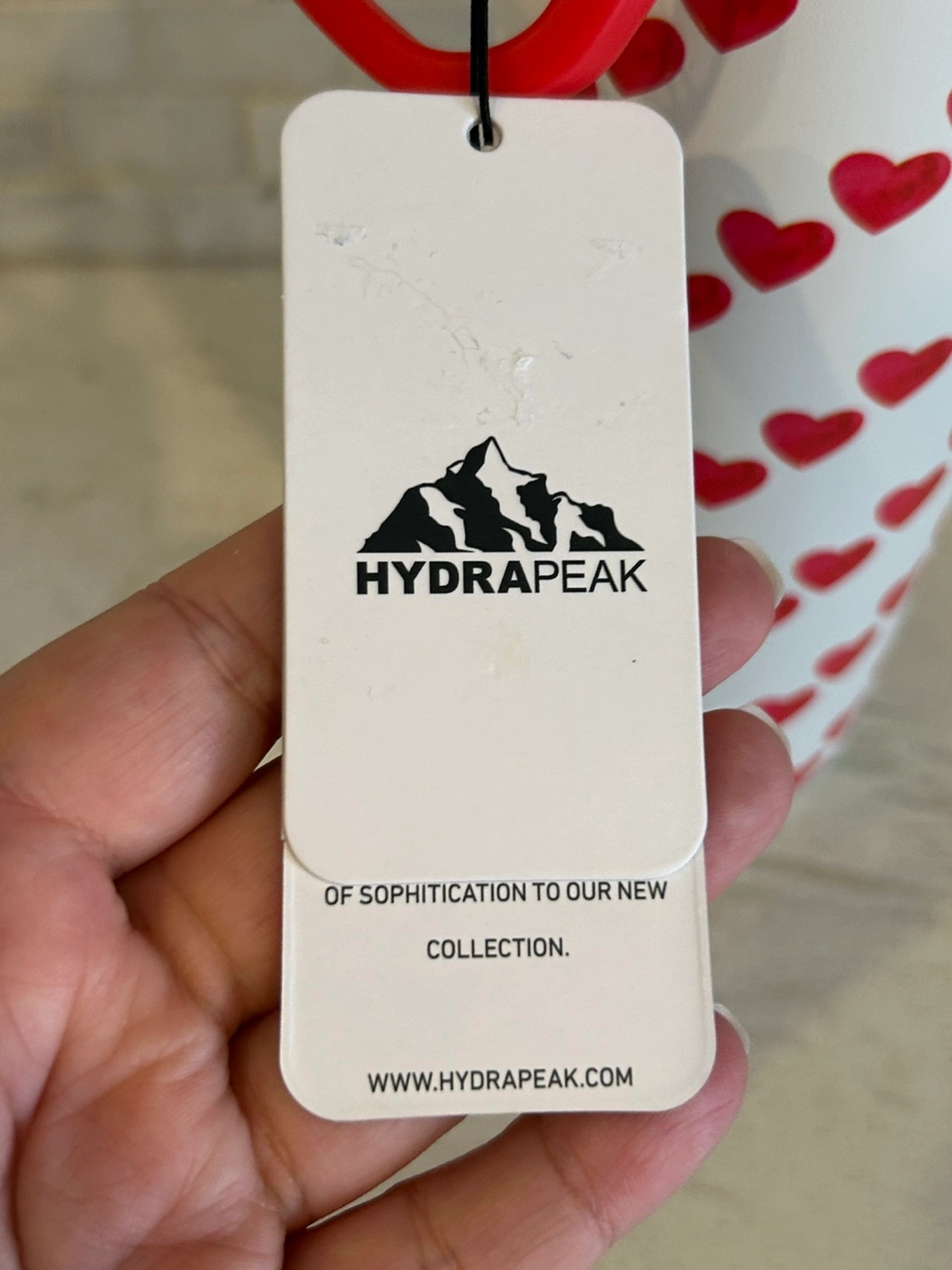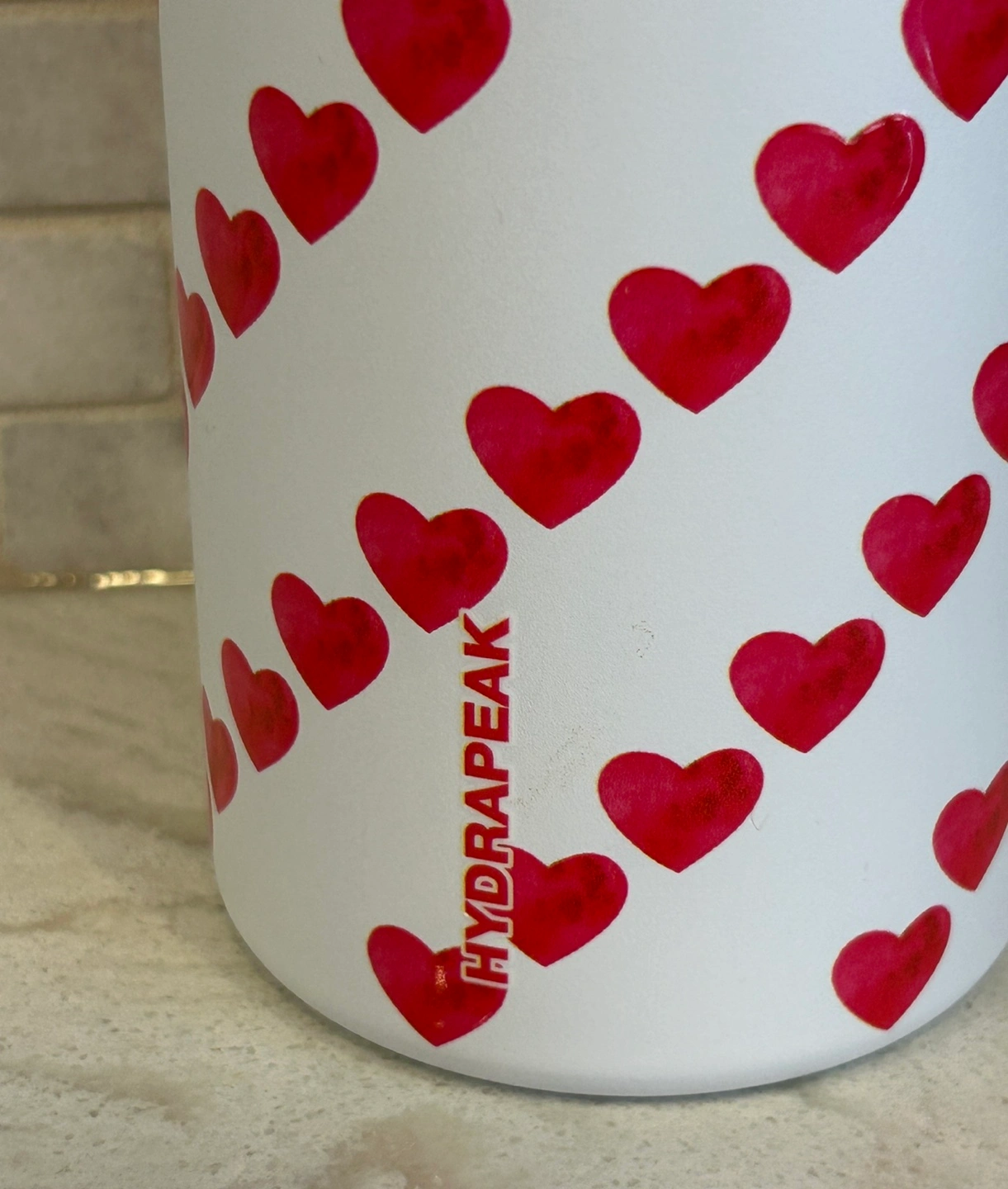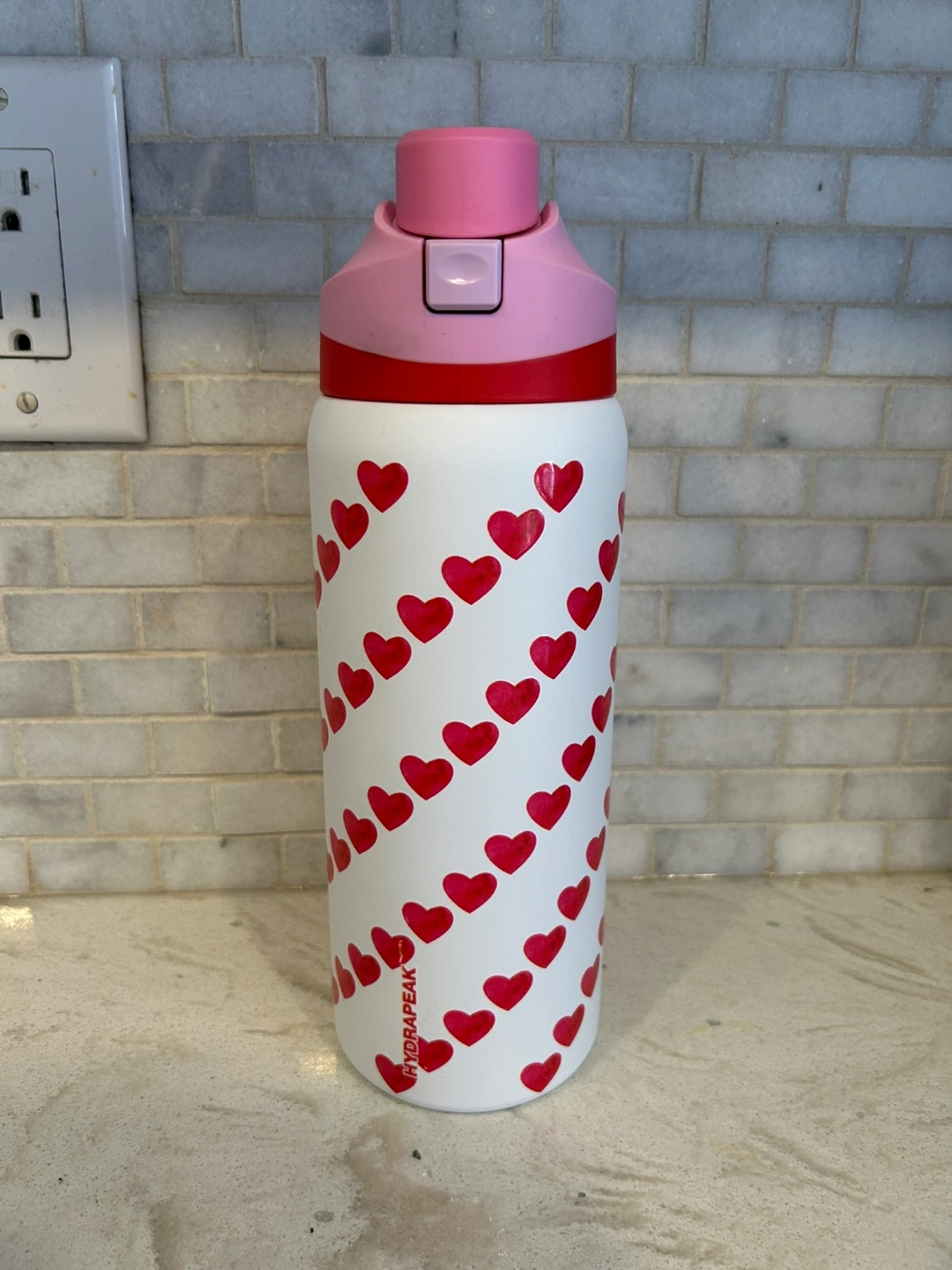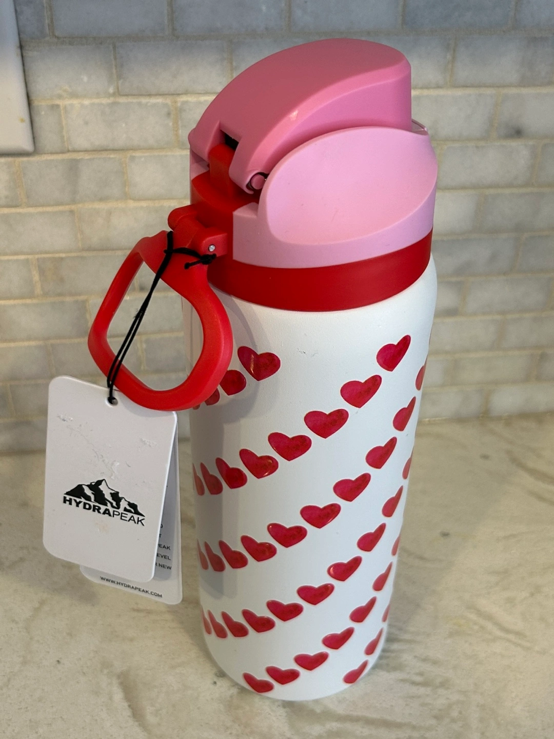 Hydrapeak water bottle. Features a fun hearts pattern. Pink and red accents. Insulated. Leakproof lid. Carry loop. Brand new.