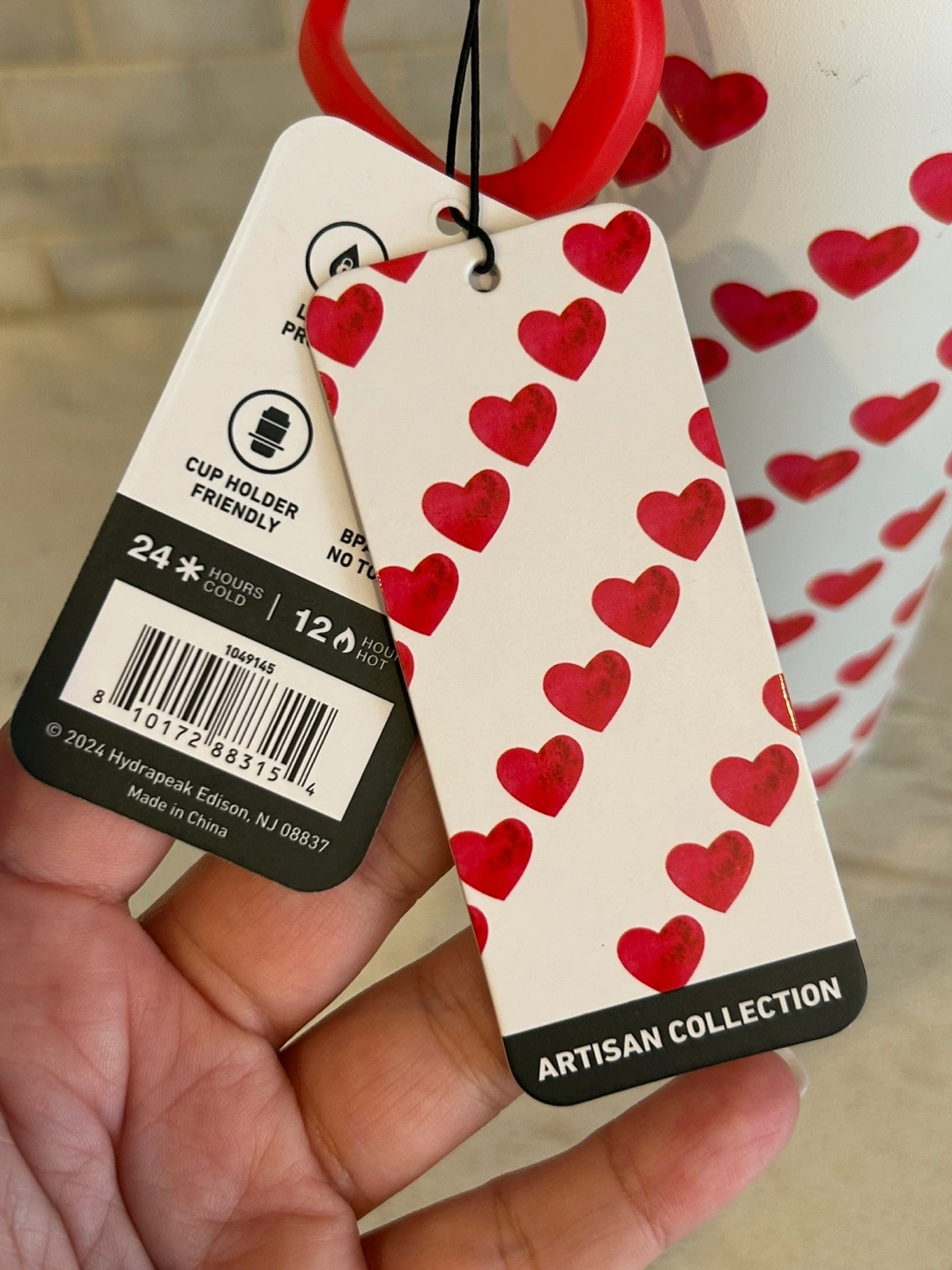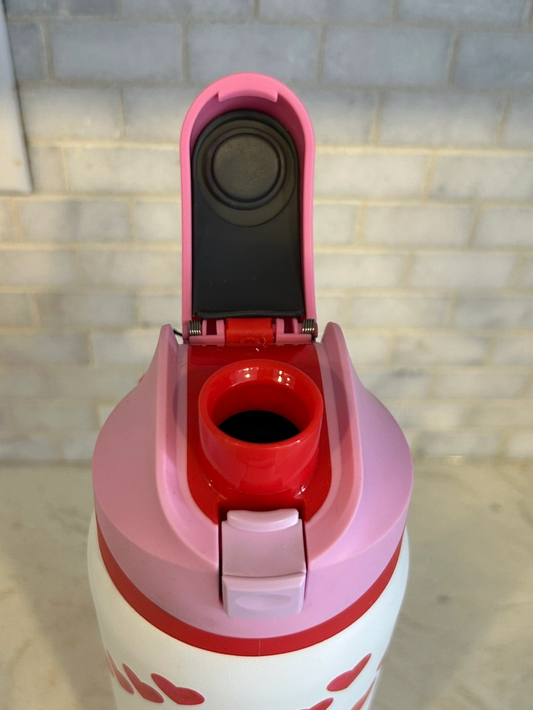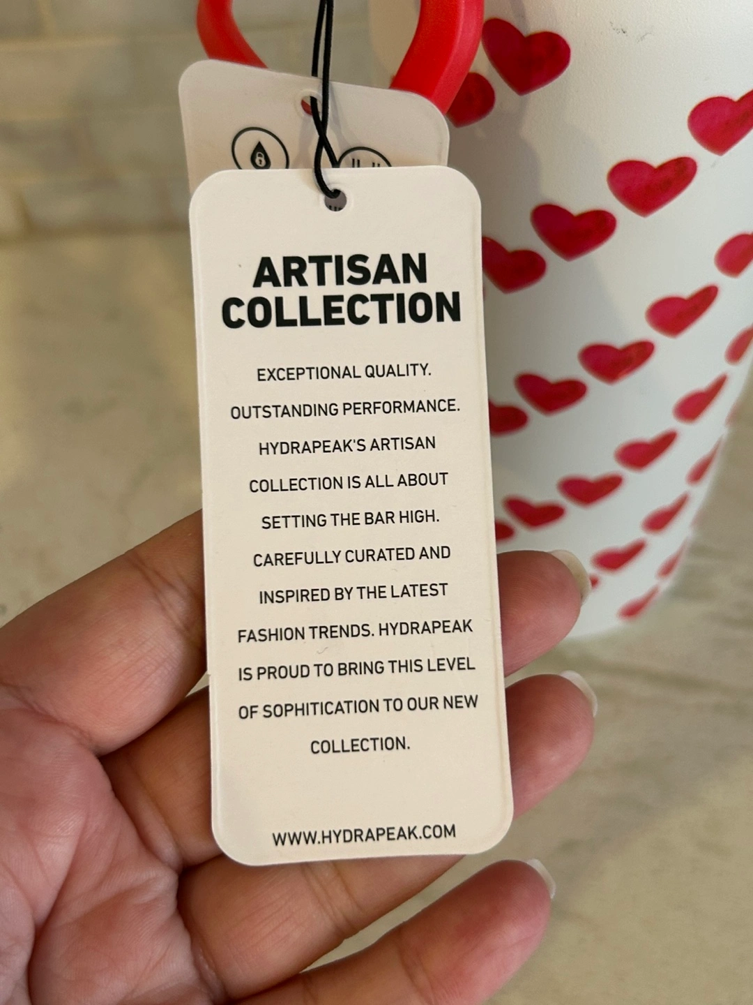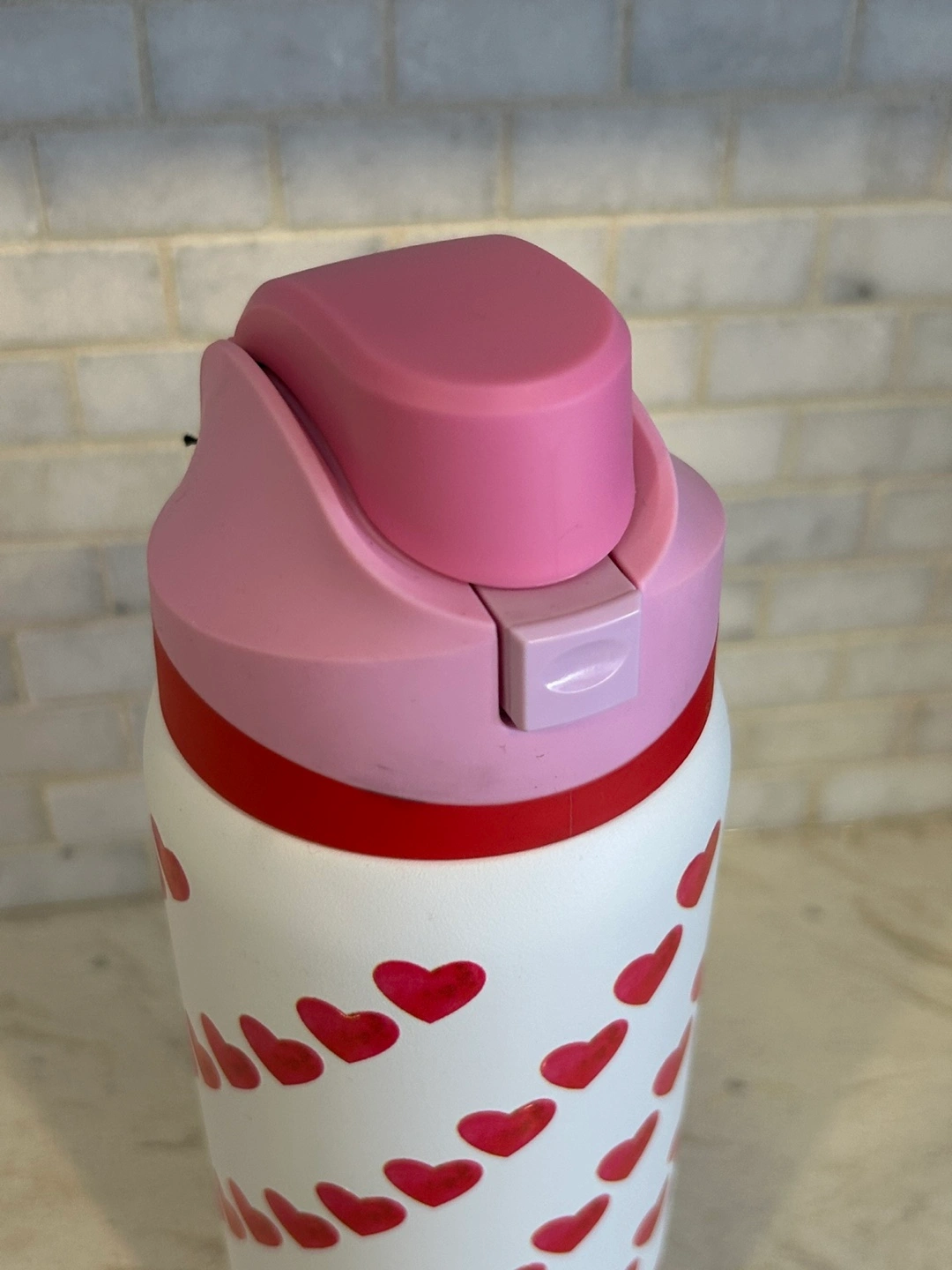Hydrapeak water bottle. Features a fun hearts pattern. Pink and red accents. Insulated. Leakproof lid. Carry loop. Brand new.