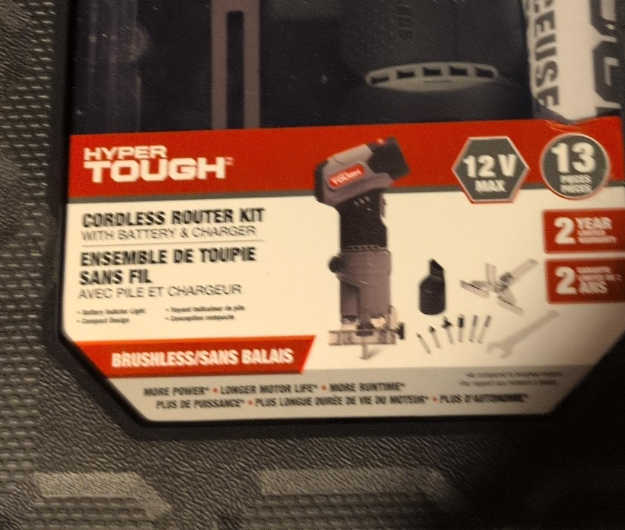 Selling a brand new Hyper Tough Cordless Router Kit. It comes with a battery and charger. This is a 12V max power tool with 13 pieces included. It features a brushless design for more power, longer motor life, and more runtime!