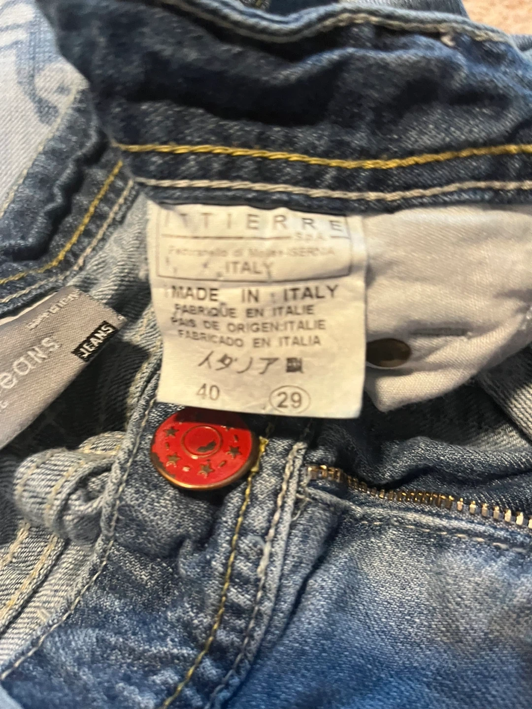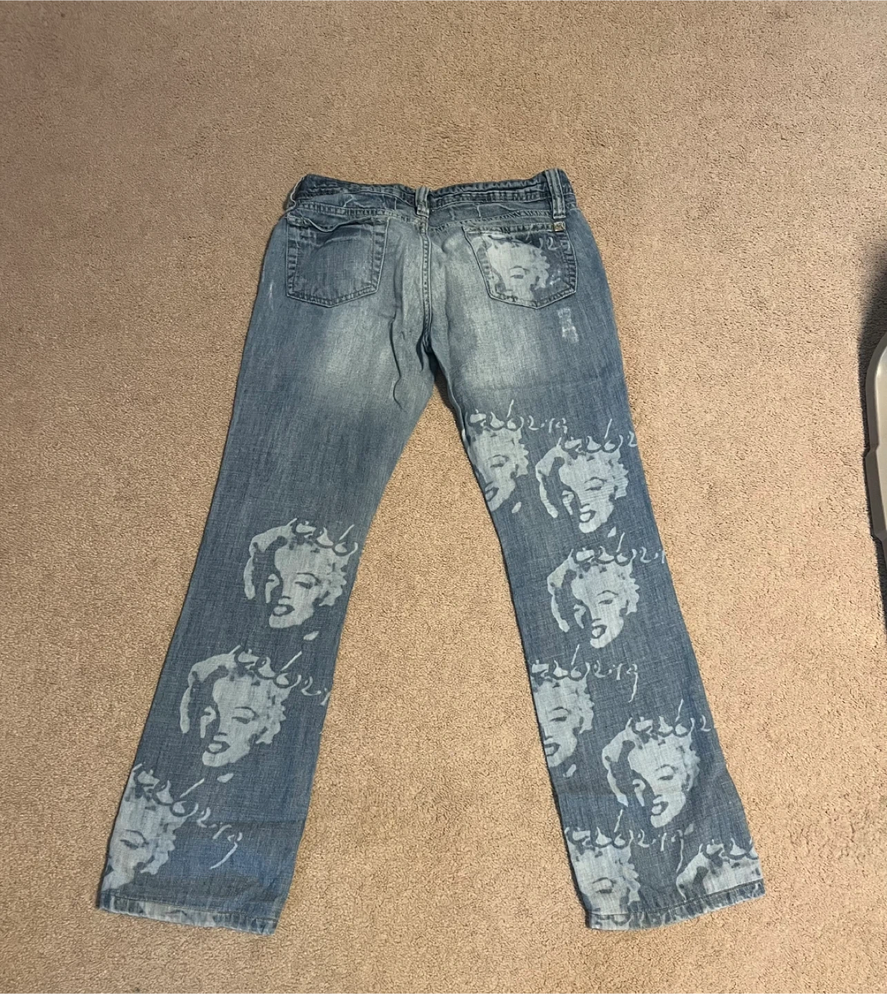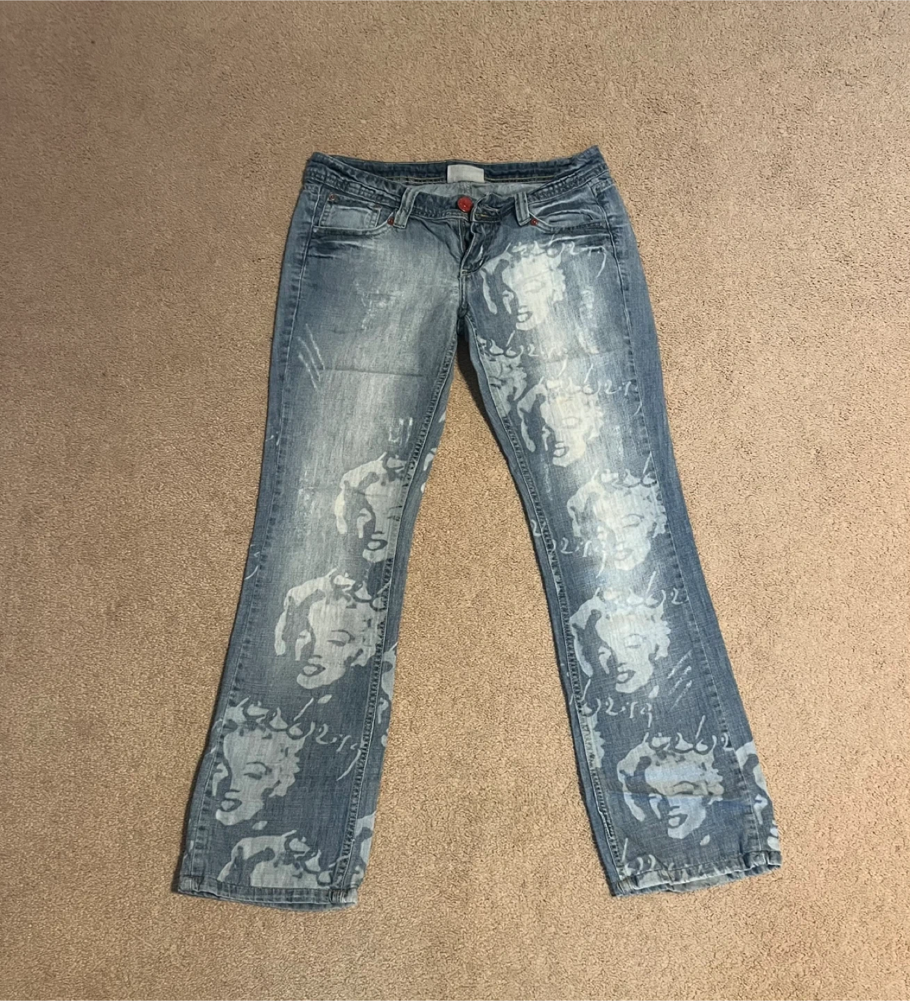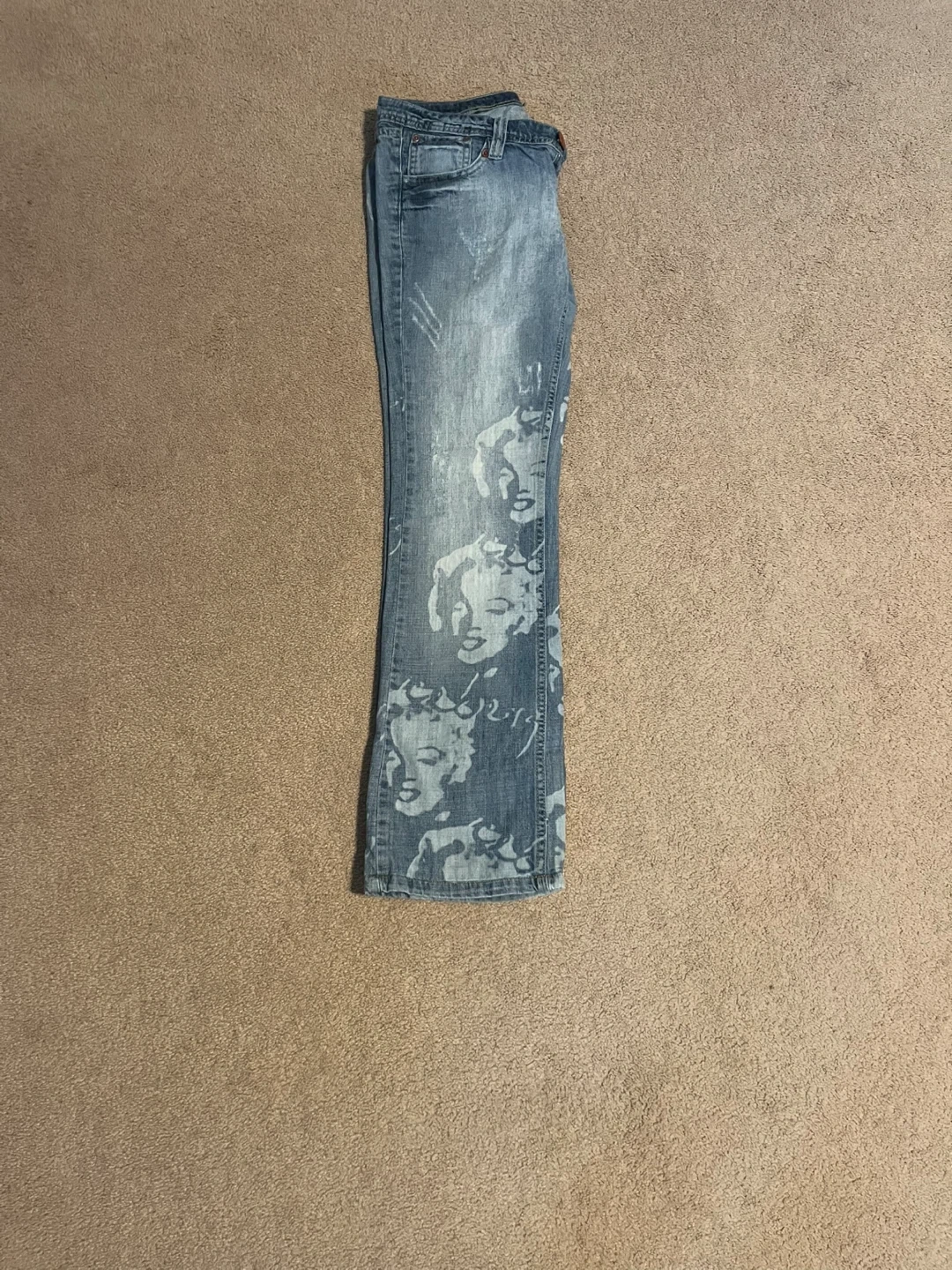Selling a pair of Ice Jeans Tierre jeans with a Marilyn Monroe design. They are a size 29 and made in Italy. These jeans have a unique and eye-catching design!