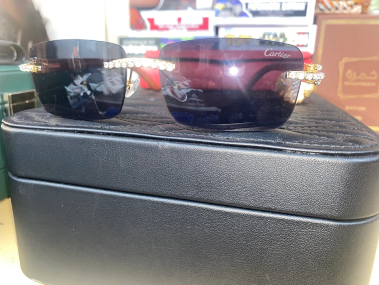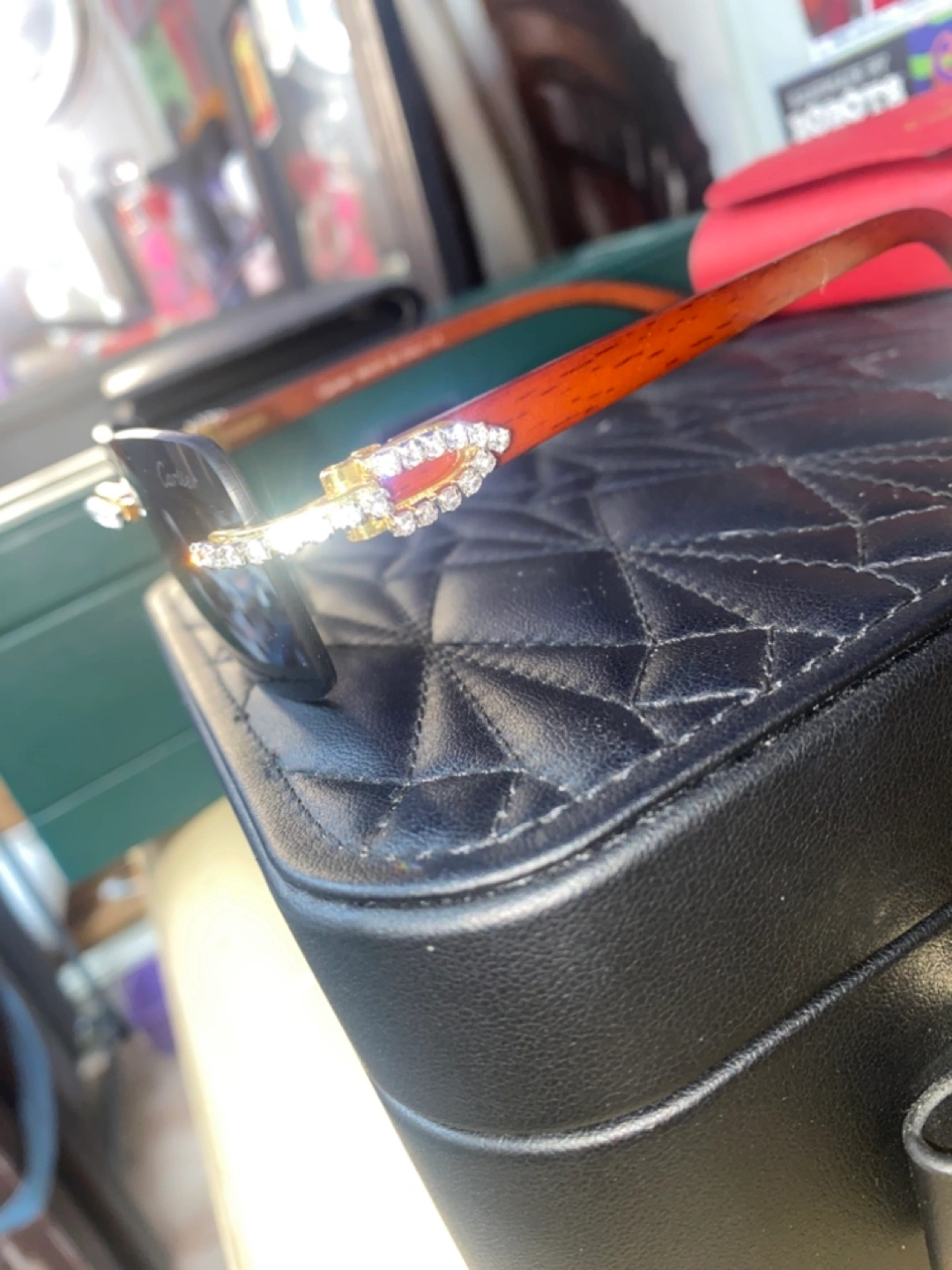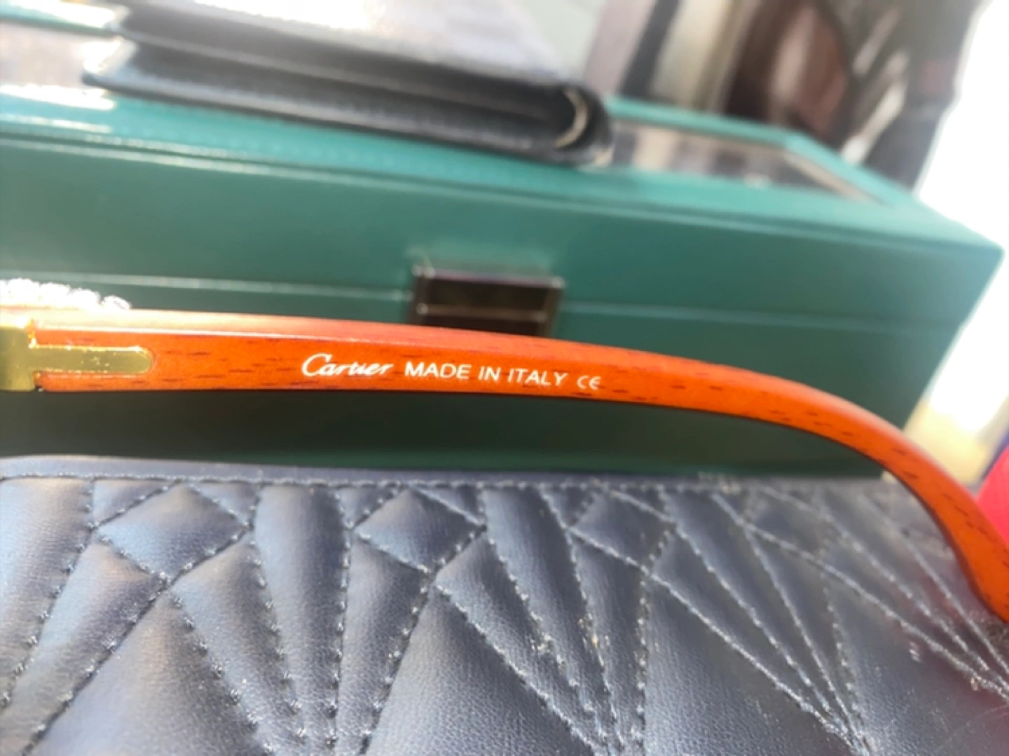 Selling a pair of Cartier sunglasses. They have a wood-like finish The frames have some ice