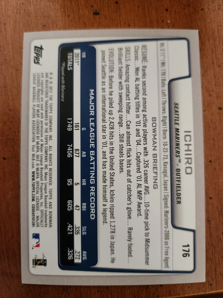 Selling an Ichiro Suzuki baseball card featuring him as an outfielder for the Seattle Mariners. The card is from the Bowman Briefing series. It highlights his impressive career stats, including his batting average and RBI. A great addition for any baseball card collector!
