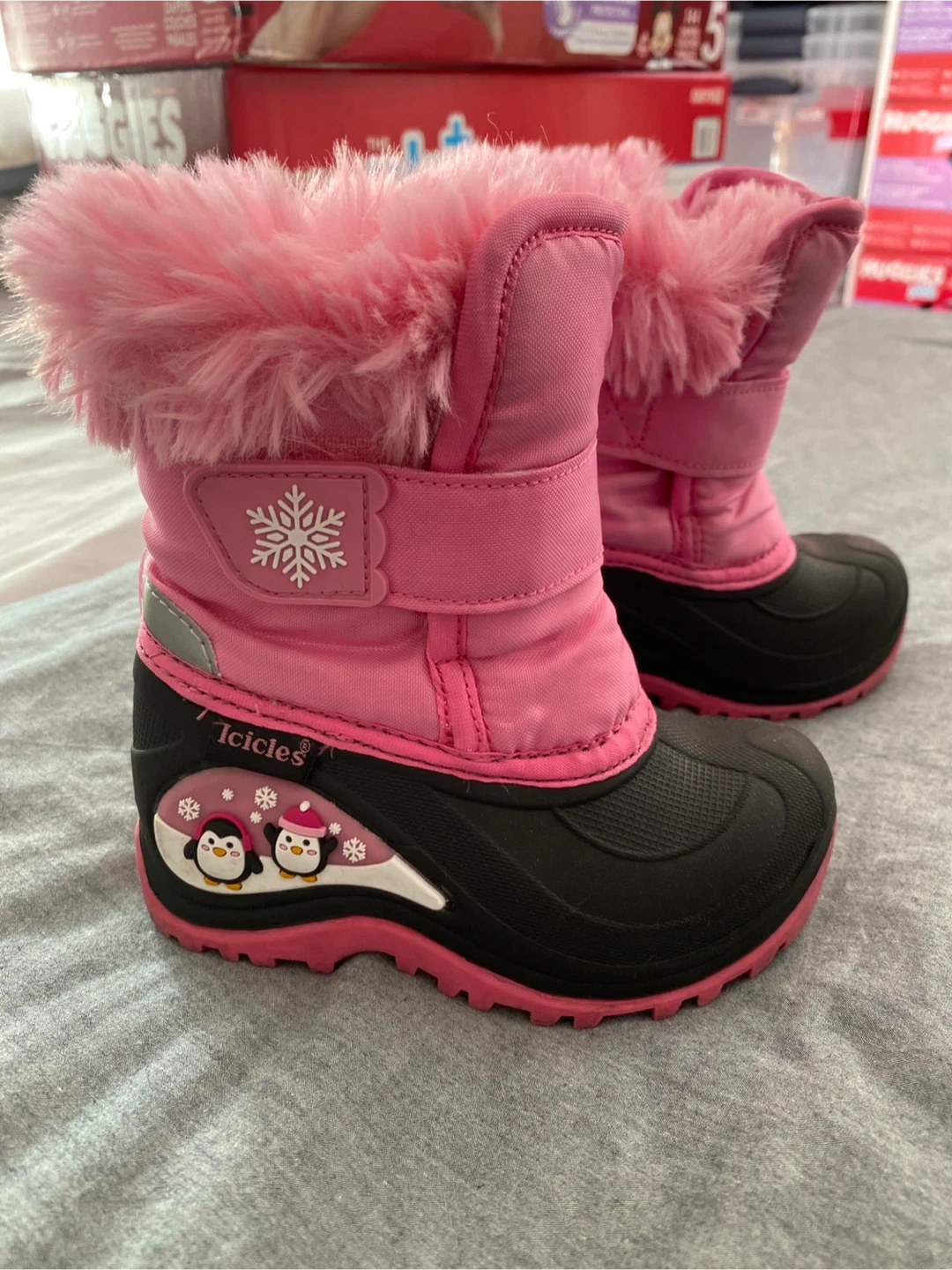 Size 8. These cute Icicles winter boots are perfect for keeping little feet warm and dry! They feature a pink and black design with adorable penguin details. Great for snowy days!
