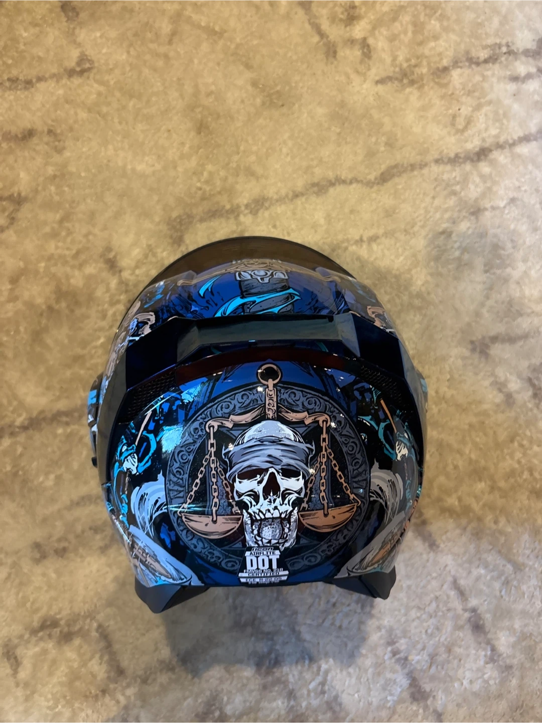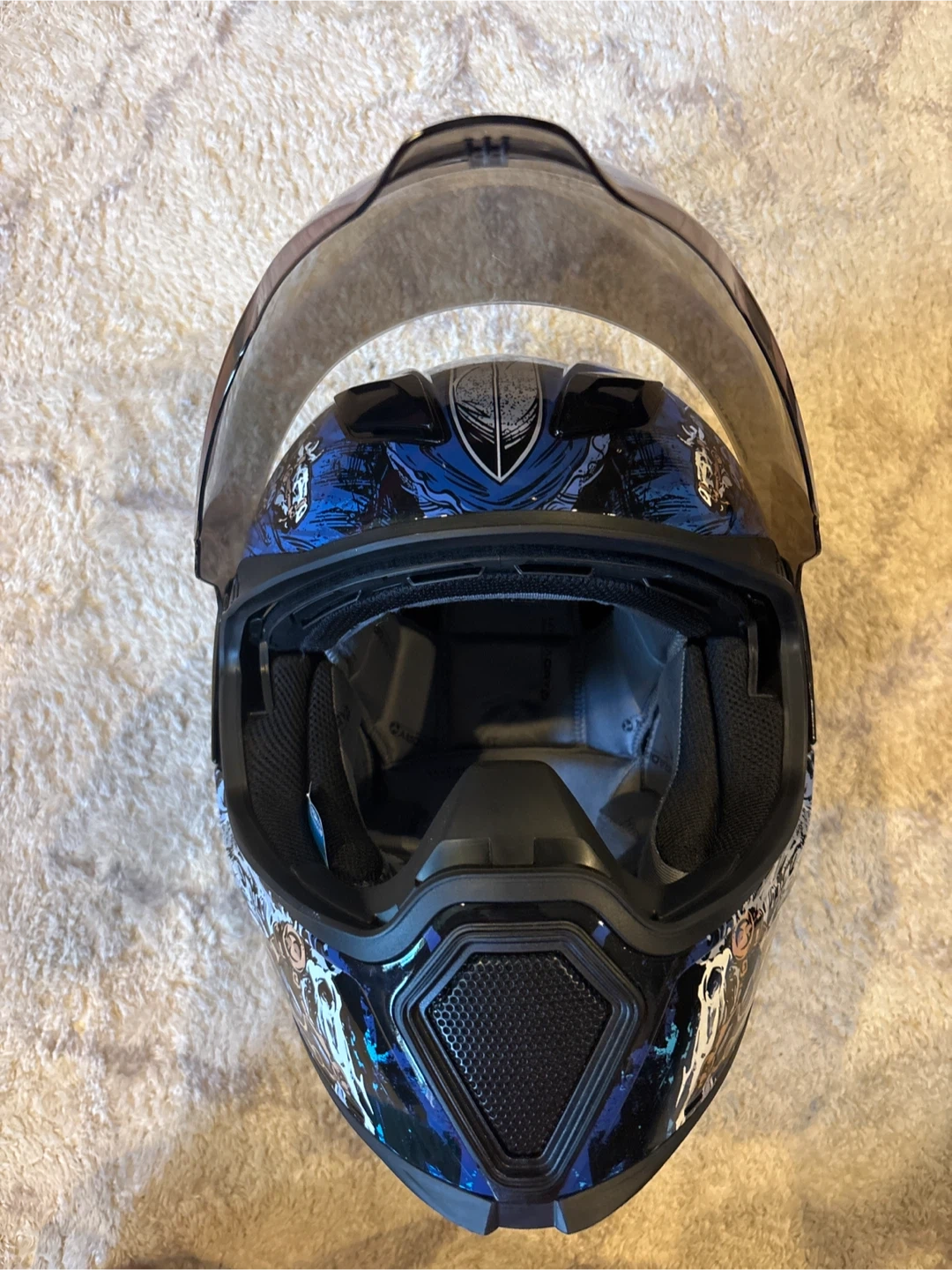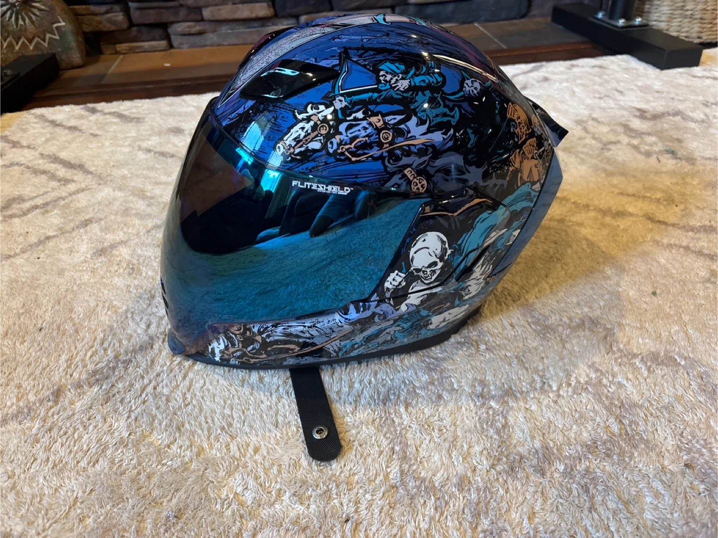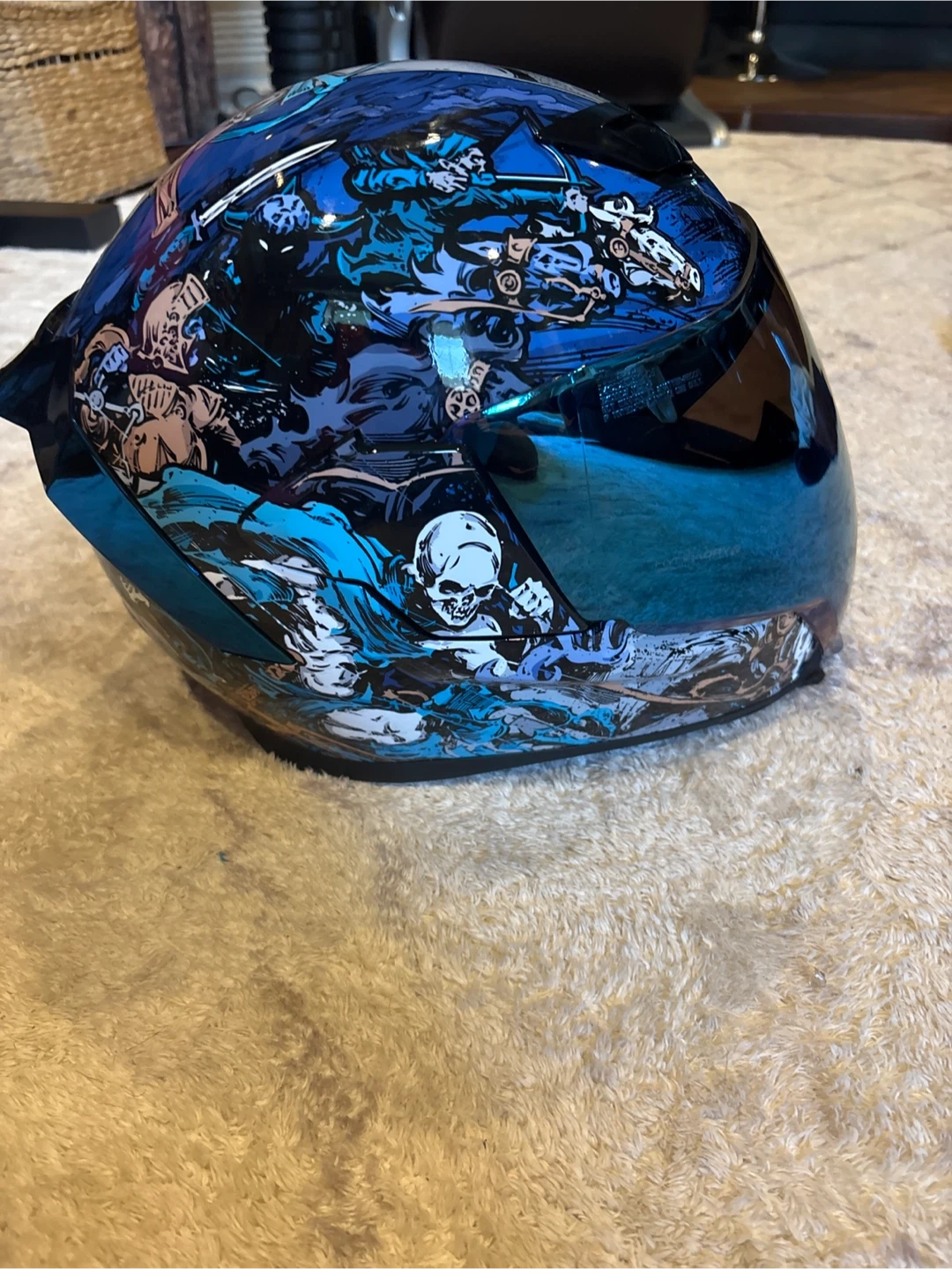 Selling an ICON Airflite 4 horsemen helmet. It's in great condition and has a unique design. The helmet features a blue color scheme with skull and warrior graphics. Perfect for motorcycle riders looking for style and protection! Comes with clear visor as well .