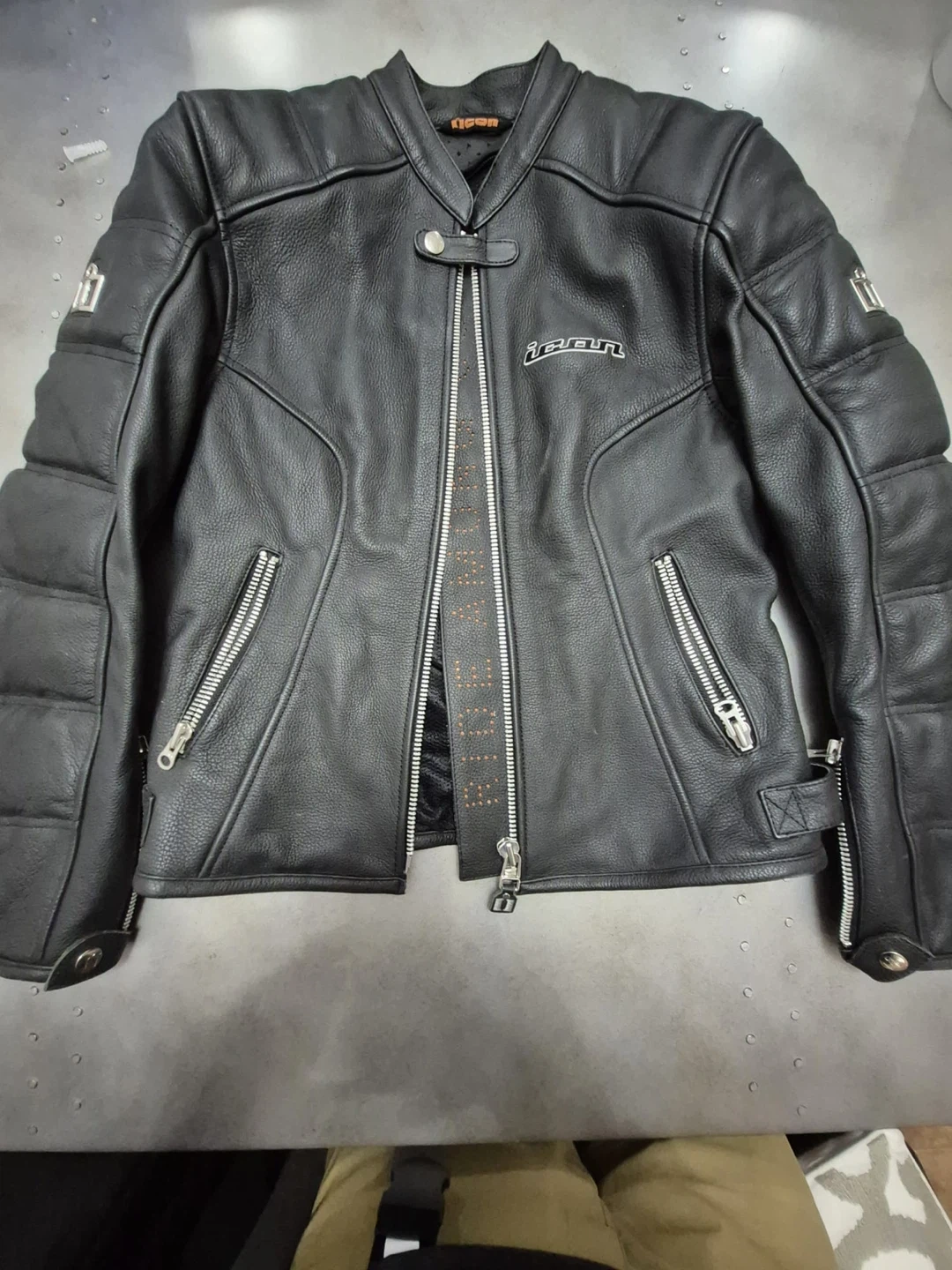Selling a used Icon black leather motorcycle jacket. It's in good condition and ready for the road. Please see photos for details! Used twice only. Size S. Selling for $300.00