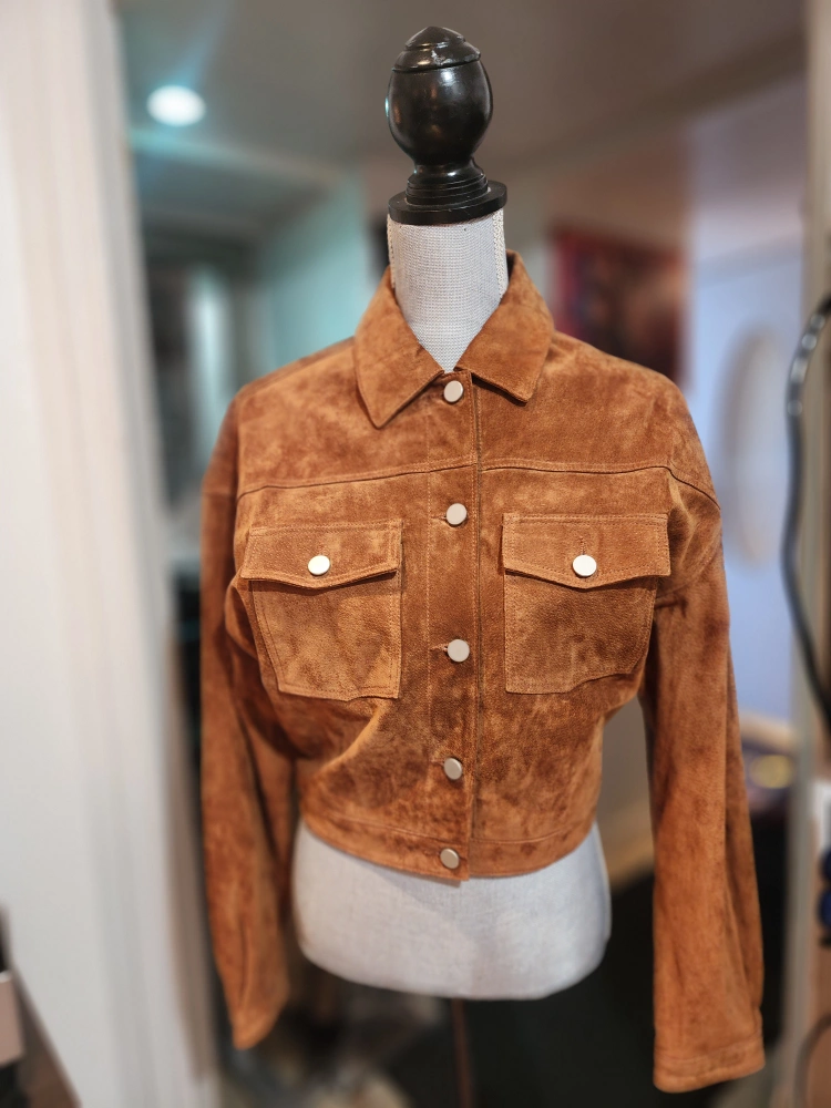 This is a stylish ICONE par Simons cropped suede jacket, perfect for adding a touch of vintage flair to any outfit. Made from 100% pig leather with a polyester lining, this jacket is in excellent condition. The jacket features a classic collar, button-up closure, and two chest pockets. It's a size small and has been very well-maintained. Only worn a couple times. 10/10 condition. Key Features: - Brand: ICONE par Simons - Material: 100% Pig Leather (Shell), 100% Polyester (Lining) - Size: Small - Colour: Brown - Style: Cropped Jacket - Closure: Button - Pockets: Two chest pockets Don't miss out on this fashionable find! If you're seeing this ad, the jacket is still available and ready to find a new home. Grab it before it's gone!