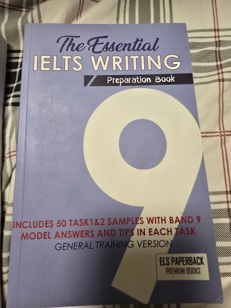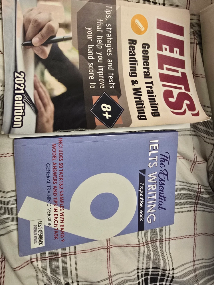 Selling two IELTS preparation books. One is "The Essential IELTS Writing Preparation Book" and the other is "IELTS General Training Reading & Writing 2021 edition". They include tips, strategies, and tests to help improve your band score
