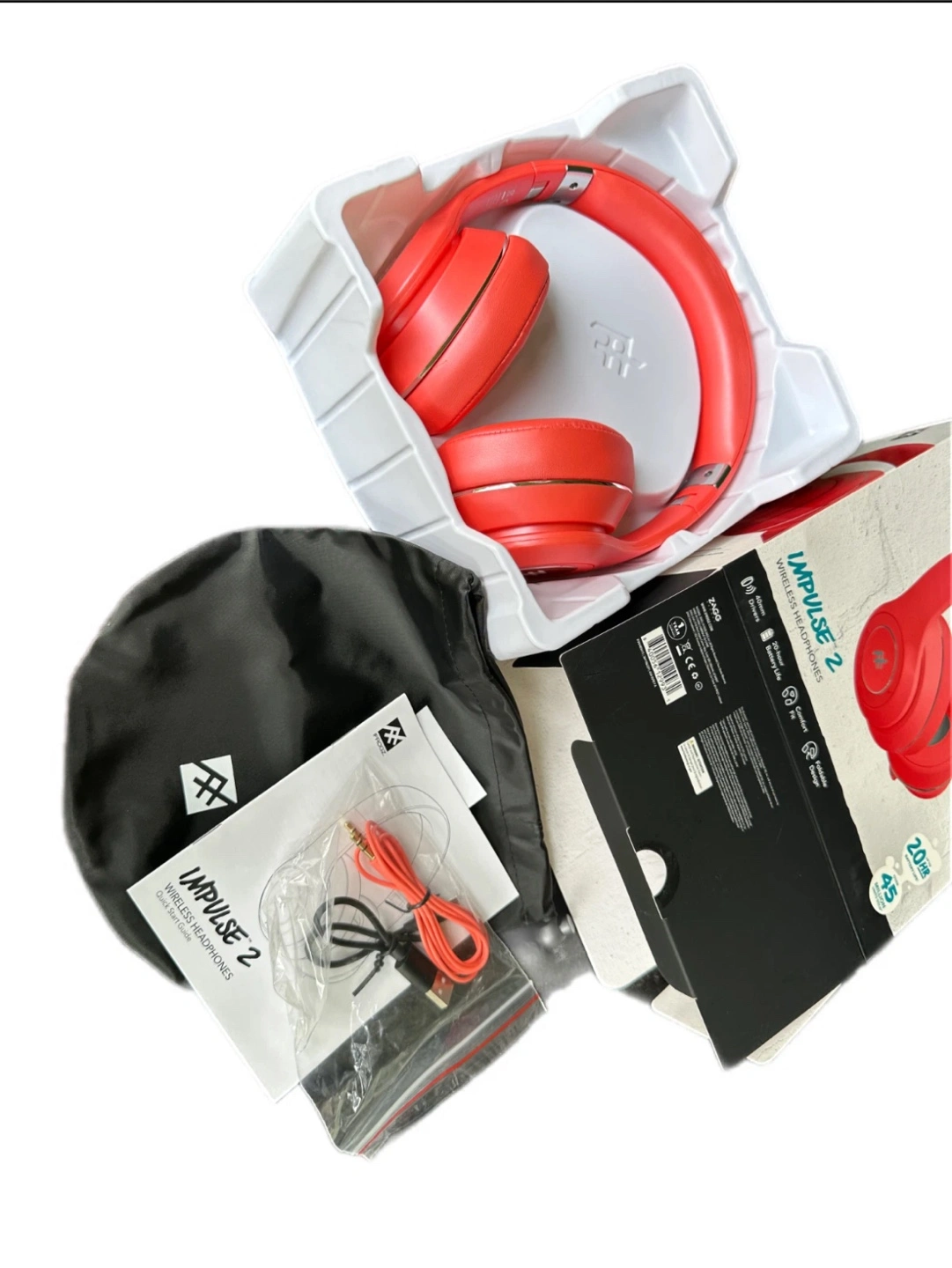 Selling a pair of iFrogz Impulse 2 wireless headphones in red! These headphones feature: - 40mm drivers - 20-hour battery life - Comfort fit - Foldable design Comes with the original box and carrying pouch, as well as the charging cable and instructions
