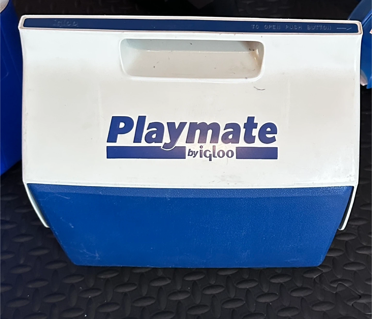 Selling a used Igloo Playmate cooler. It's in good condition and ready to keep your drinks and snacks cold! It's a classic design with a white top and blue bottom.