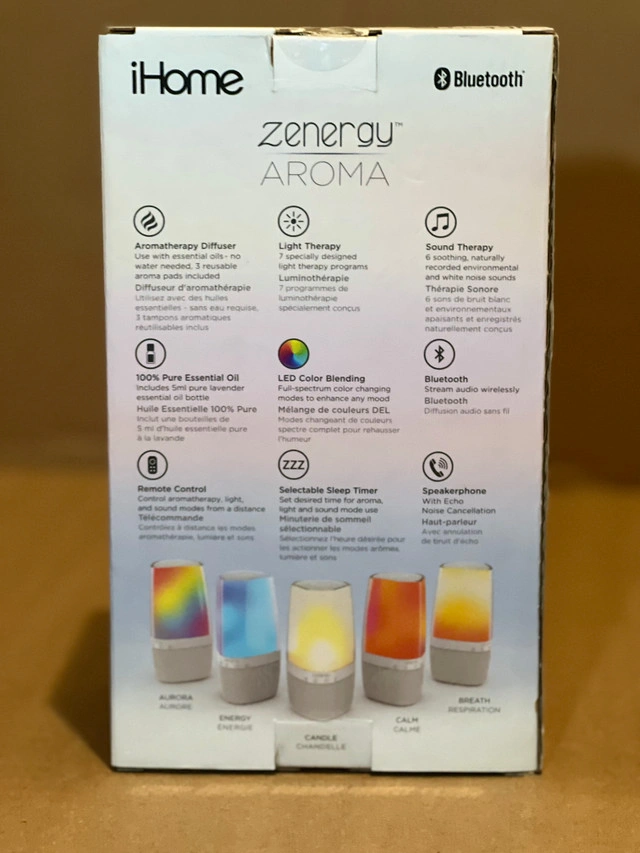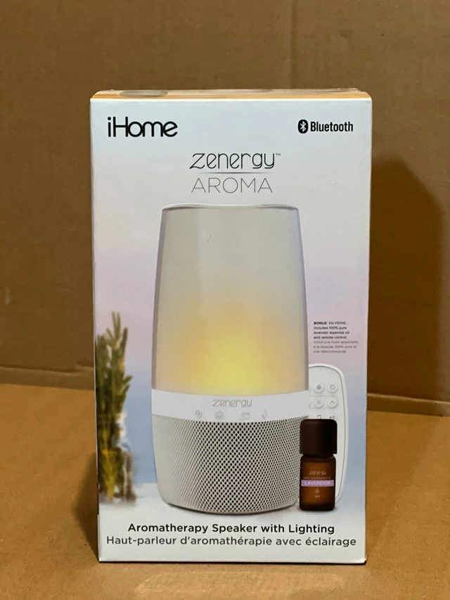 New in Sealed box - iHome iZABT50 Aroma BT Speaker with Lighting White About this item: ➡ Six different sound therapy tracks designed to calm your mind, lower your breathing and heart rate, and prepare your body for sleep ➡ Select from seven different 115 Lux, full-color light therapy modes designed to align your circadian rhythm at night and improve your mood throughout the day ➡ Two audio sources: built-in sound therapy and Bluetooth wireless audio streaming from your mobile device ➡ Included aromatherapy oil helps create a calming environment Pickup in Stratford Smoke-free/Pet-free home Checkout other listings for more items