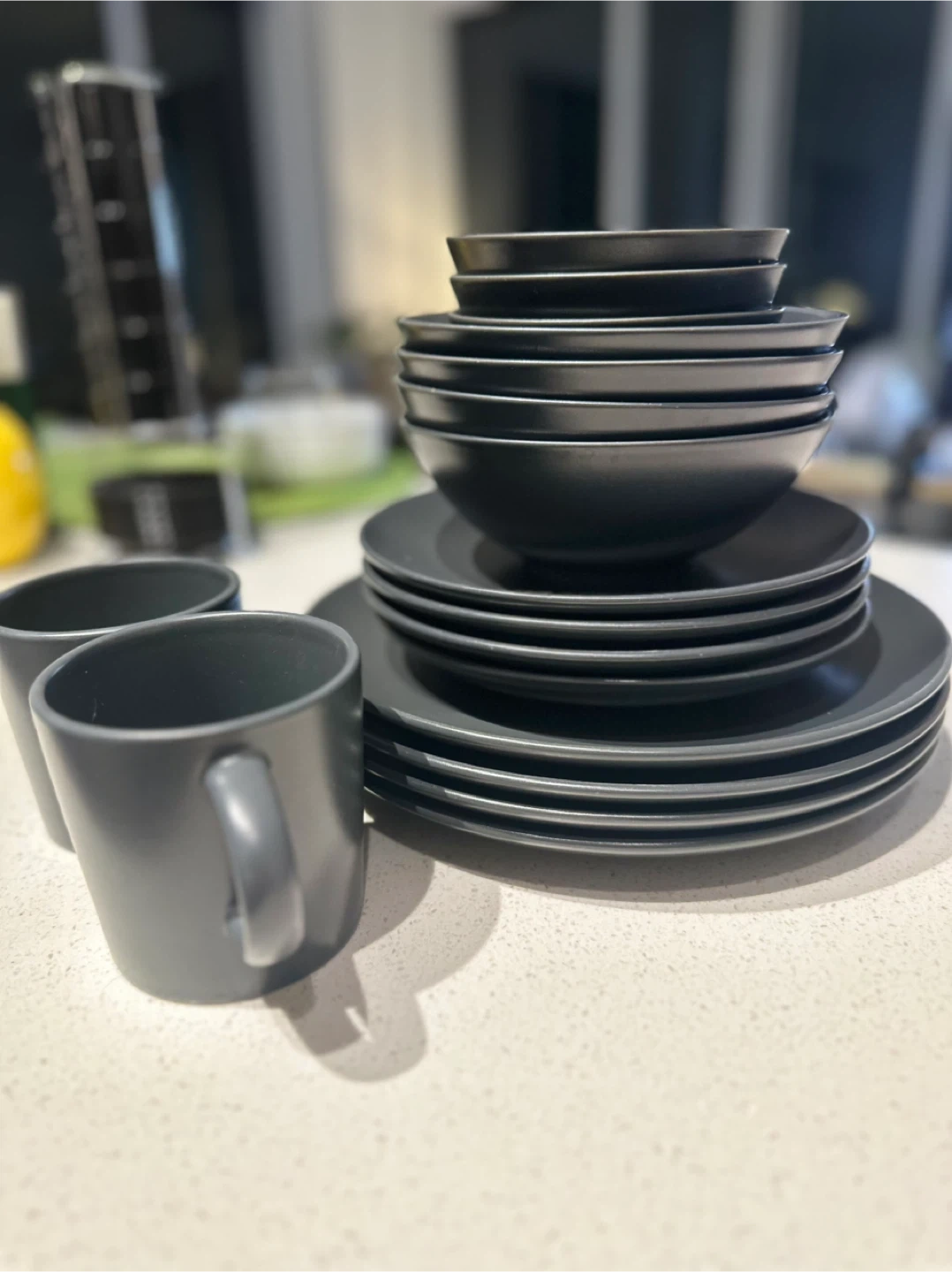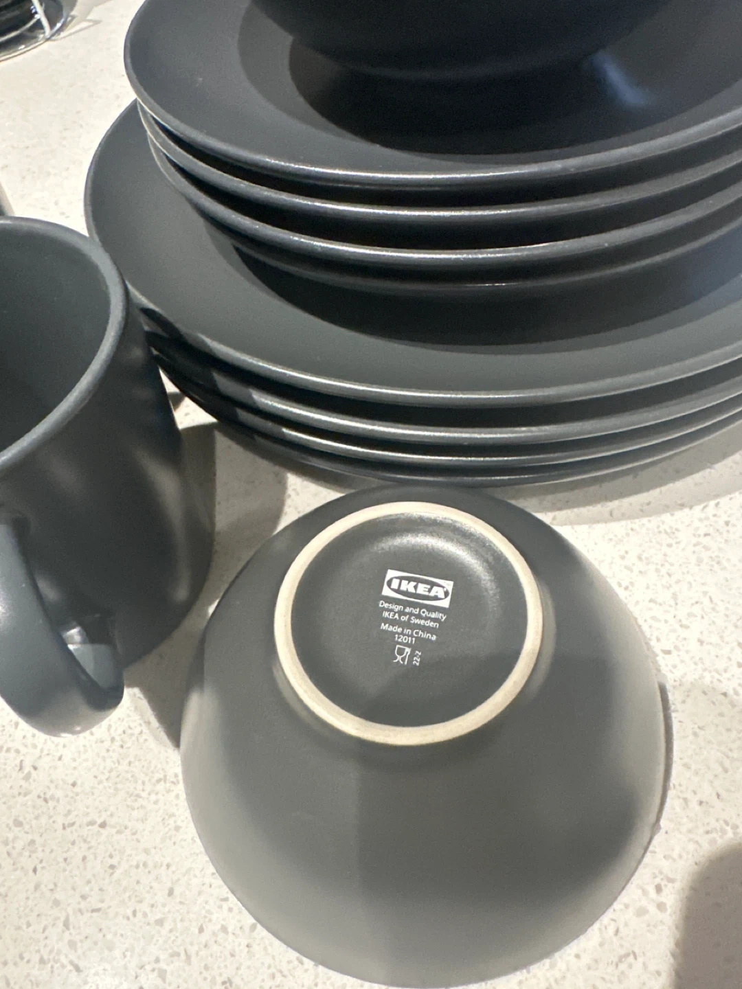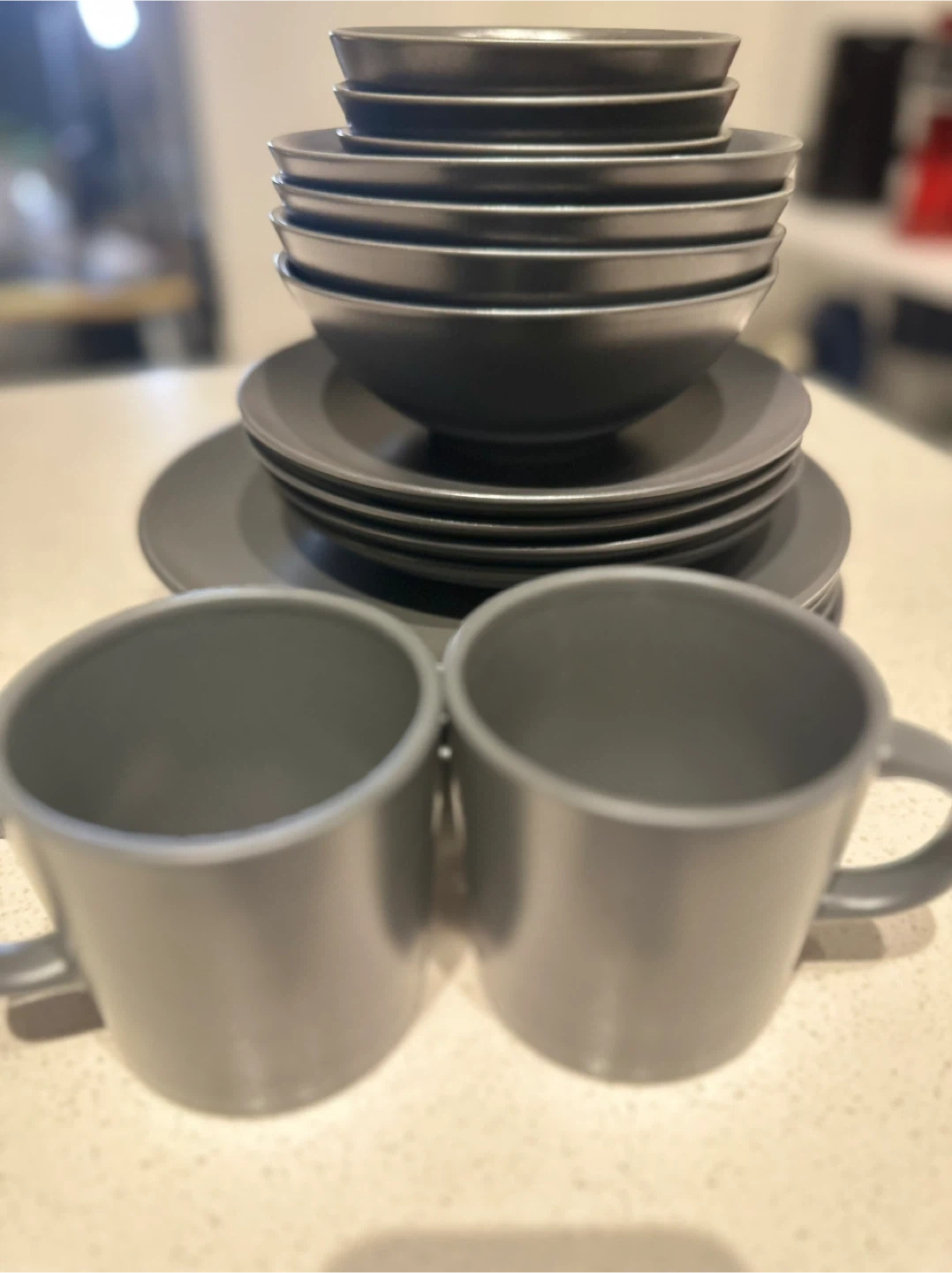 Selling a complete 18-piece dinnerware set from IKEA! It includes plates, bowls, and mugs, all in a stylish dark grey colour. Perfect for a small family or anyone looking to upgrade their kitchen essentials. They're in great condition and ready for a new home!