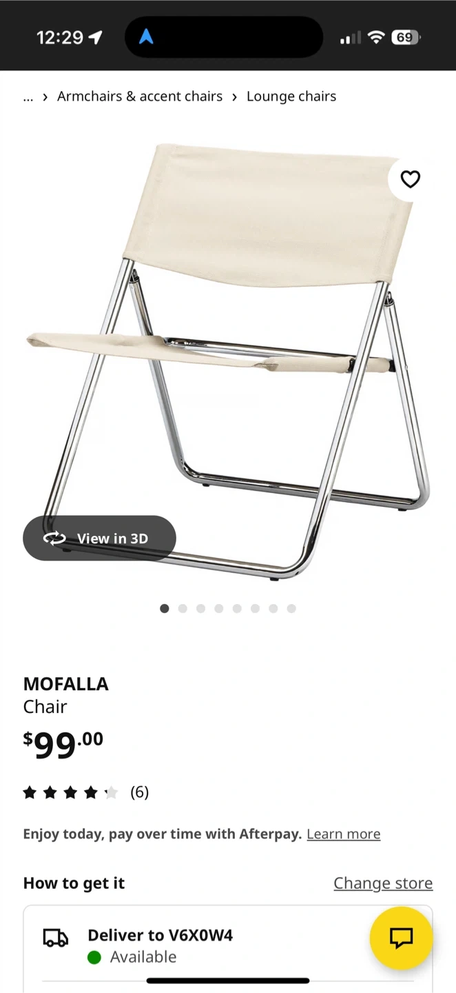 IKEA MOFALLA chair. Org $99+tax Selling a cute folding chair with a beige canvas seat and back. It's in great condition and perfect for extra seating when you have guests over. The frame is chrome. When not in use, it can be easily fold and store behind the door. Cash PU Aberdeen park area.