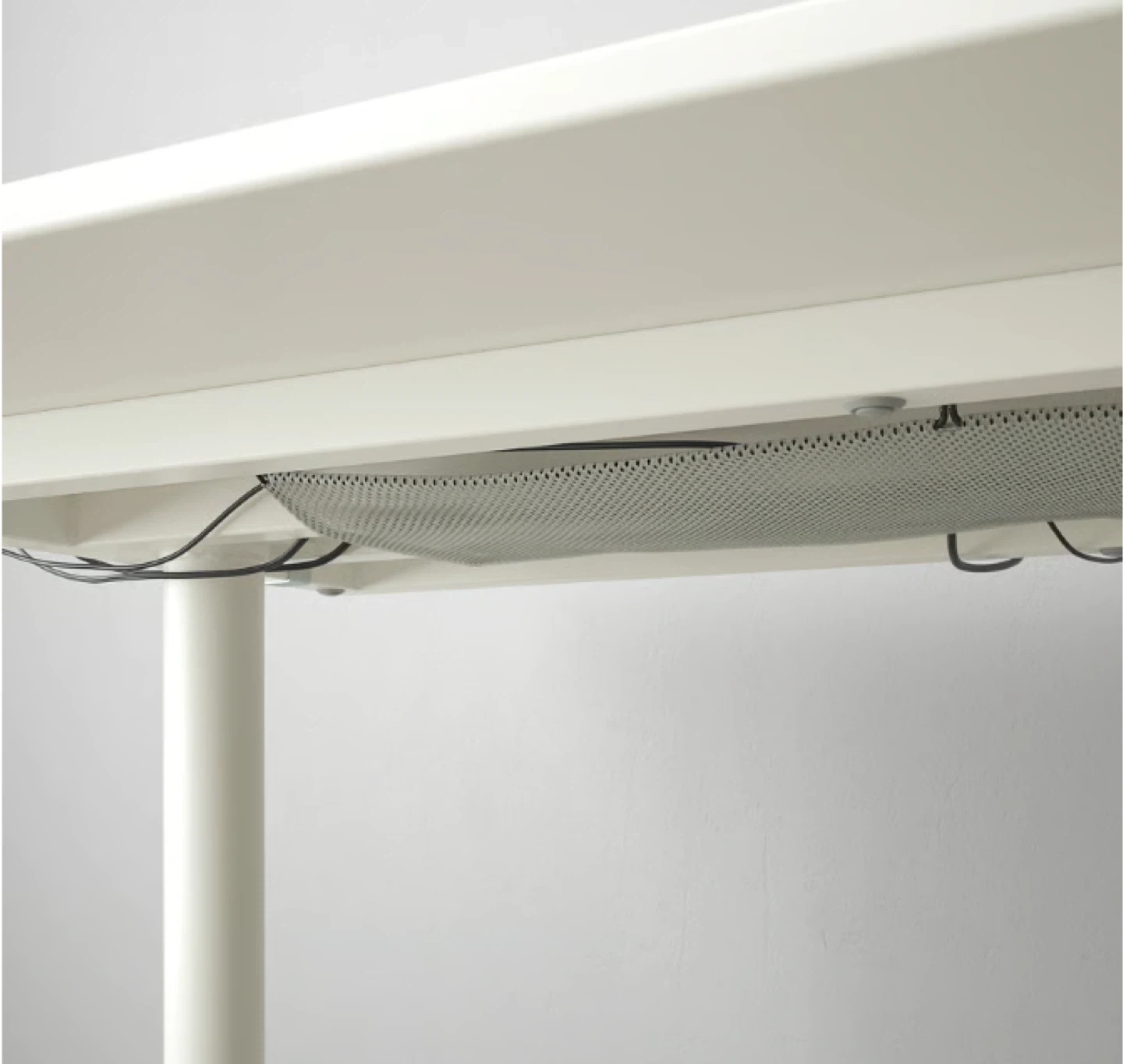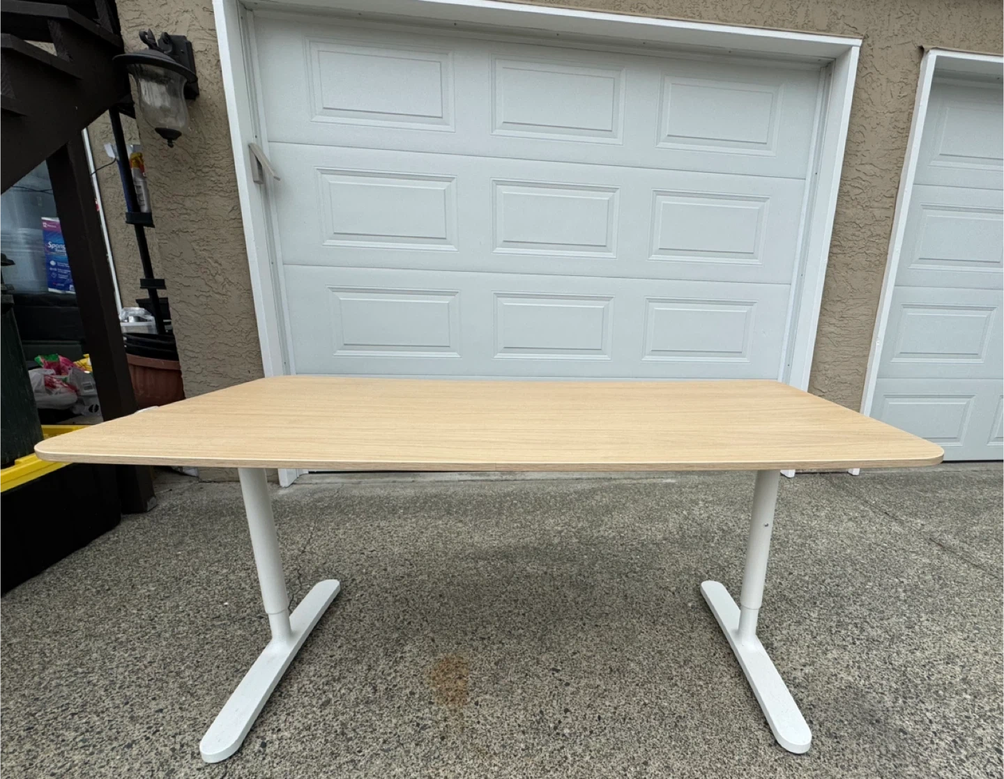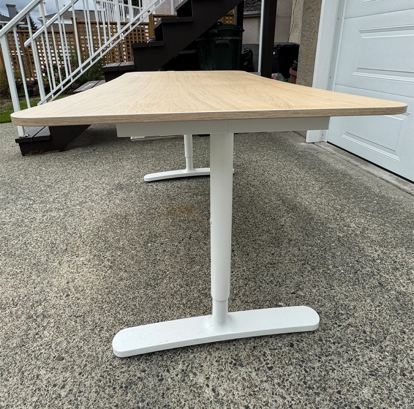 Selling an IKEA Bekant desk. It's in great shape and ready for a new home office or workspace! The desk has a wood grain table top and white adjustable legs. (Legs adjustable between 25 5/8 - 33 1/2). Note: this is a stationery desk and not a sit/stand desk. Pictures of white desk for illustrative purposes. Included cable management net under table top to keep your desk neat and tidy. Perfect for working from home or studying! Buyer responsible for pick-up. Thanks!