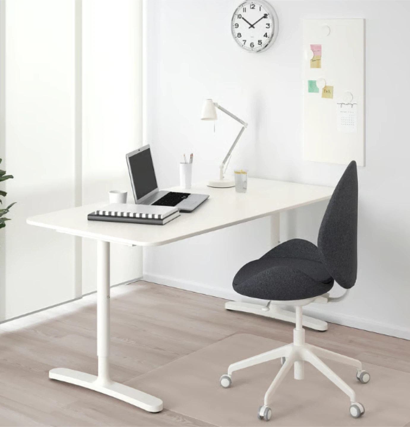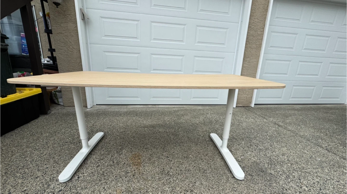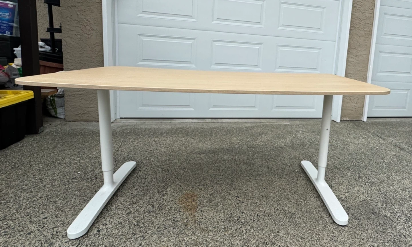 Selling an IKEA Bekant desk. It's in great shape and ready for a new home office or workspace! The desk has a wood grain table top and white adjustable legs. (Legs adjustable between 25 5/8 - 33 1/2). Note: this is a stationery desk and not a sit/stand desk. Pictures of white desk for illustrative purposes. Included cable management net under table top to keep your desk neat and tidy. Perfect for working from home or studying! Buyer responsible for pick-up. Thanks!