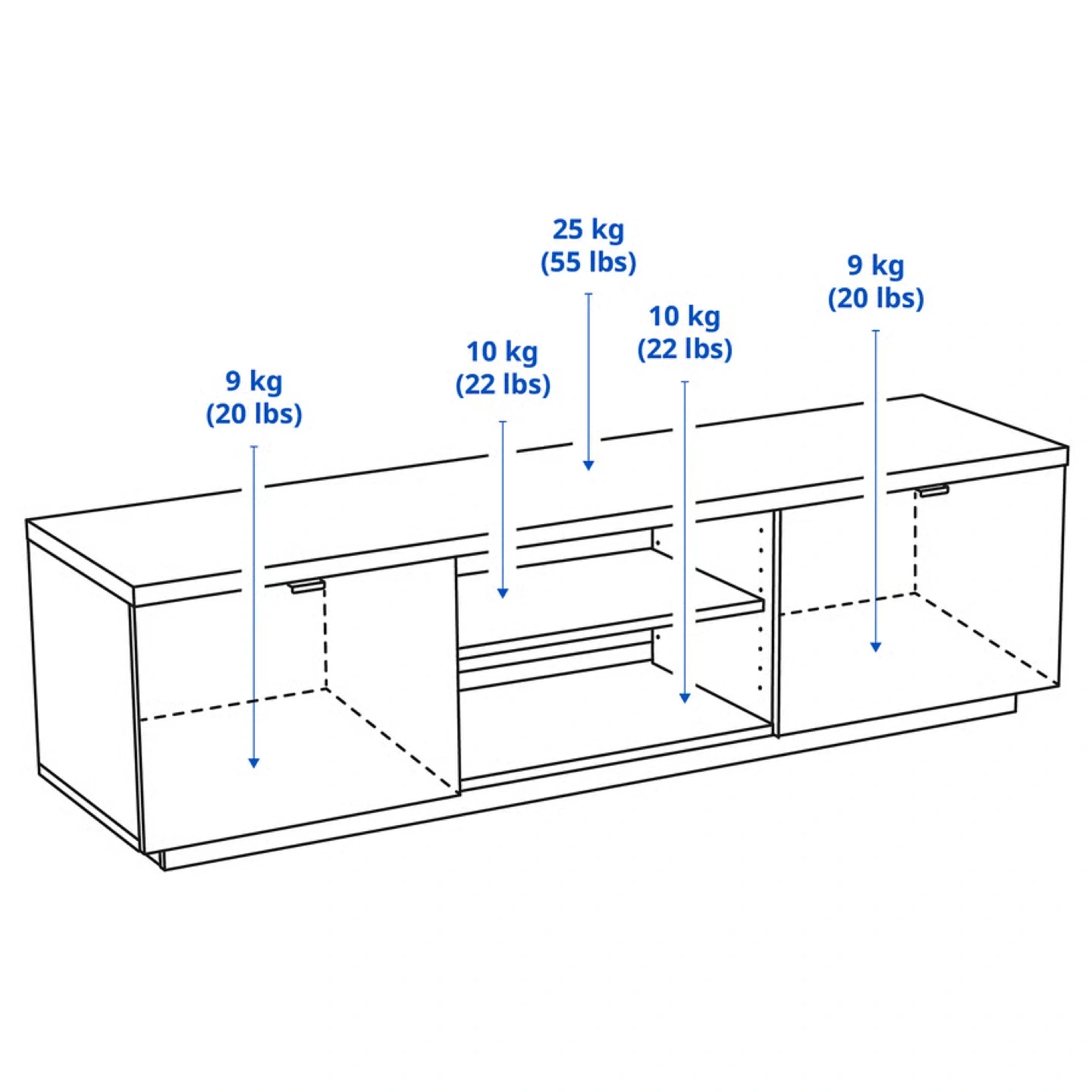 Selling a white IKEA Besta TV stand! It's in great shape and ready for a new home. Key specs: - Dimensions: 63" wide, 16 1/2" deep, and 17 3/4" high - Colour: White - Features two doors and open shelving for storage