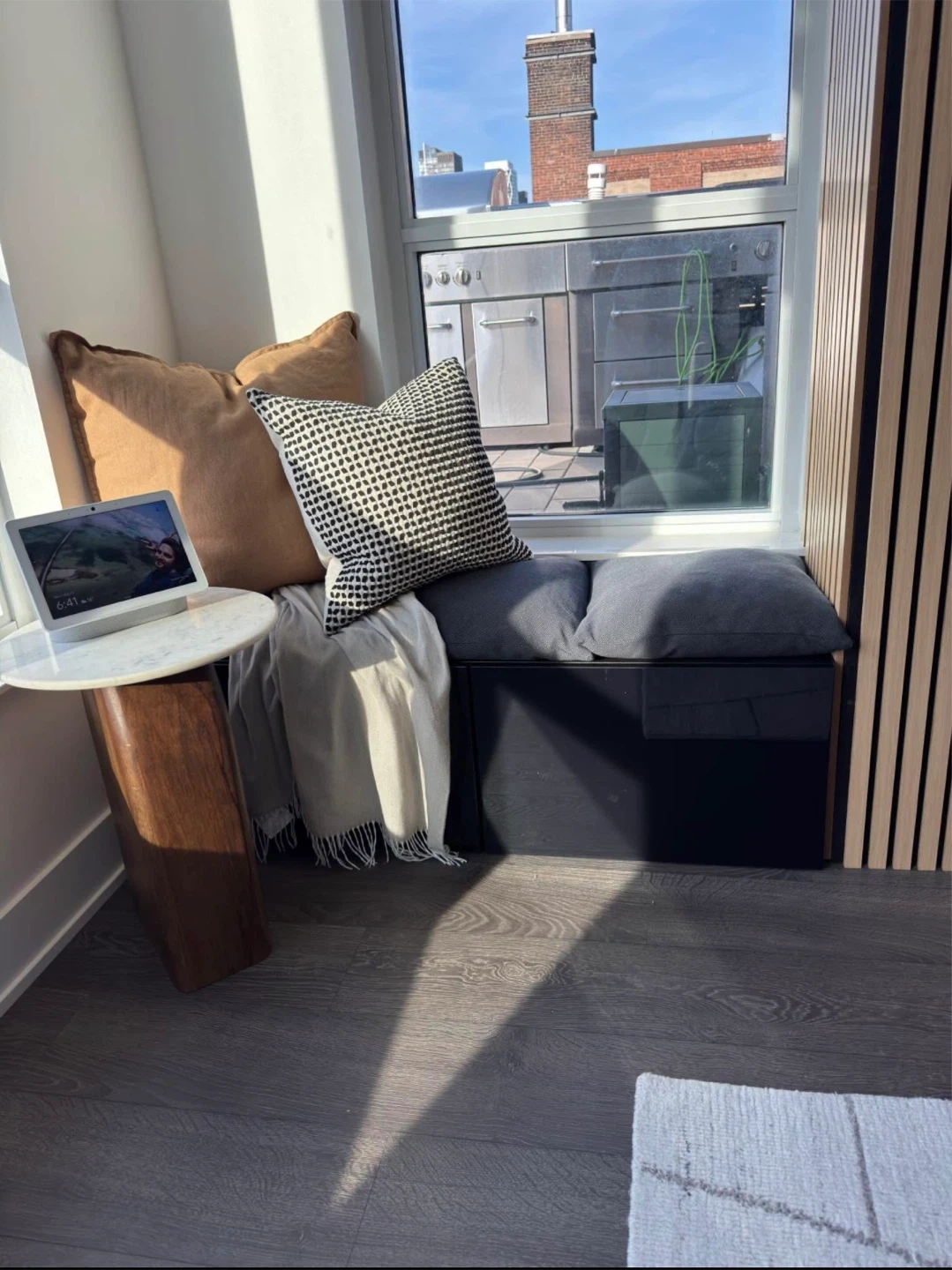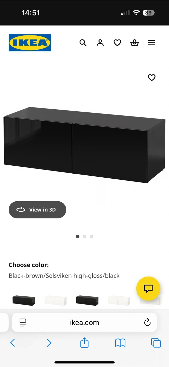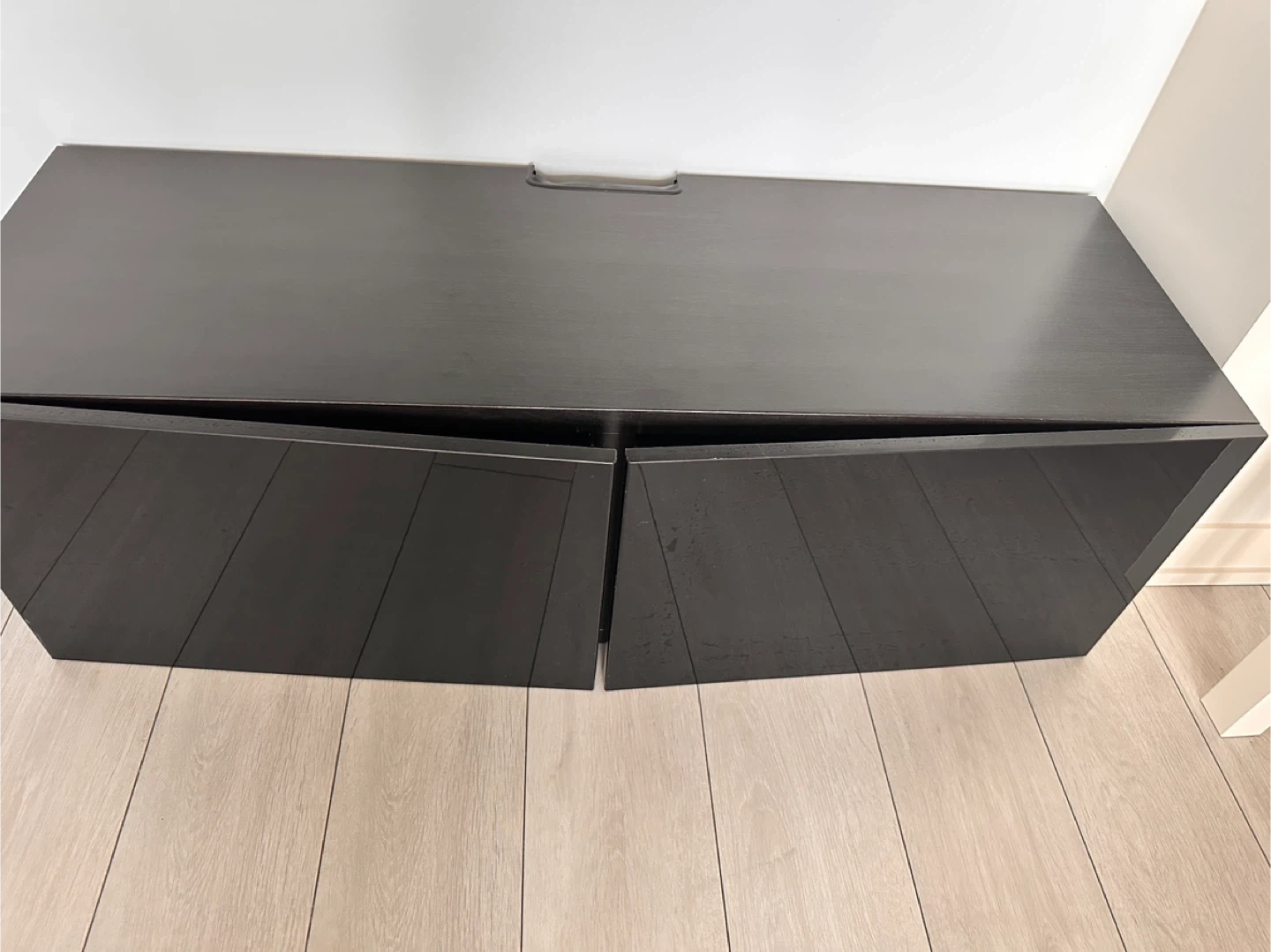 IKEA BESTÅ Shelf Unit with Doors • Color: Black-brown / Selsviken high-gloss black • Size: 120x42x38 cm (47 1/4x16 1/2x15”) • Condition: Like new (only 1.5 months old, no wear, no damage) • Already assembled — ready to use I bought it for my condo but realized it’s a bit small for my space, so I upgraded to a larger unit. This one is in excellent condition and looks brand new. Comes with 3 cushions can include the bigger cushion too for price.