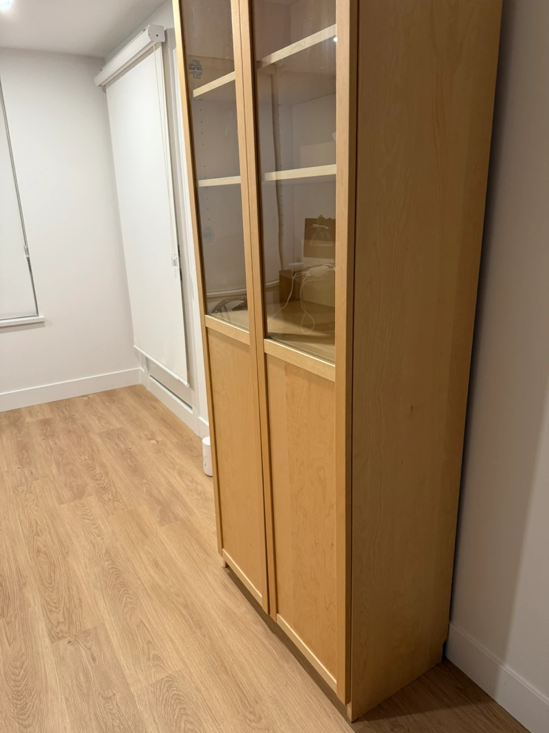 Selling an IKEA Billy bookcase with glass doors! It's in great shape and ready to hold your books and display items. The light wood colour is neutral and will fit into any room. It's a great way to add storage and style to your home