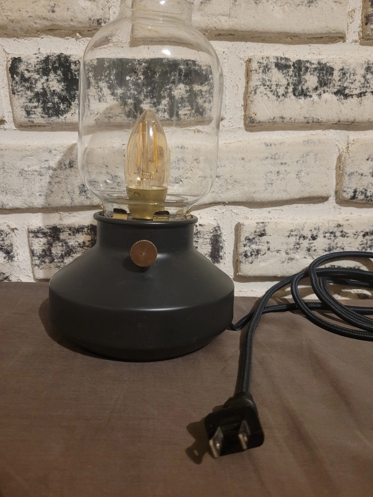 Here's a stylish black table lamp with a glass jar top! It has a unique look that would look great in any room. It's in great condition and ready to brighten up your space while also having a warm glow