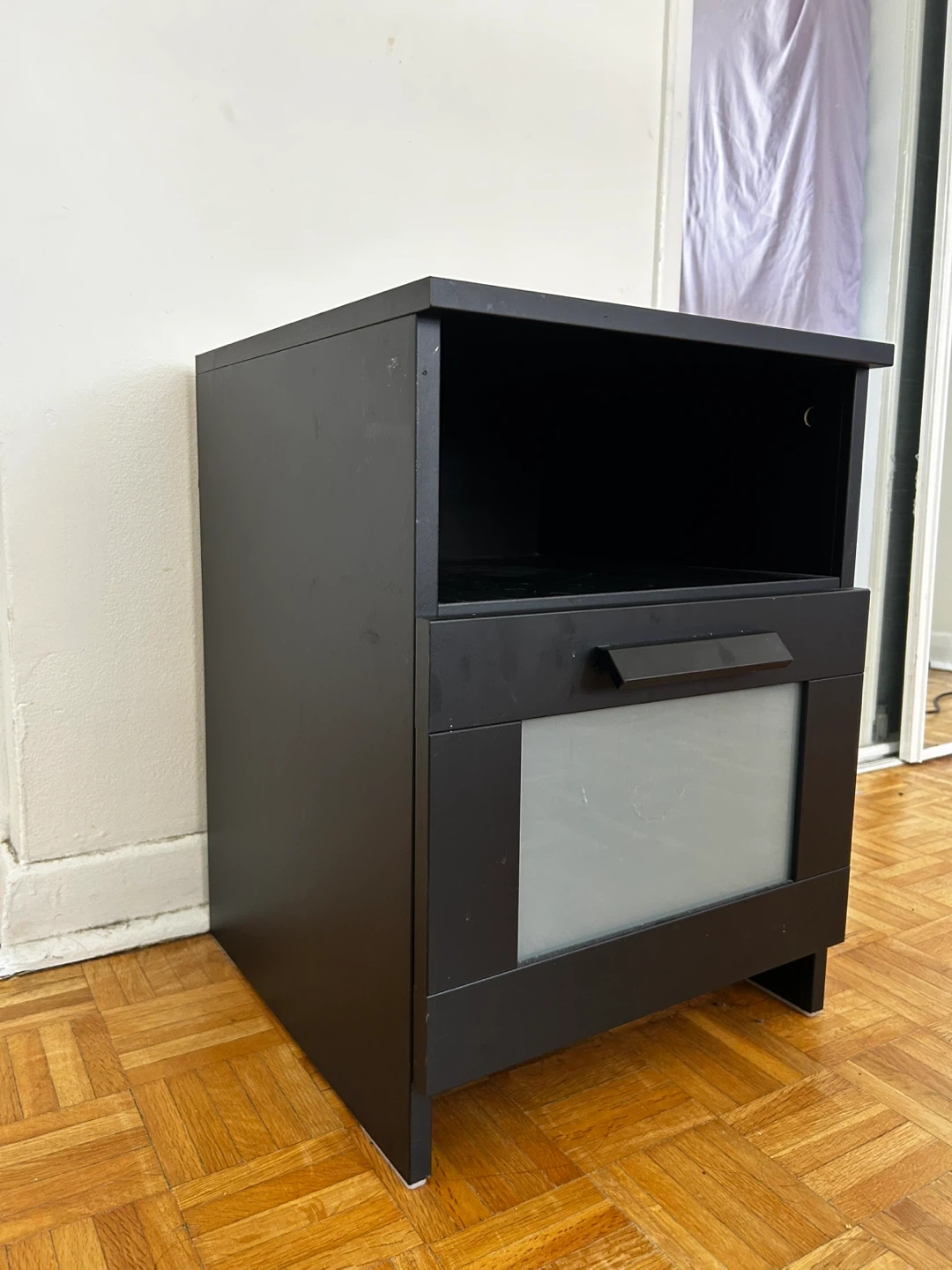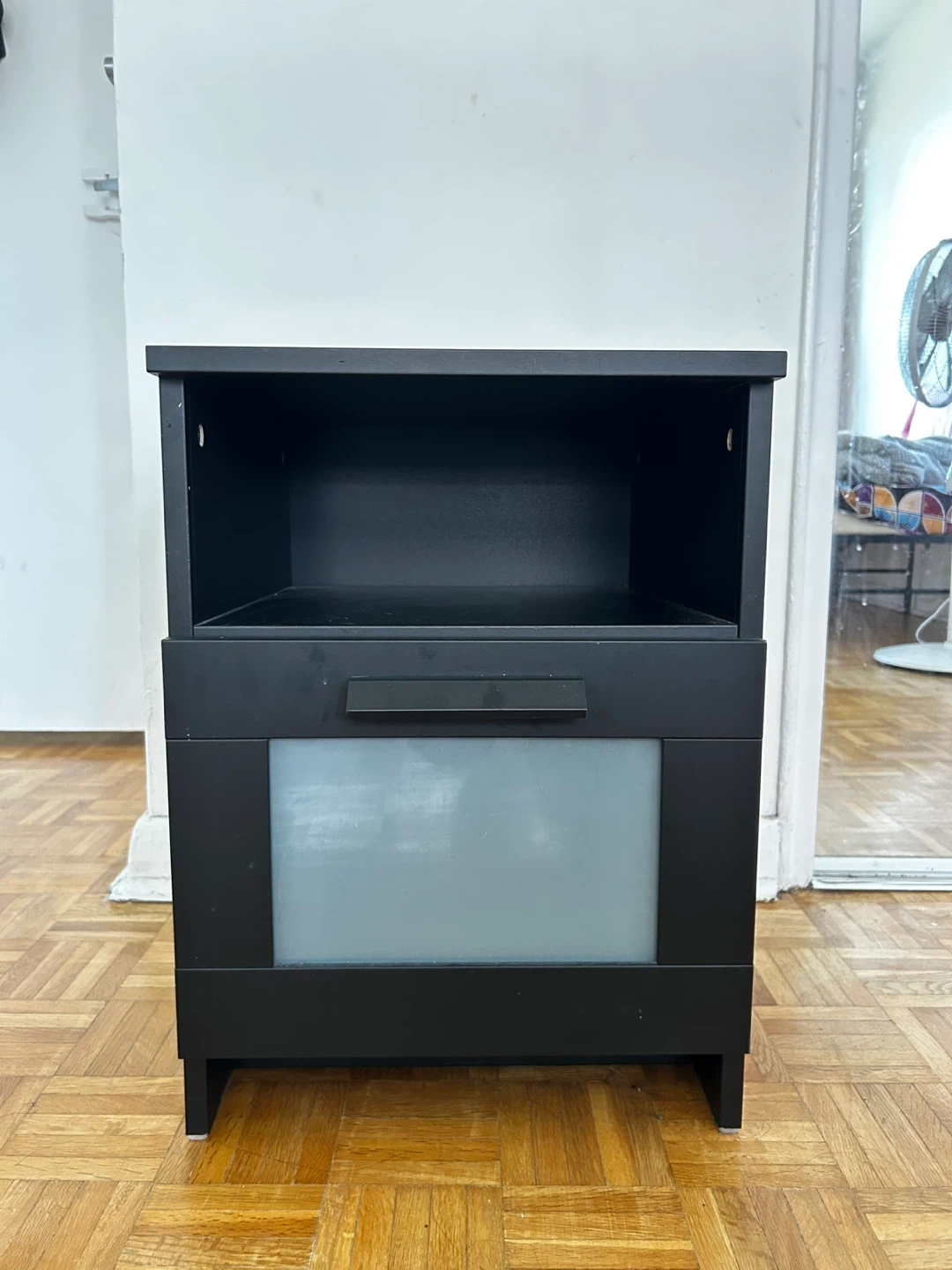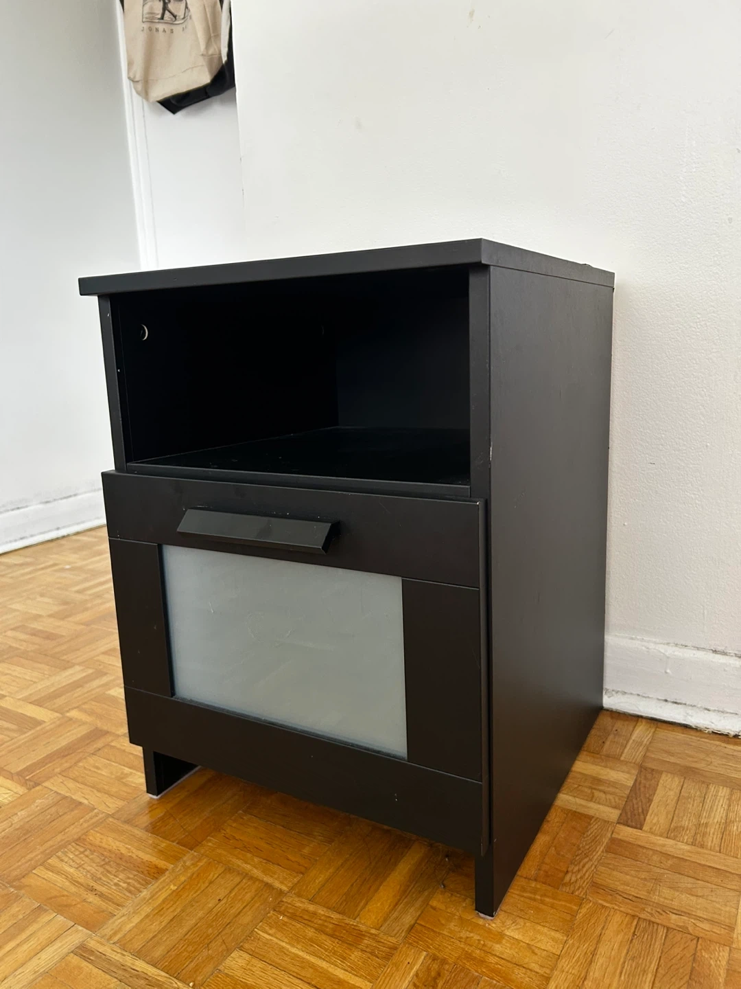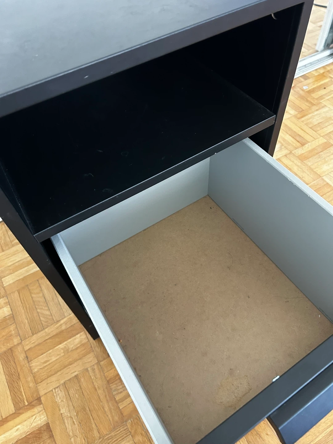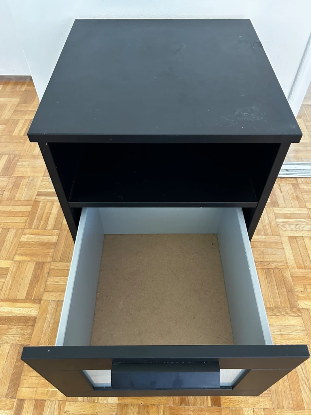 A shelf for books and a drawer for hiding a charging station and mobile devices. Perfect when you want to sleep without being disturbed by the light. Cords are easily drawn through the back of the drawer.