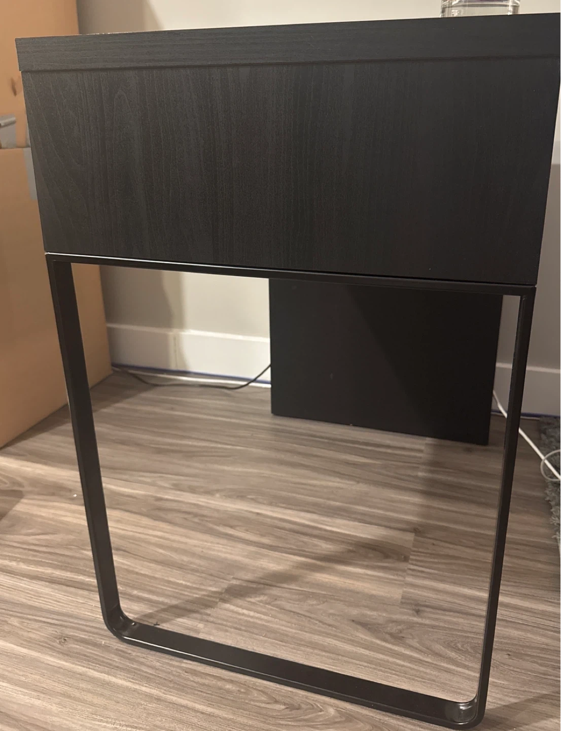 I'm selling a dark brown desk that's in great shape. It features a sleek design with a handy drawer, perfect for keeping your workspace tidy. The desk is sturdy and would be a great addition to any home office or study area