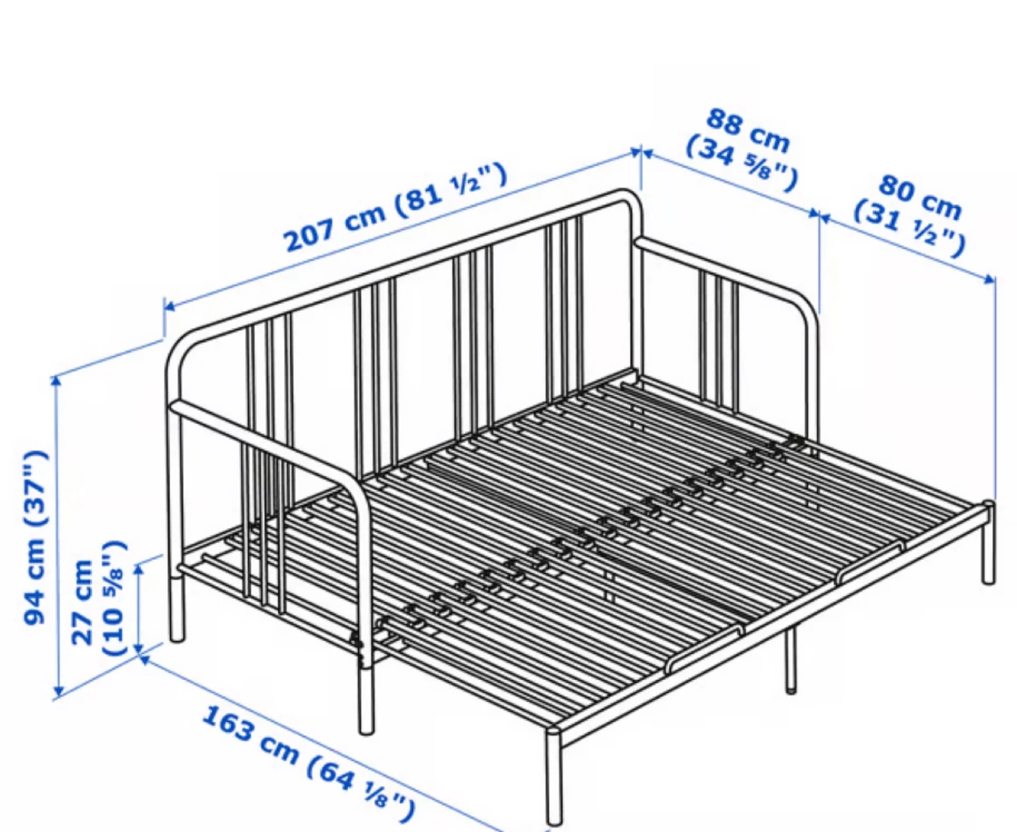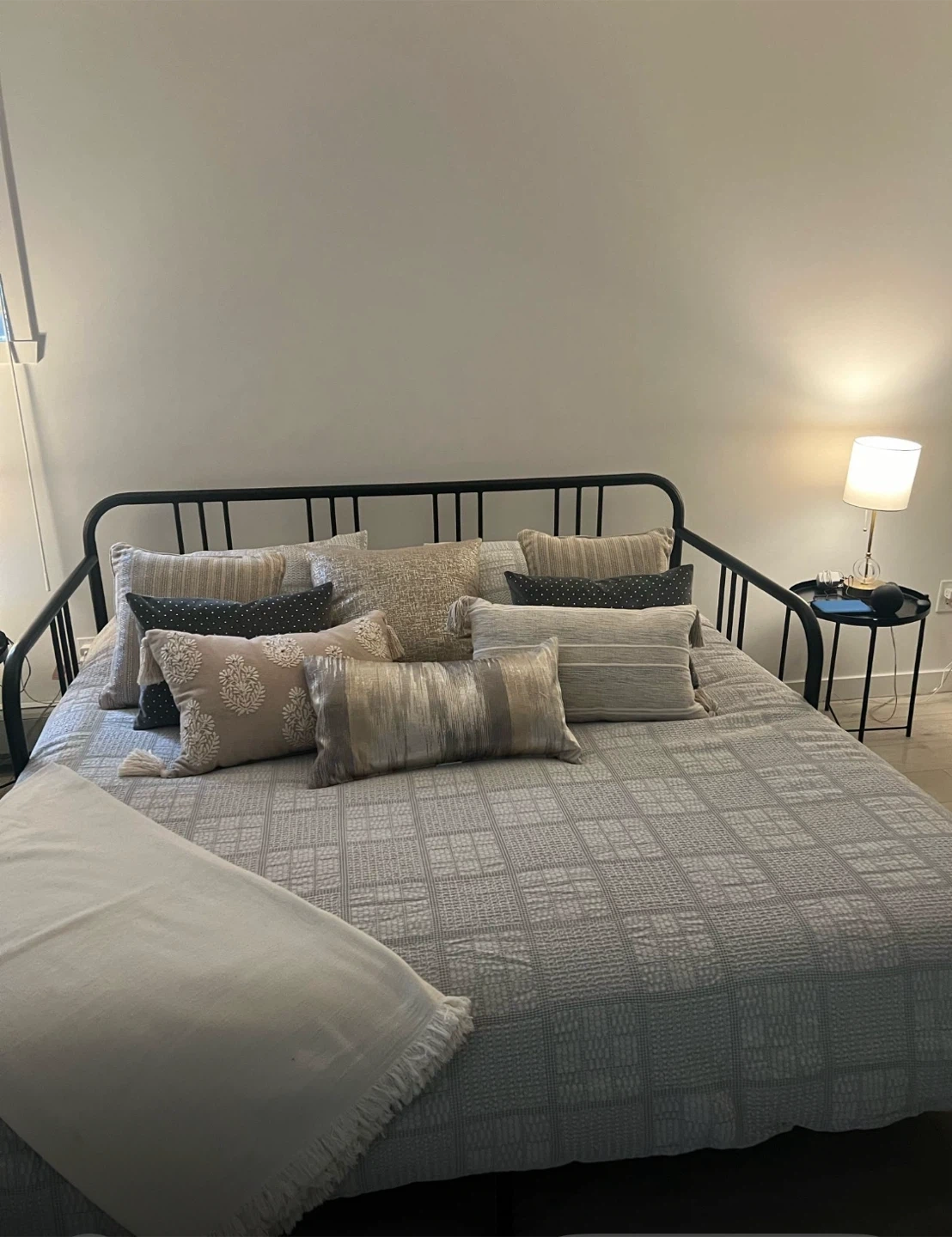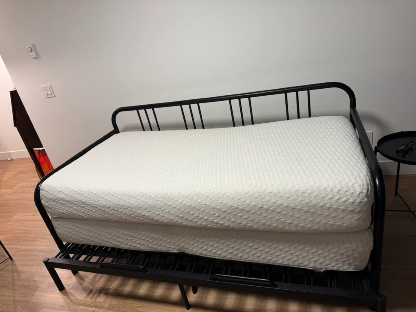 Selling a black metal daybed frame + 2 high quality matress + 2 round side table all in great shape and ready for a new home. Perfect for a guest room or small space. Dimensions are approximately 207cm x 163cm, with a height of 94cm. ( Bedding set is not included )
