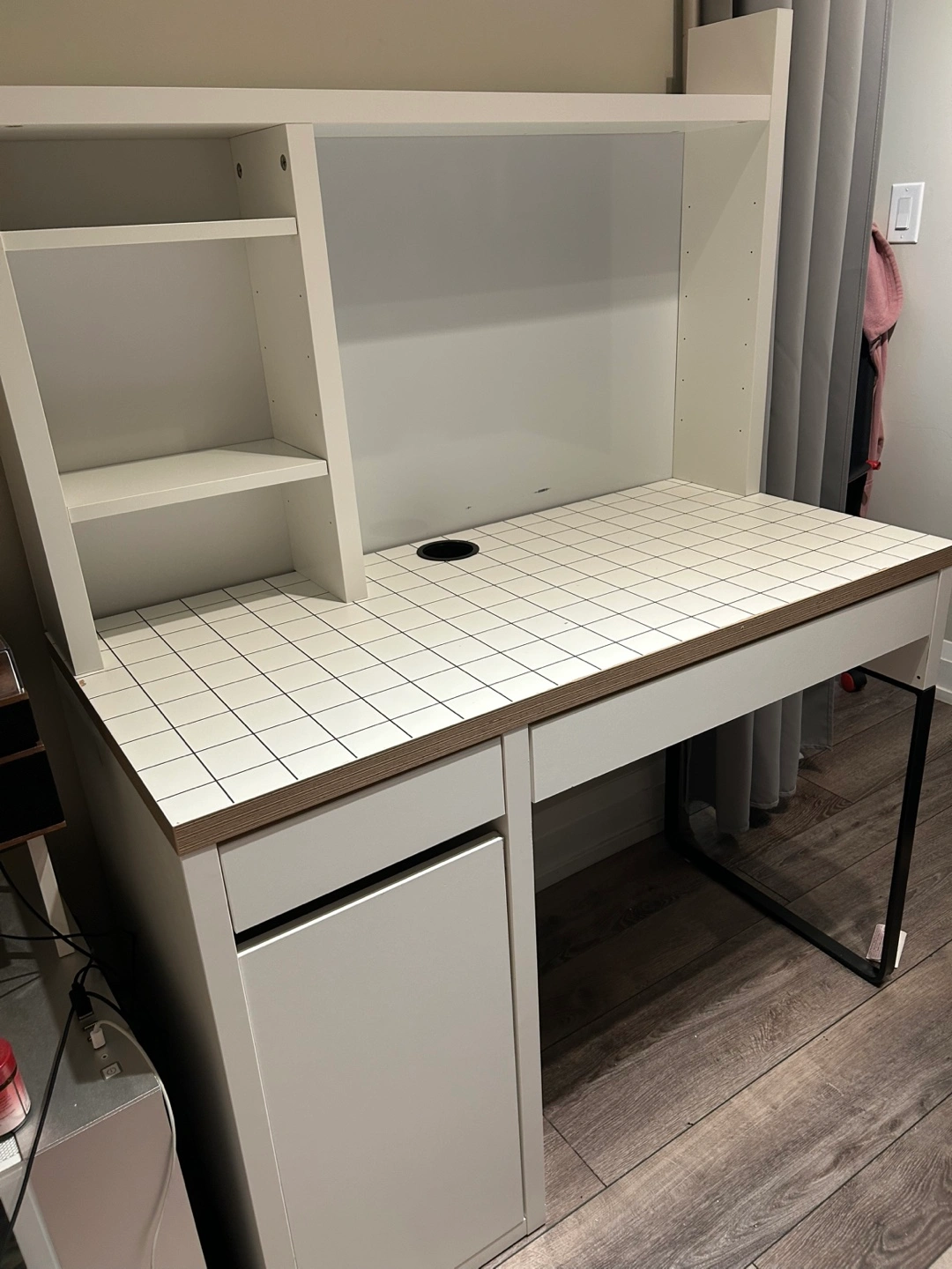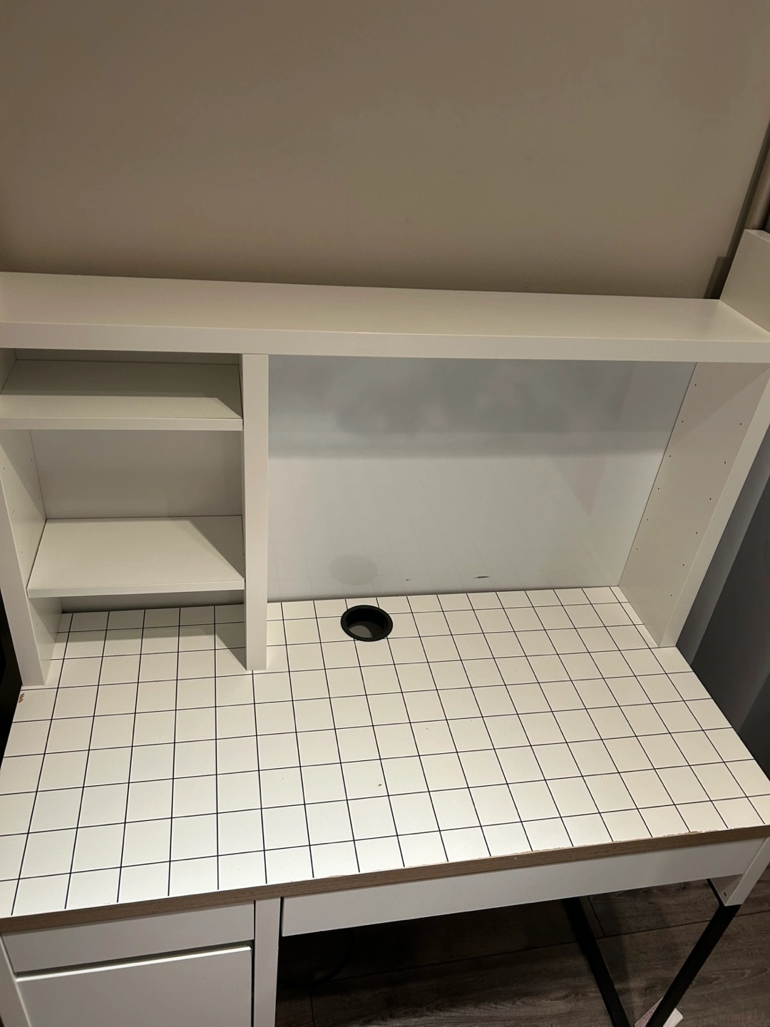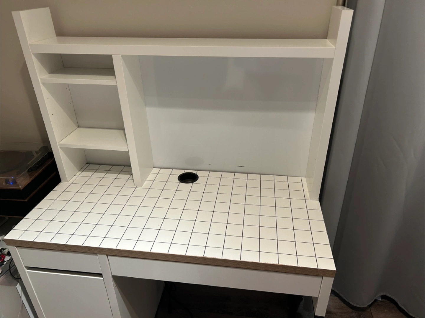 Selling a desk with a hutch, perfect for a home office or study space! It's in great condition and has a clean, modern look. The hutch provides extra storage and keeps your workspace organized. It features a white finish with a grid pattern on the desktop.