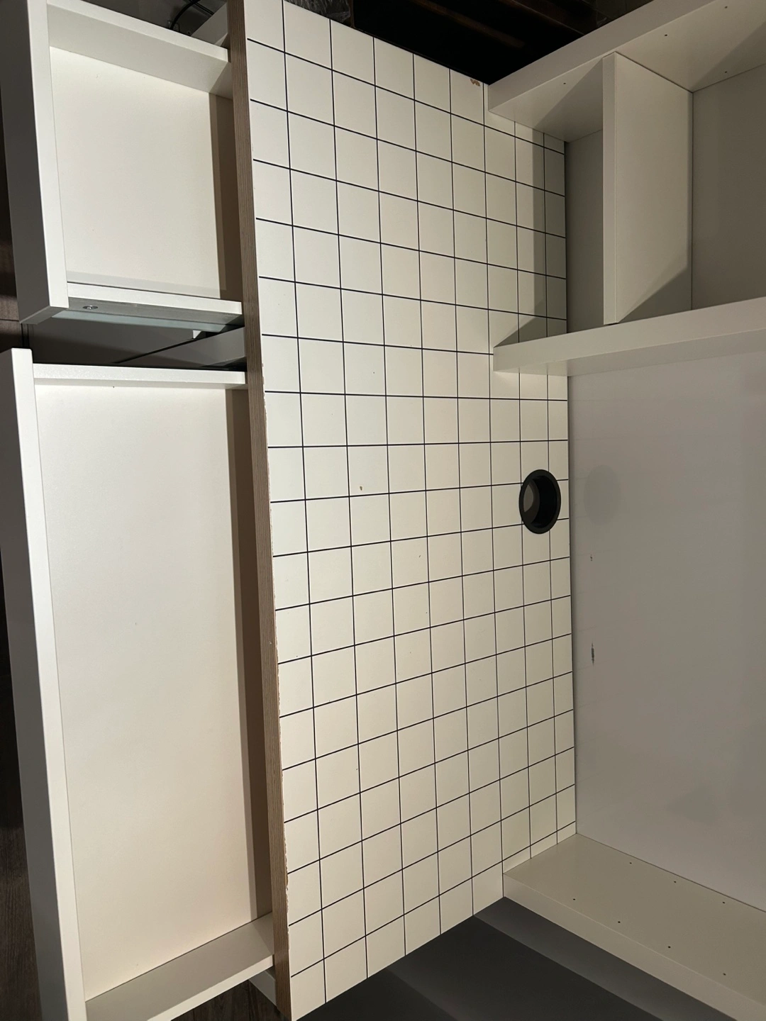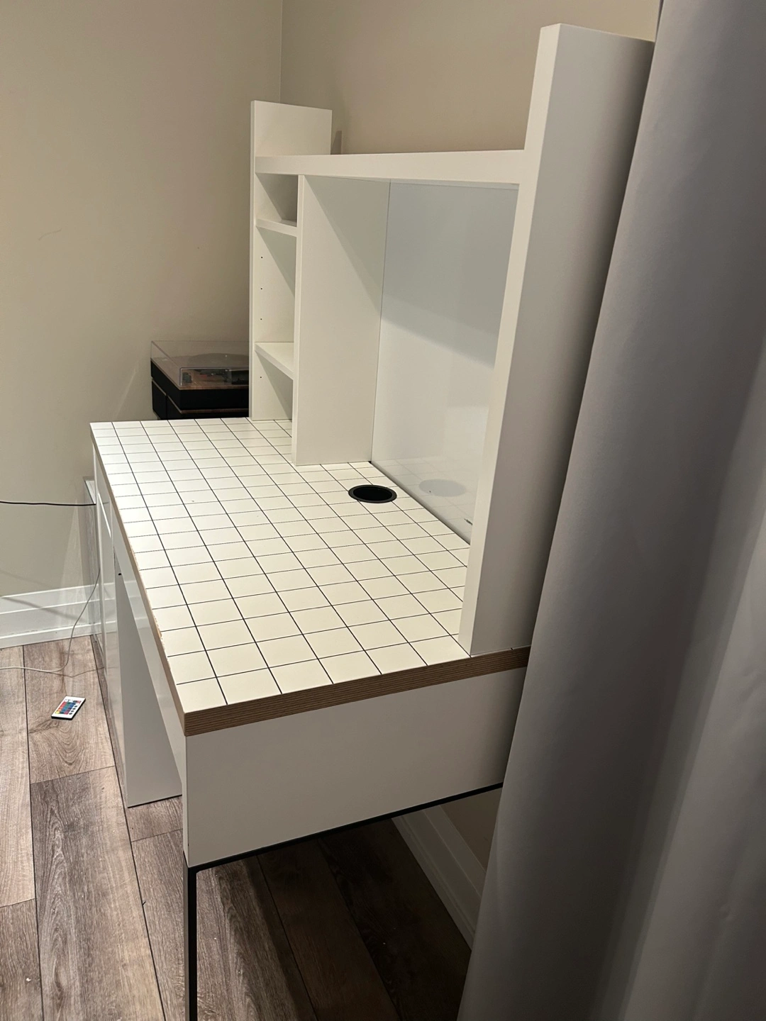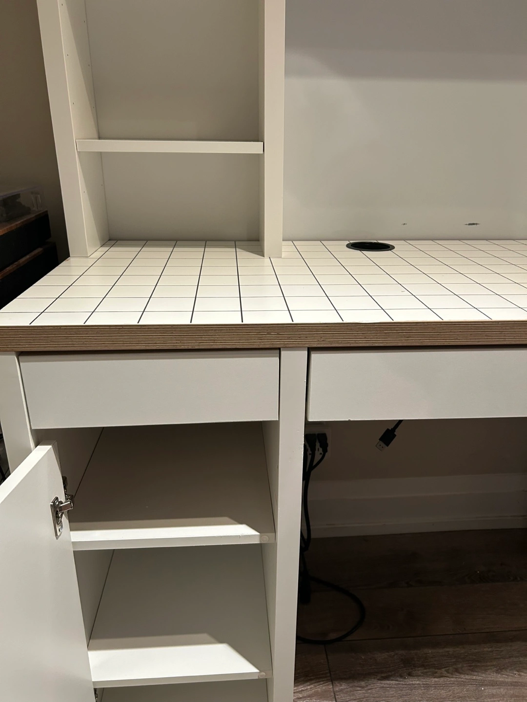Selling a desk with a hutch, perfect for a home office or study space! It's in great condition and has a clean, modern look. The hutch provides extra storage and keeps your workspace organized. It features a white finish with a grid pattern on the desktop.