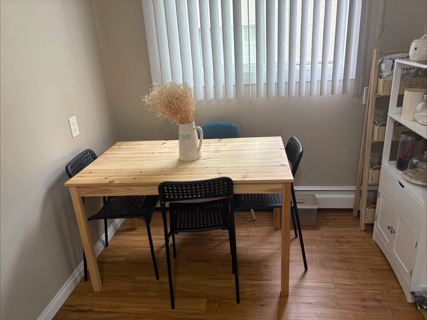 Selling a used IKEA dining table. It's a simple and sturdy set, perfect for a small dining area or kitchen. The table has a light wood finish, and the chairs are black. Great for anyone setting up a new place or looking for an affordable dining solution!