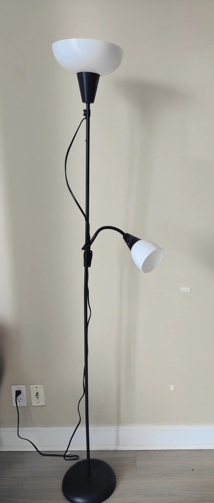 Features a tall black stand with a large white shade at the top. A flexible reading light is included. Imagine reading your favourite book while the light shines in your eyes, easing your mind. includes 4 bulbs