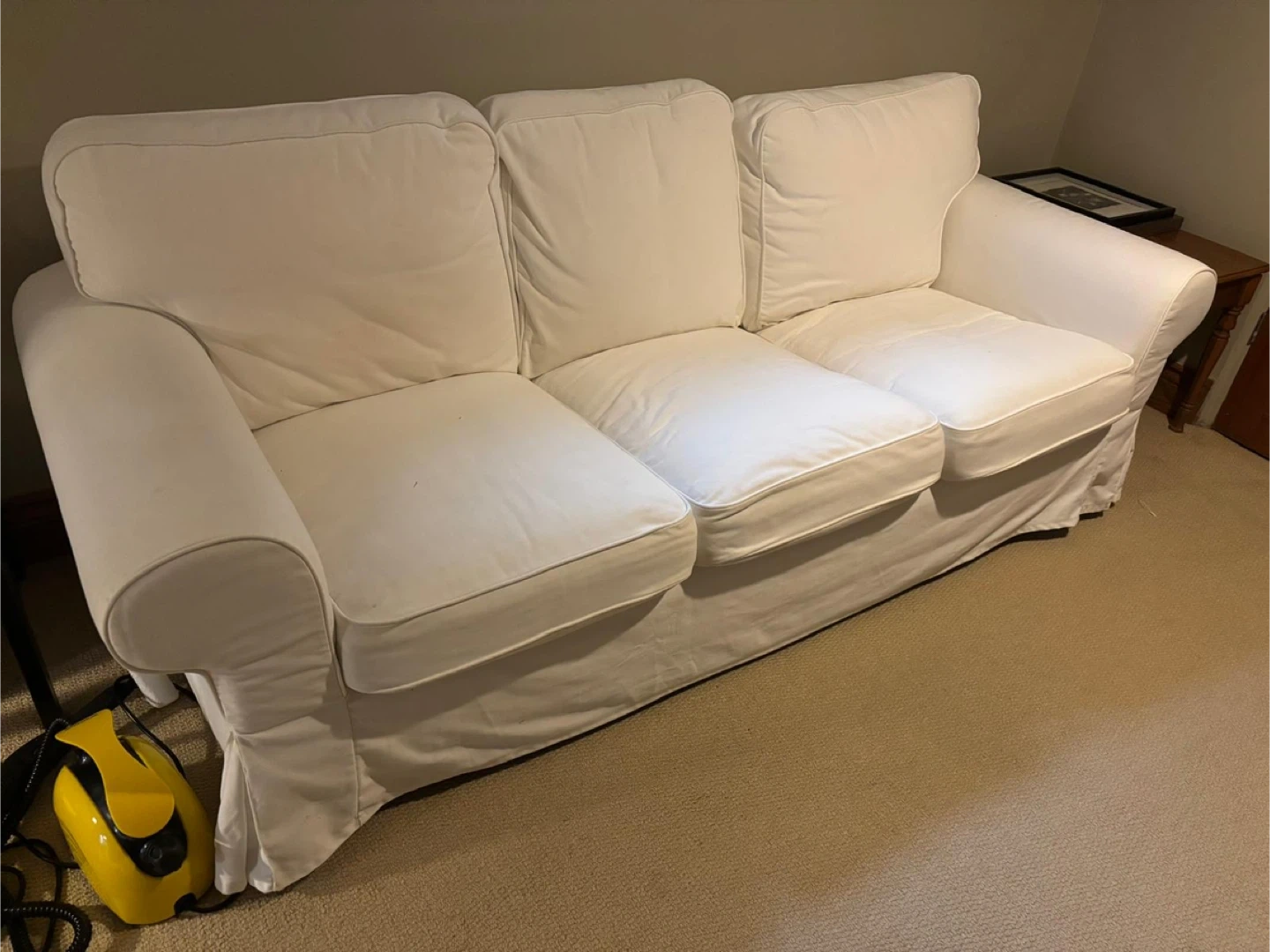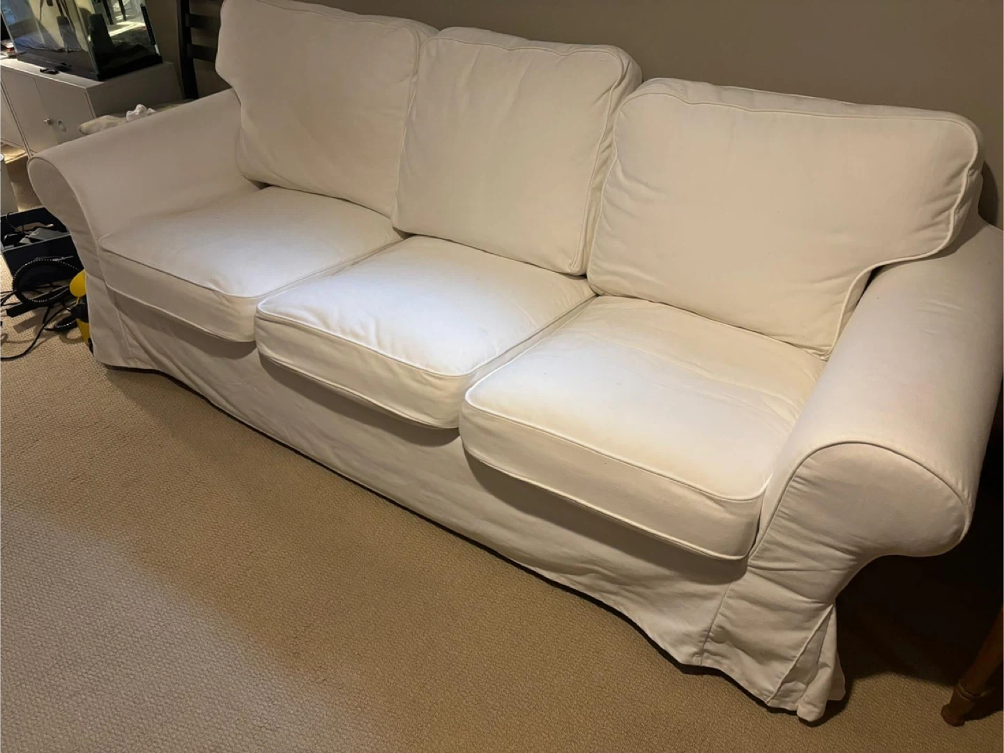 Selling a gently used IKEA Ektorp 3-seat sofa in white. It's in great condition and super comfy for lounging! This sofa features a timeless design and durable construction, perfect for any living space.
