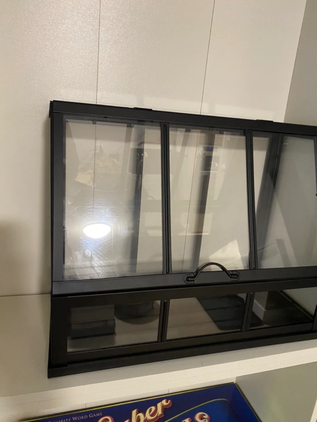 Selling a gently used Ikea Fabrikor glass door cabinet in black. Has a crack in the side glass pane and it is missing one or two screws but is still functional.