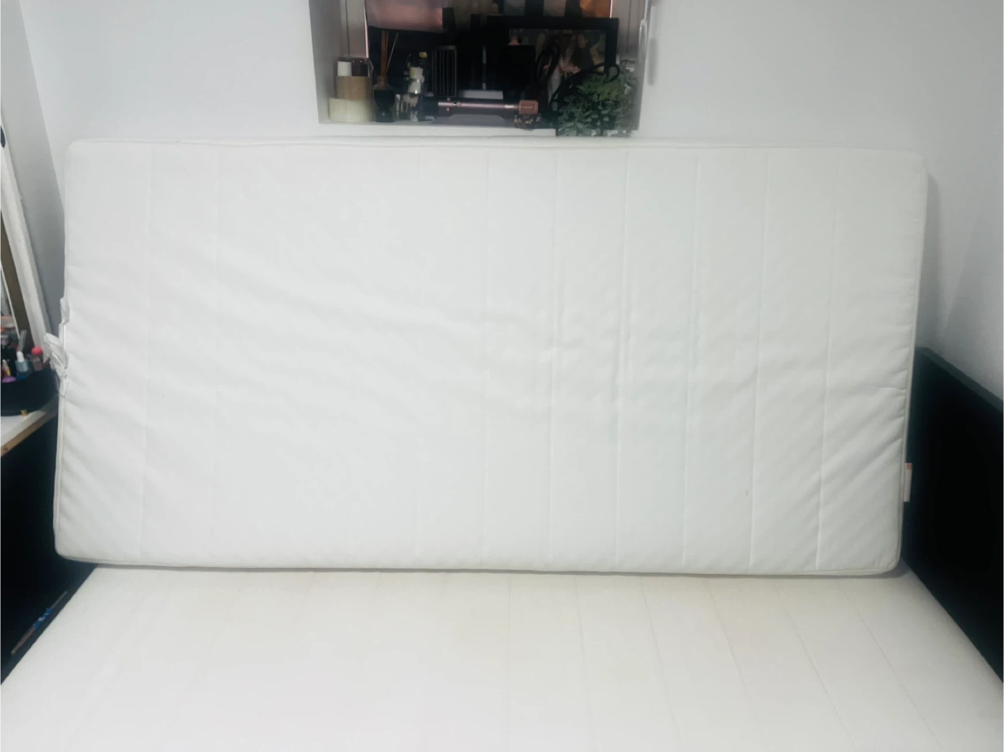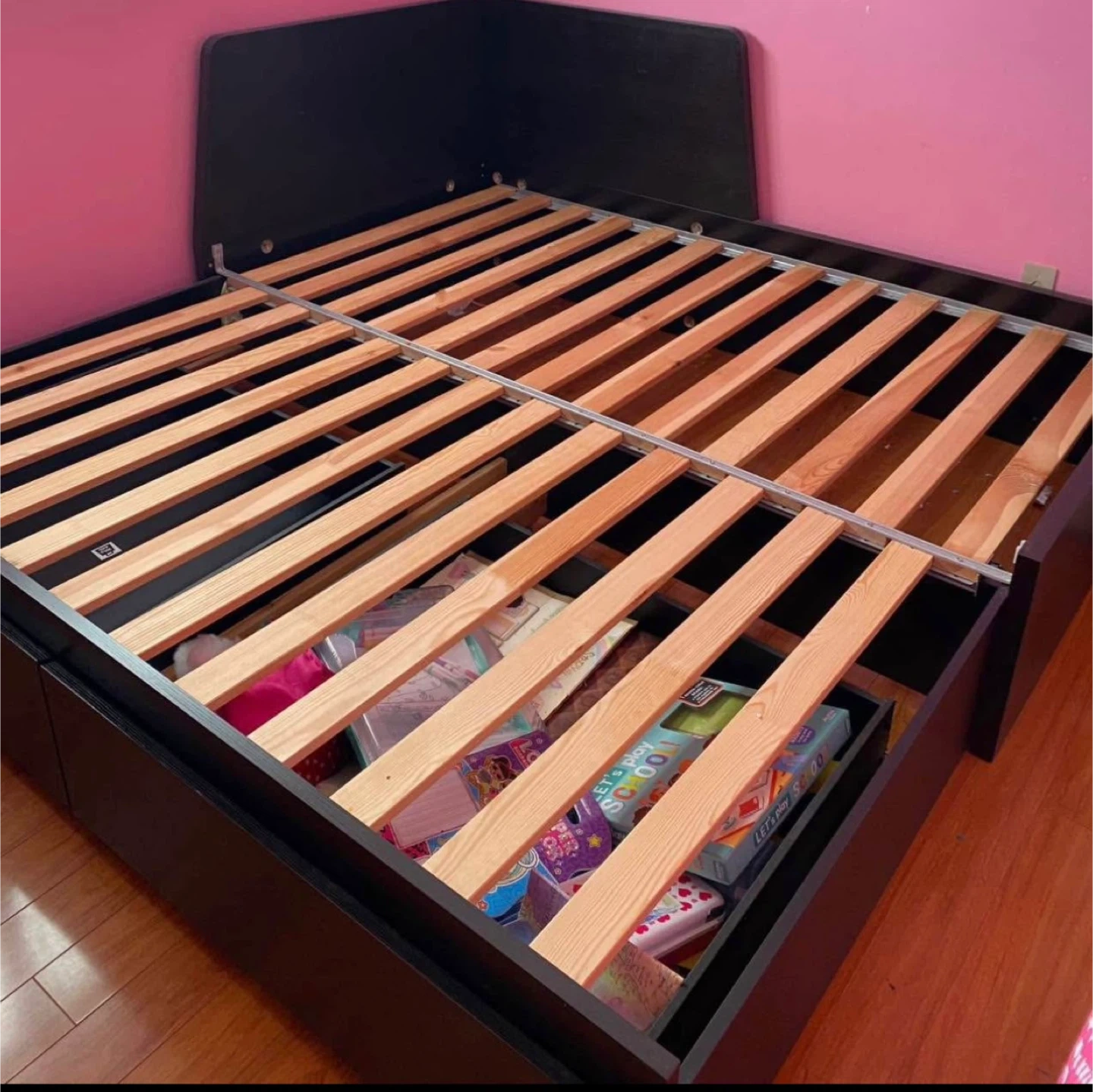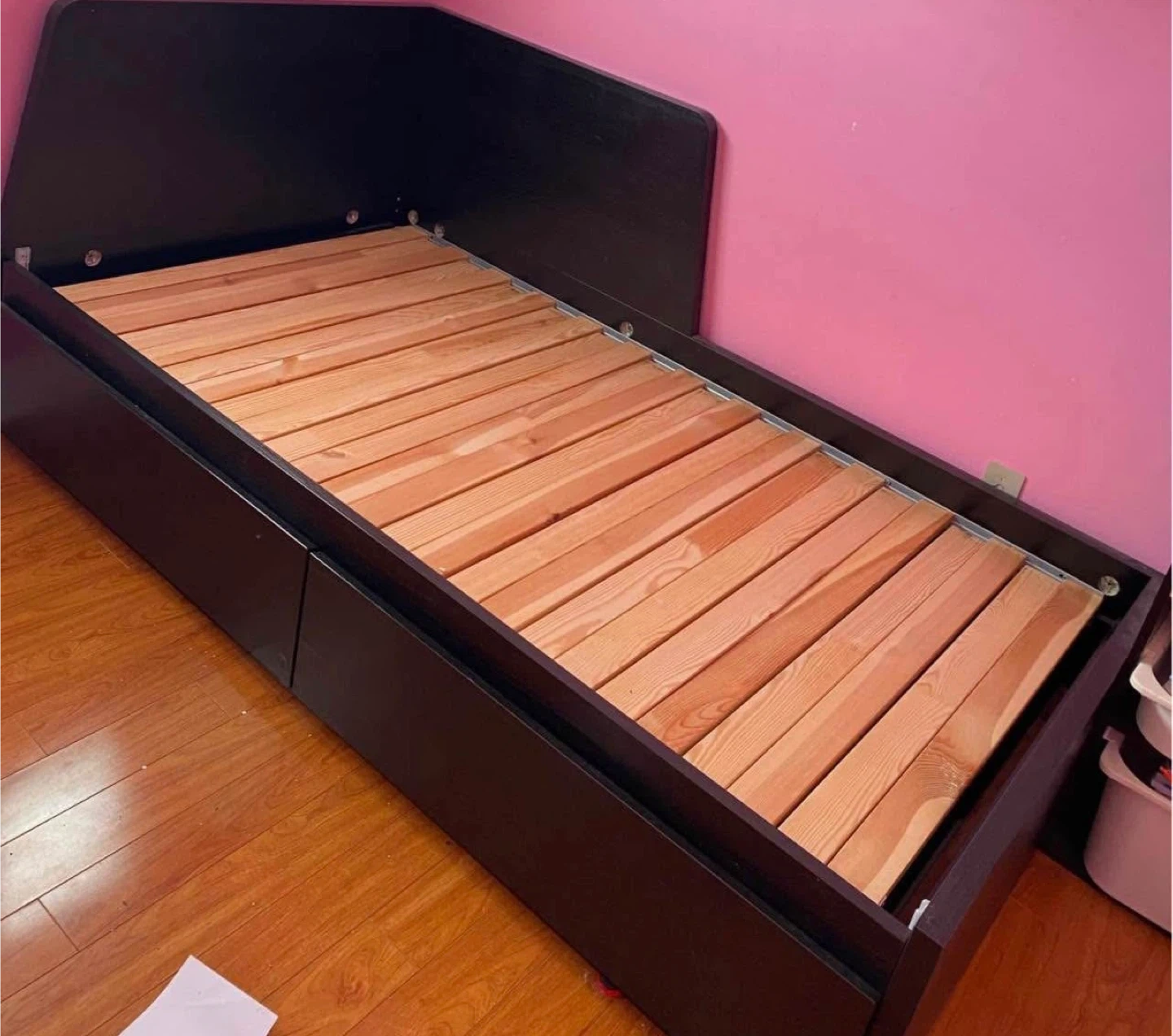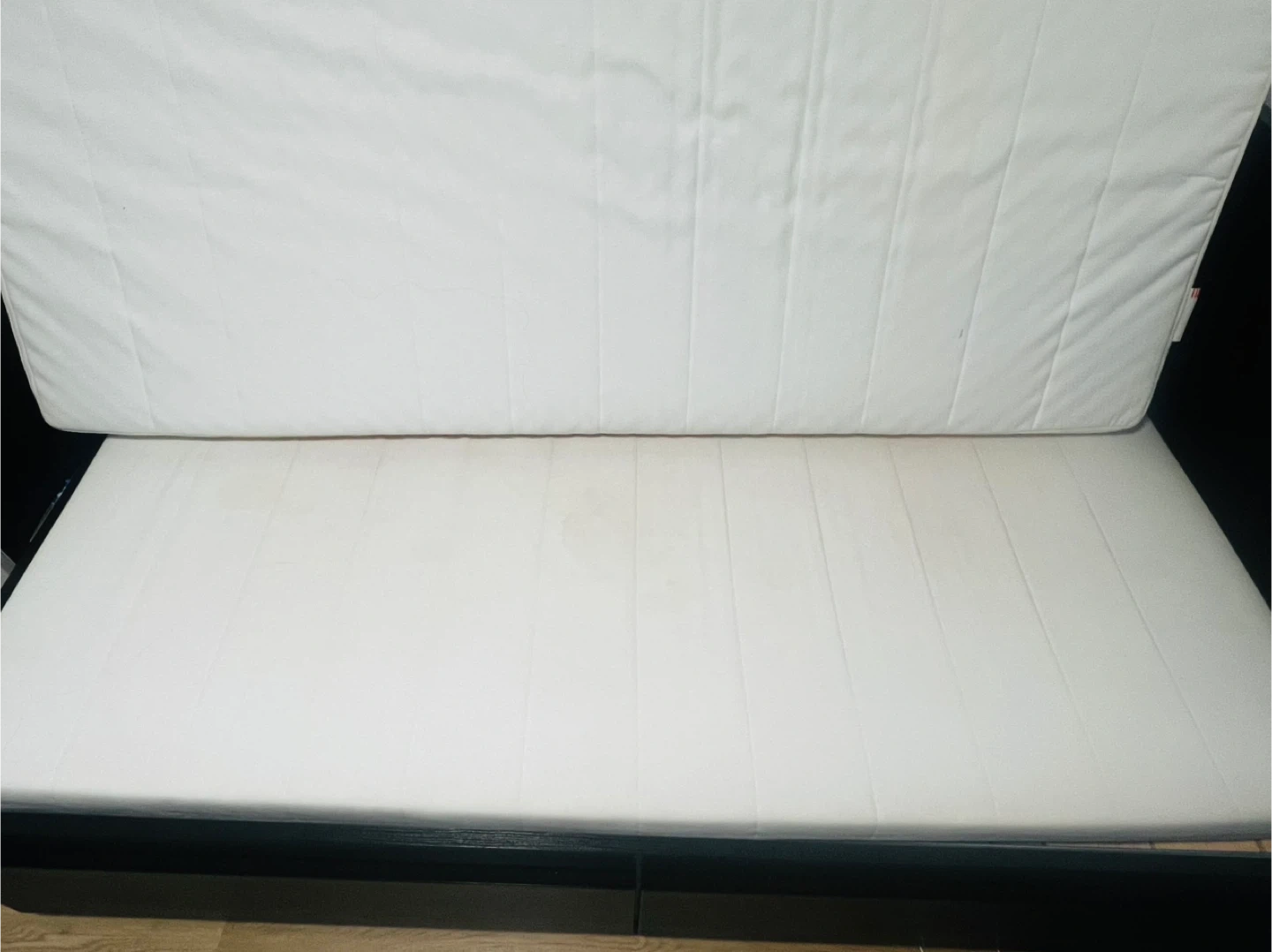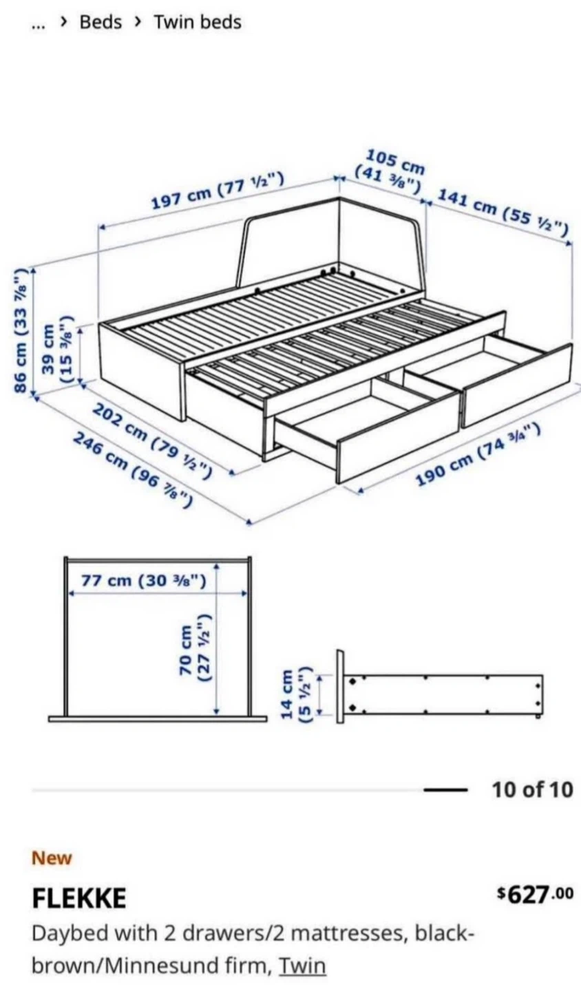 Selling an Ikea Flekke daybed in black-brown, perfect for a guest room or small space! This twin-sized bed comes with two drawers for extra storage Can turn it into a queen bed also. The dimensions are approximately 77 1/2" x 41 3/8" (197 cm x 105 cm). Originally bought for $627