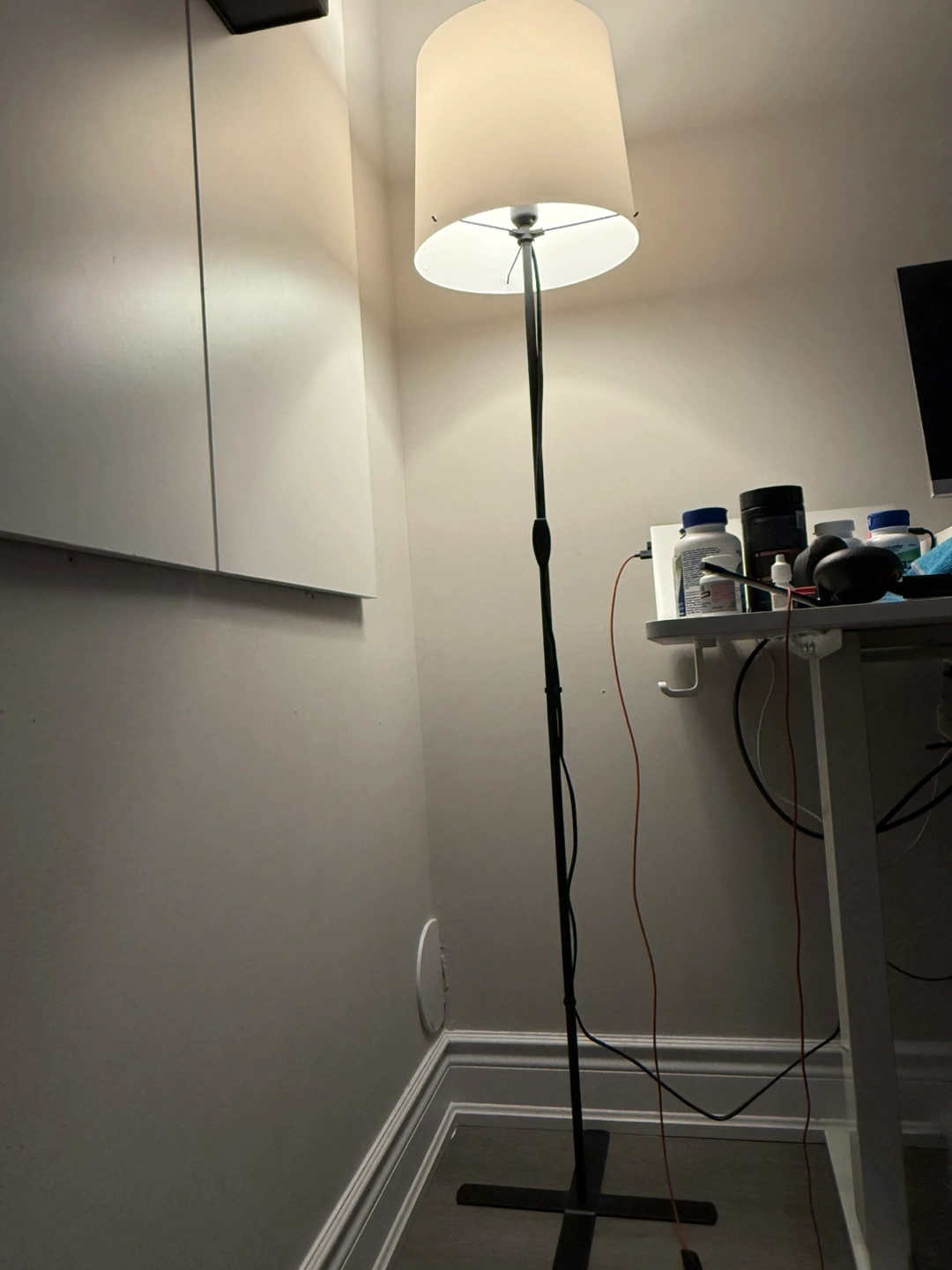 Ikea tall floor lamp. Black metal stand. Off-white fabric shade. Good working condition. Simple design.