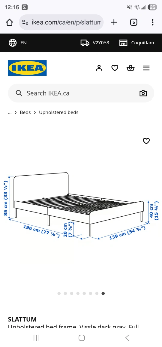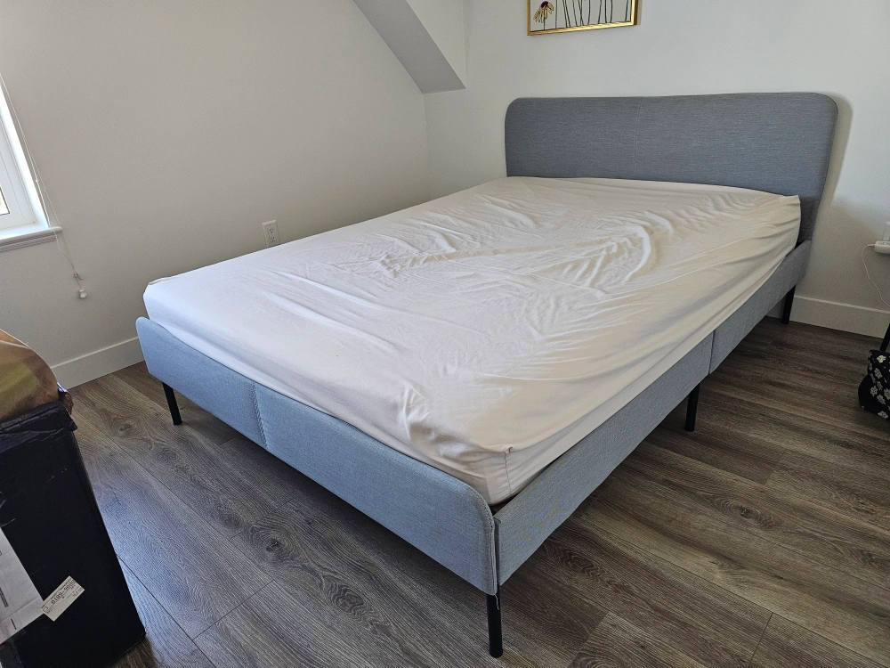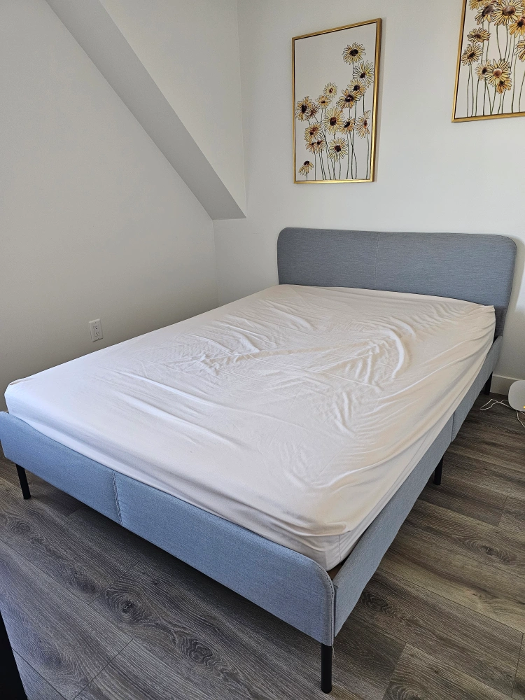 Selling a full-size IKEA SLATTUM bed frame in Vissle dark grey. It's in great shape and ready for a new home! The dimensions are approximately 196 cm (77 1/8") in length and 139 cm (54 3/4") in width. The headboard height is 85 cm (33 3/8") and the height to the base is 40 cm (15 3/4"). Medium firm Mattress with protector .