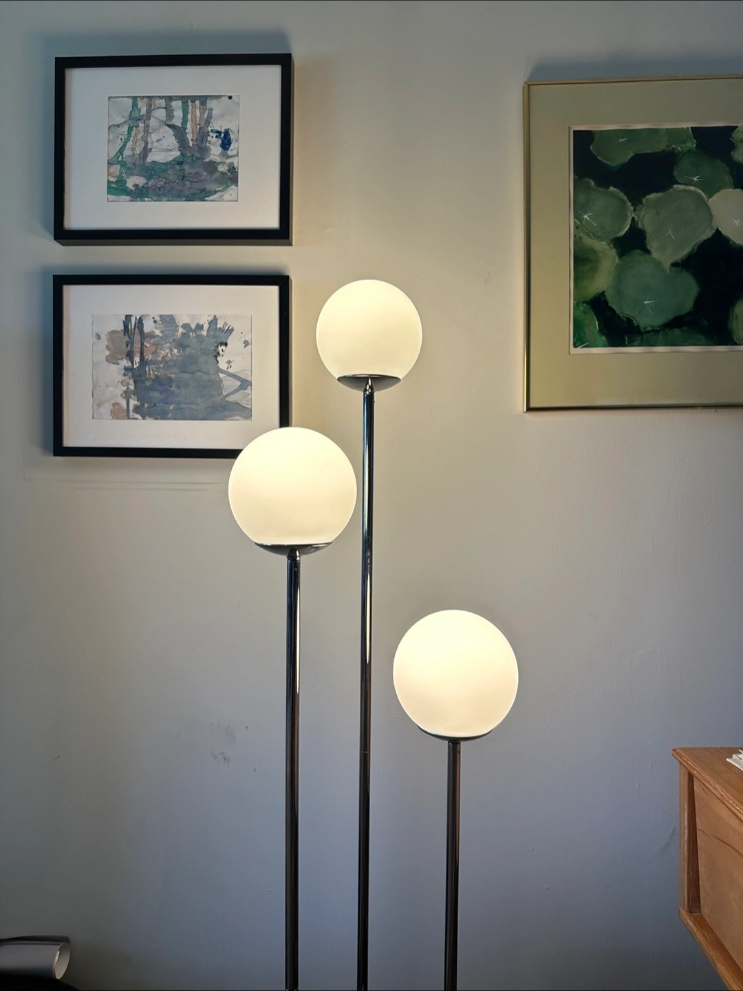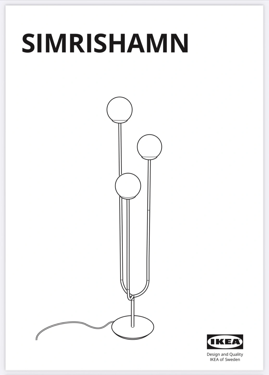 SIMRISHAMN floor lamp - chrome plated finish and opal white shades. Nice cozy glow, barely used. Slight signs of use on base (see photo), otherwise works perfectly. Retails at IKEA for $120 - already assembled and including bulbs, $75.
