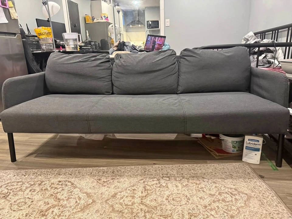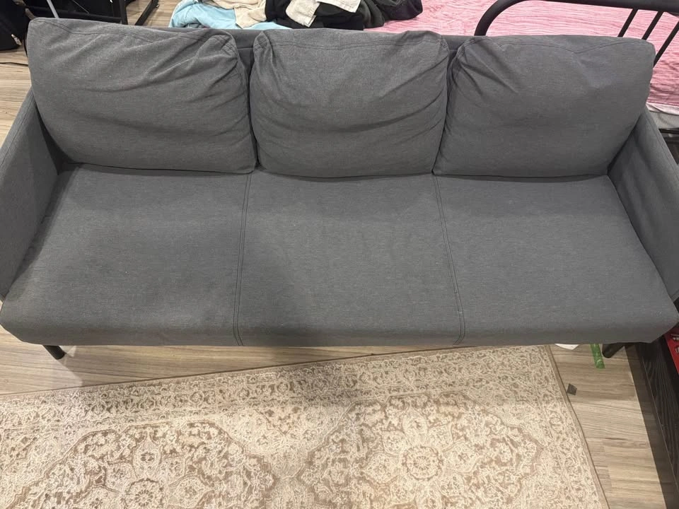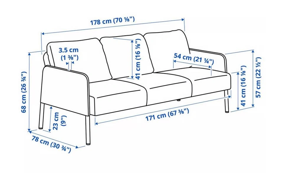 It should be easy to get a sofa and GLOSTAD sofa is easy to buy, bring home, assemble and live with. So you can enjoy more time and space to hang out with friends and family and do other important things. Measurements Armrest height: 57 cm (22 1/2 ") Armrest width: 3.5 cm (1 3/8 ") Depth: 78 cm (30 3/4 ") Height under furniture: 23 cm (9 ") Backrest height: 68 cm (26 3/4 ") Seat height: 41 cm (16 1/8 ") Seat width: 164 cm (64 5/8 ") Width: 171 cm (67 3/8 ") Used for 2 months No Stains