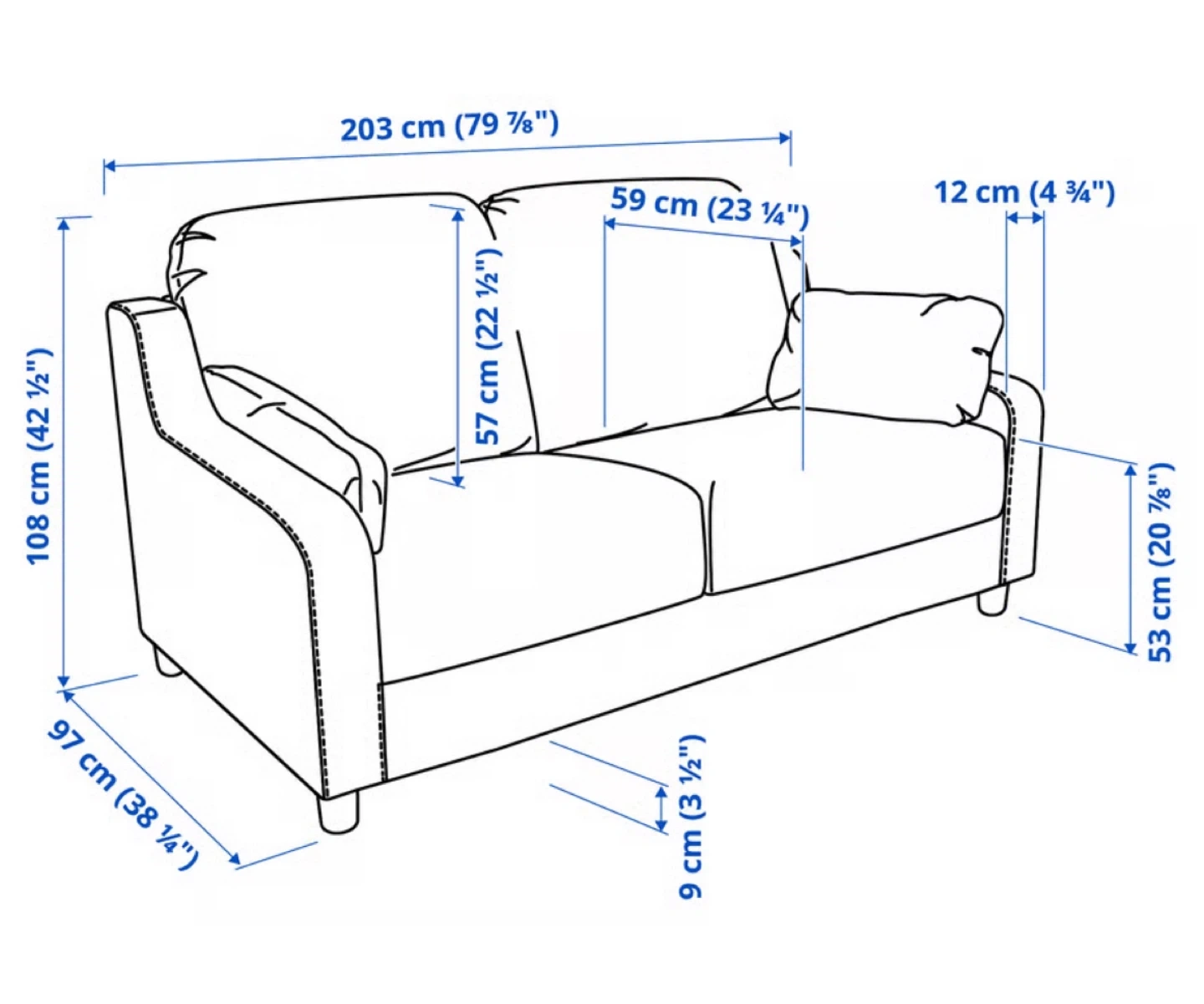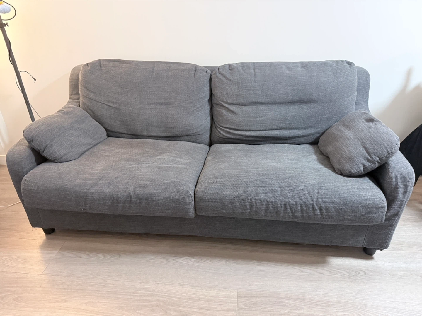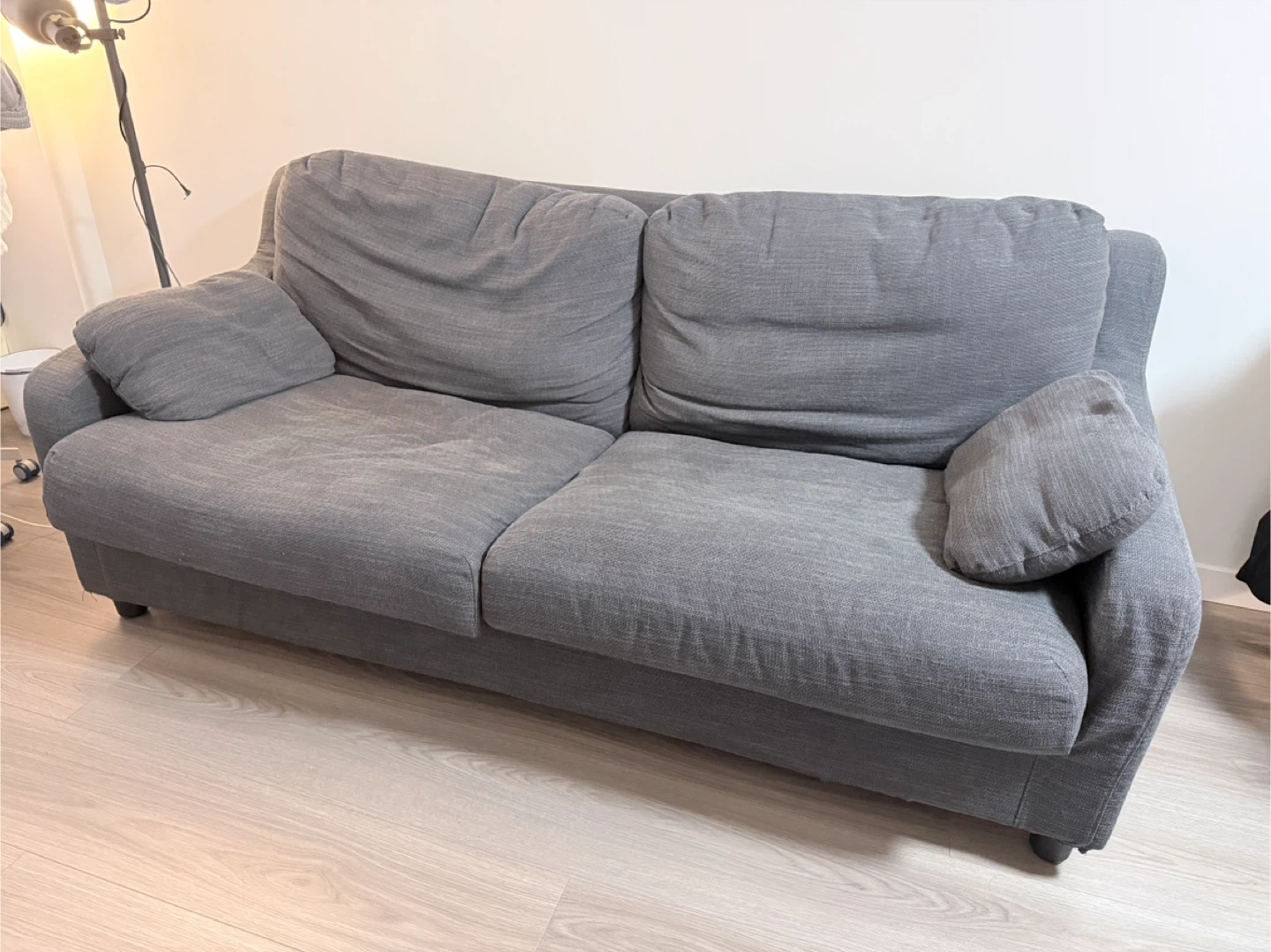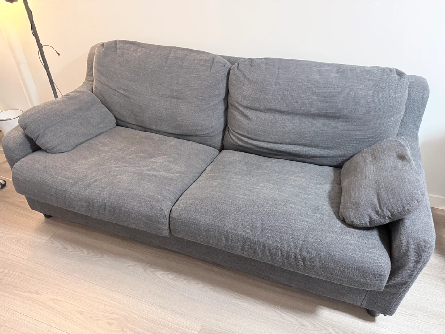 Selling a comfy grey sofa that's perfect for any living room! It comes with the pillows shown in the pictures. The sofa is in good condition and ready for a new home. Dimensions are approximately 79 inches wide, 42 1/2 inches tall, and 38 1/4 inches deep