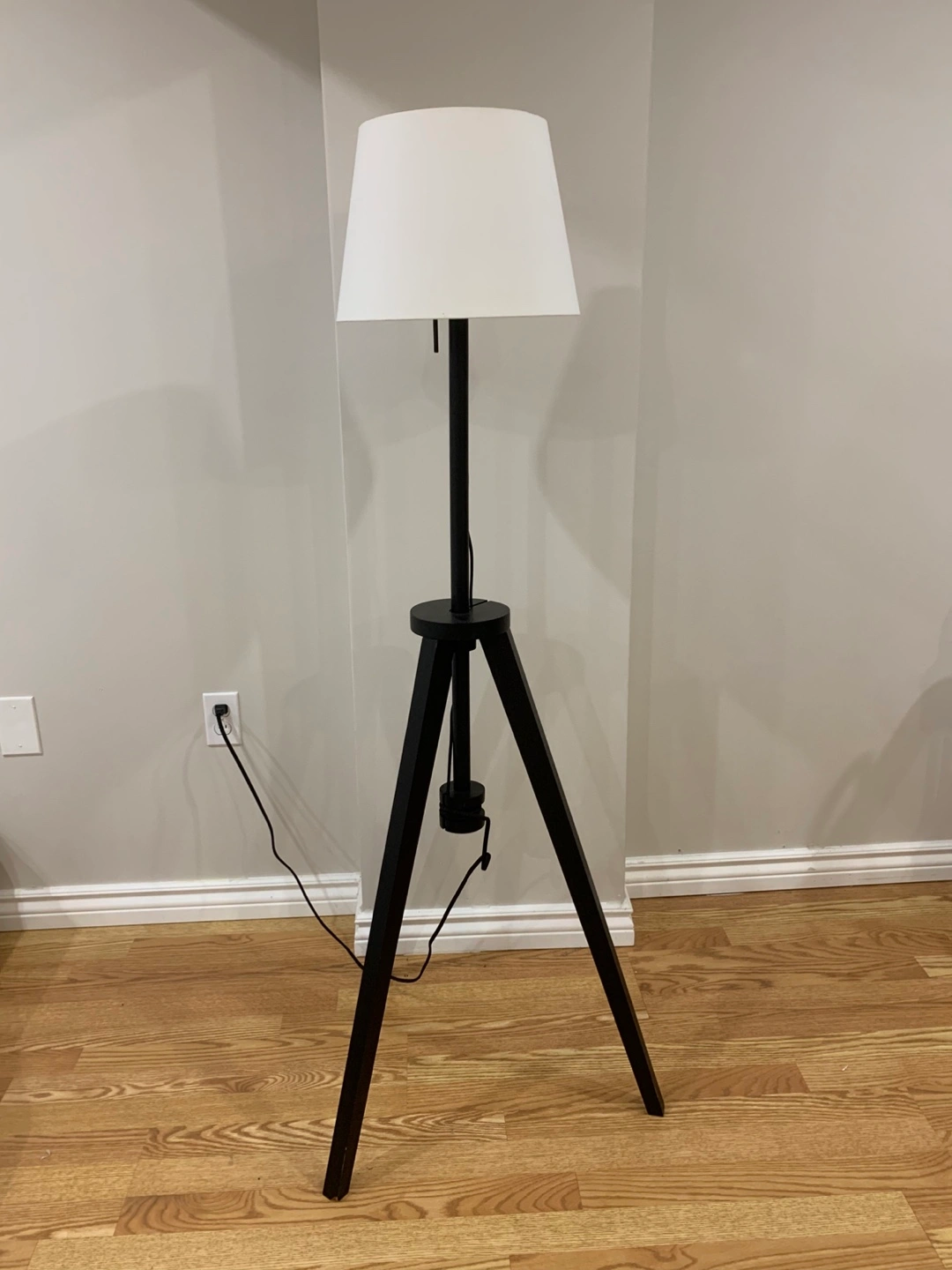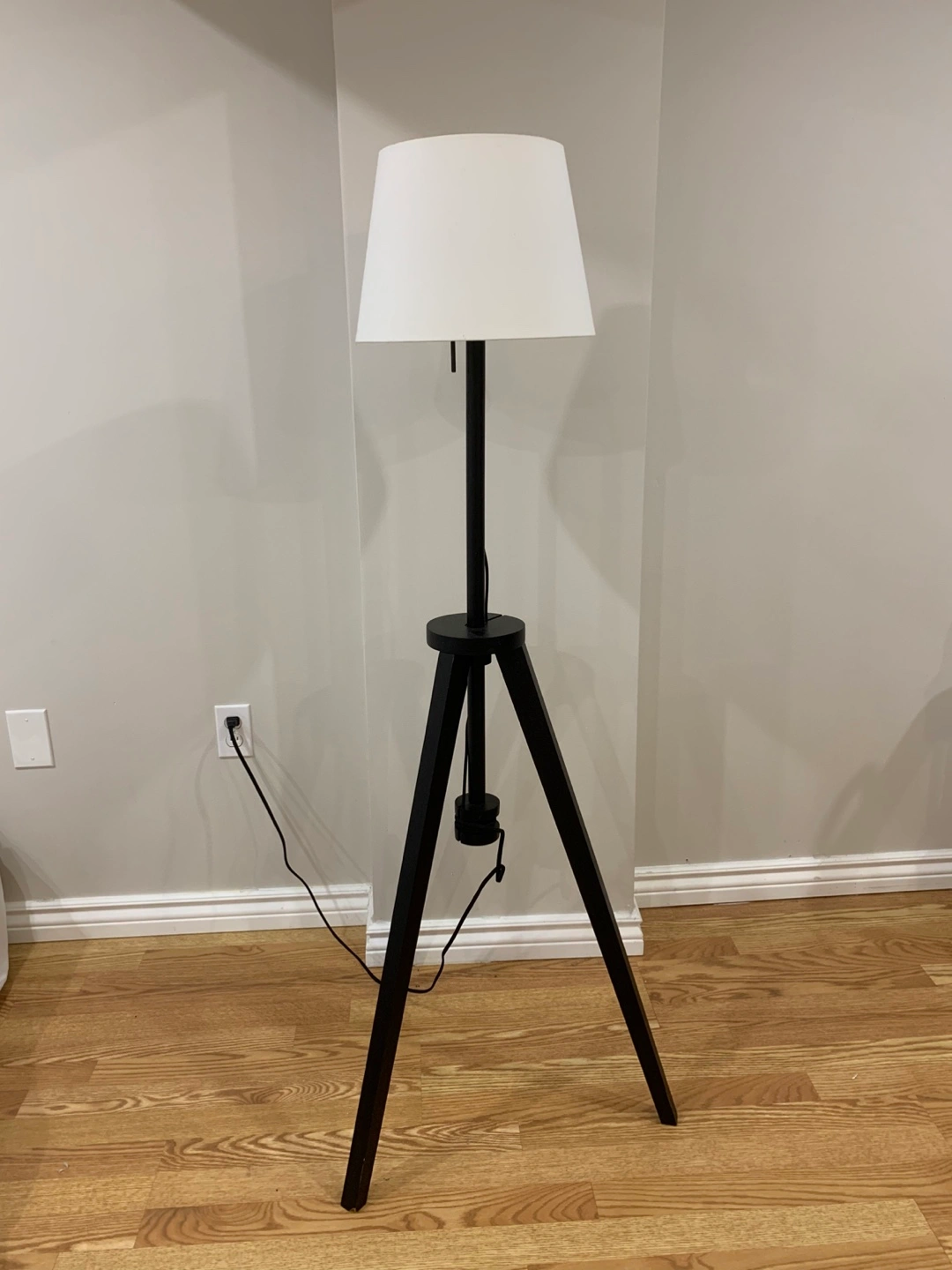 Selling a gently used Ikea HEKTAR floor lamp! This stylish lamp features a classic design with a tripod base, perfect for adding a touch of modern elegance to any room. It provides a warm and inviting light, making it ideal for living rooms, bedrooms, or home offices