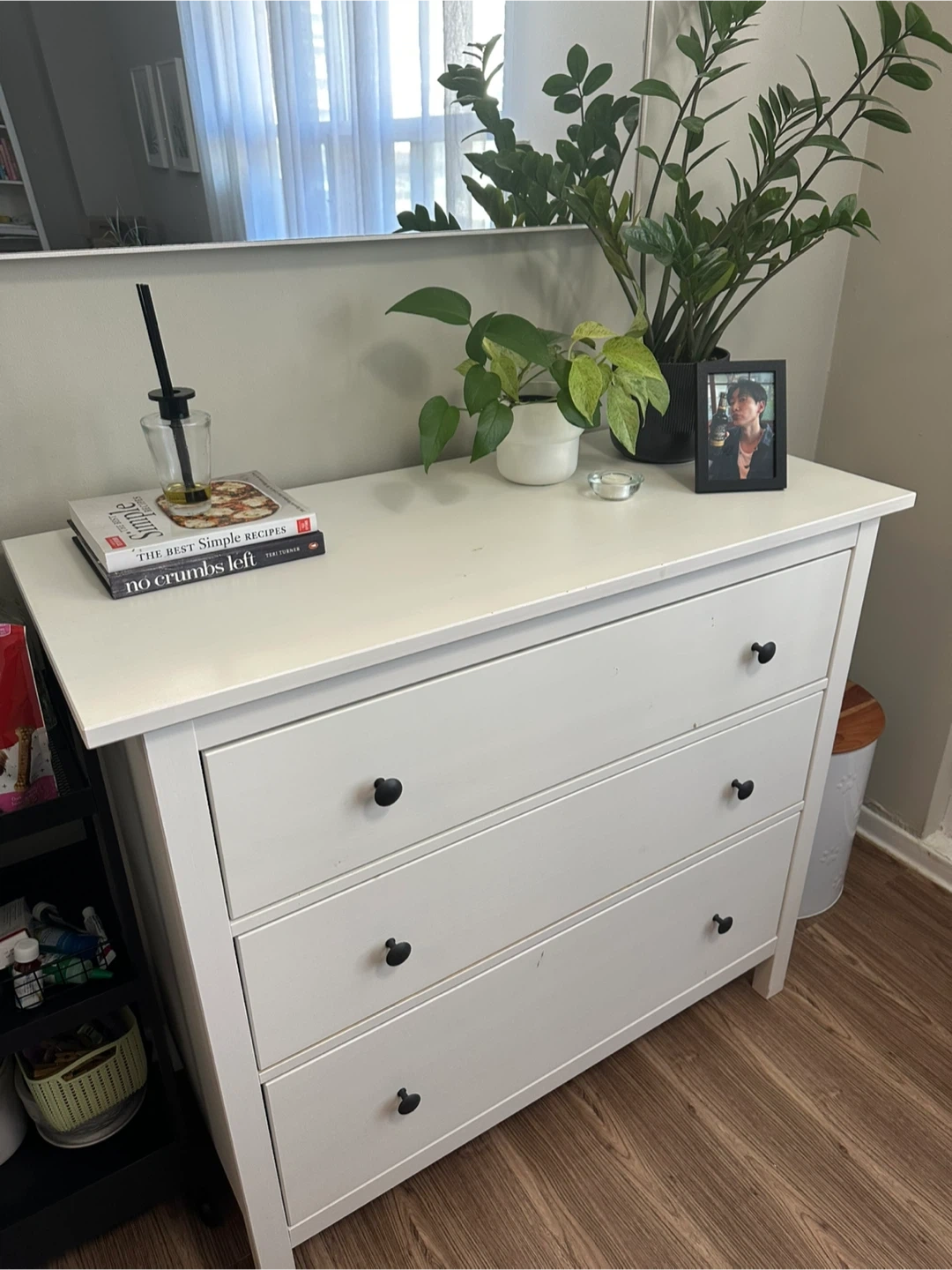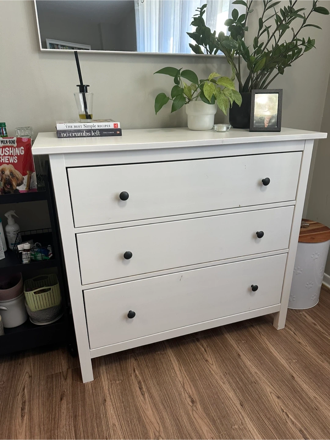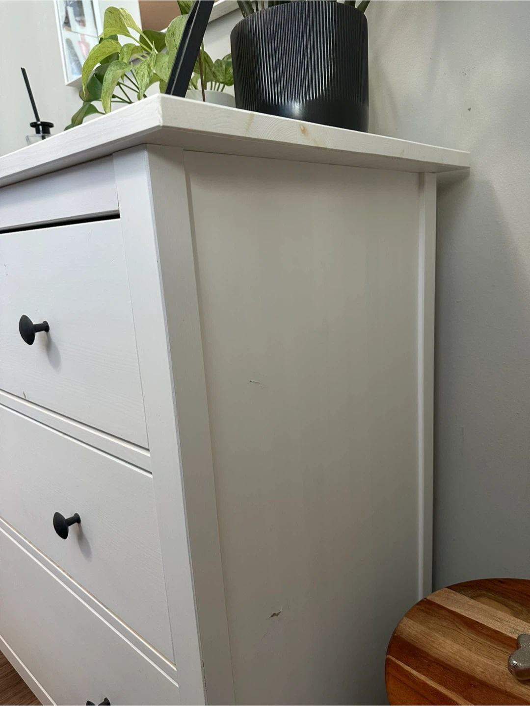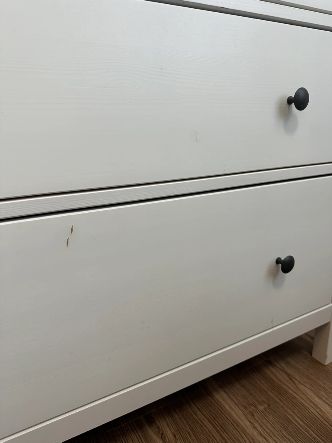 Selling a white IKEA Hemnes 3-drawer dresser. It's in good condition, perfect for adding some extra storage to your bedroom or living space. There are some signs of use (the white paint is peeling off in some locations), as shown in the photos. It's a great, sturdy piece of furniture. The drawers are working well, and it’s still perfectly functional. πŸ‘πŸ» Size: 107 x 49 x 95 (H) cm Brand: IKEA Model: HEMNES Not available for sale at IKEA anymore.